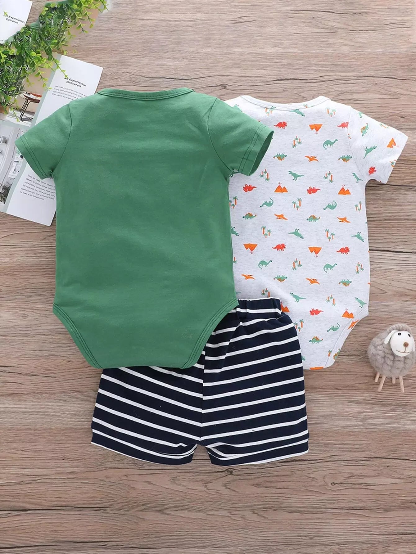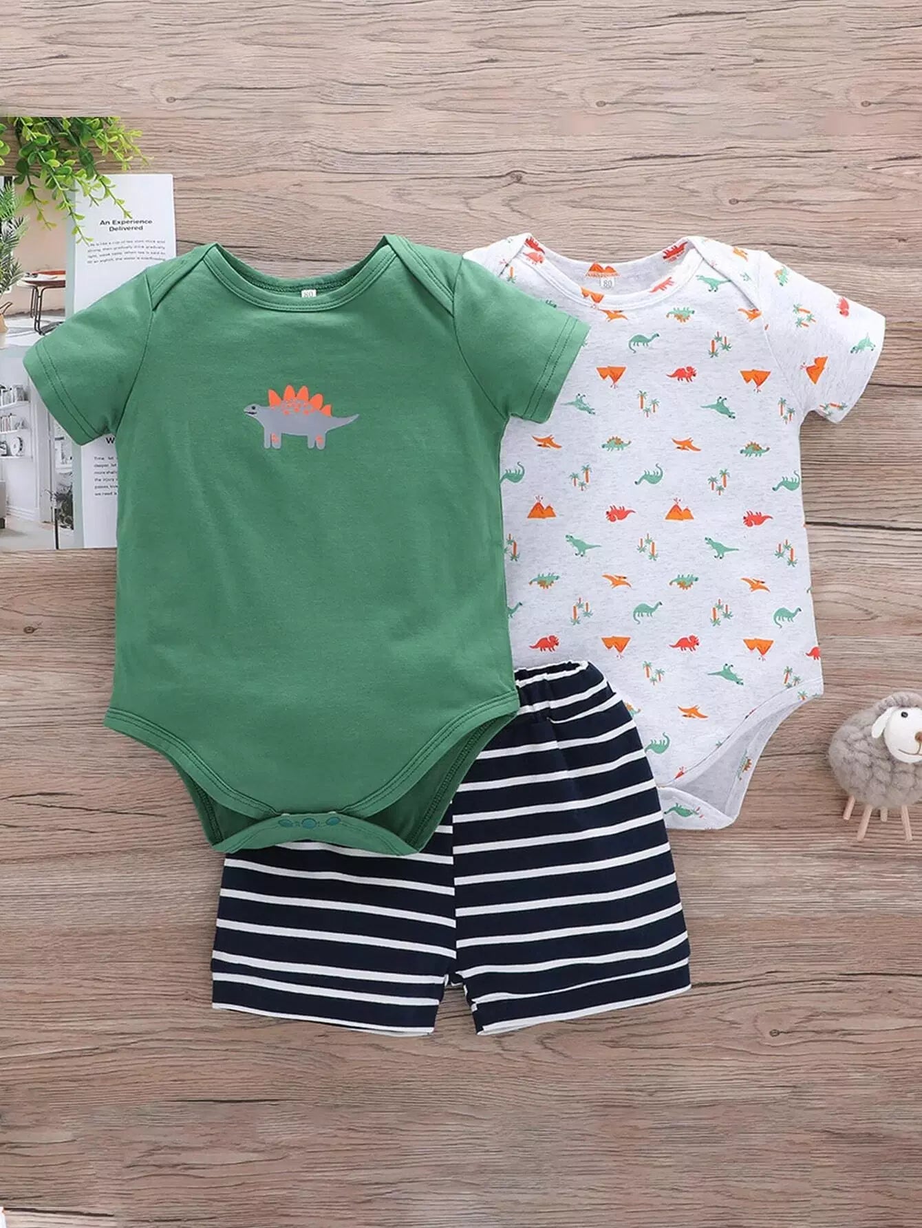 طفل رضيع 3 قطع لباس قطعة واحدة بطبعة ديناصور كرتوني وديناصور مخطط وشورت