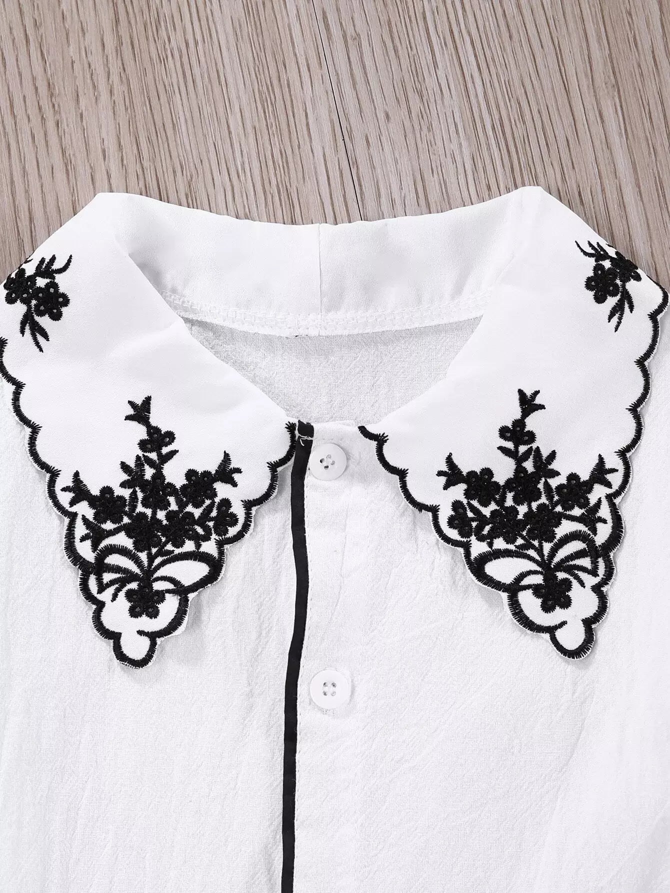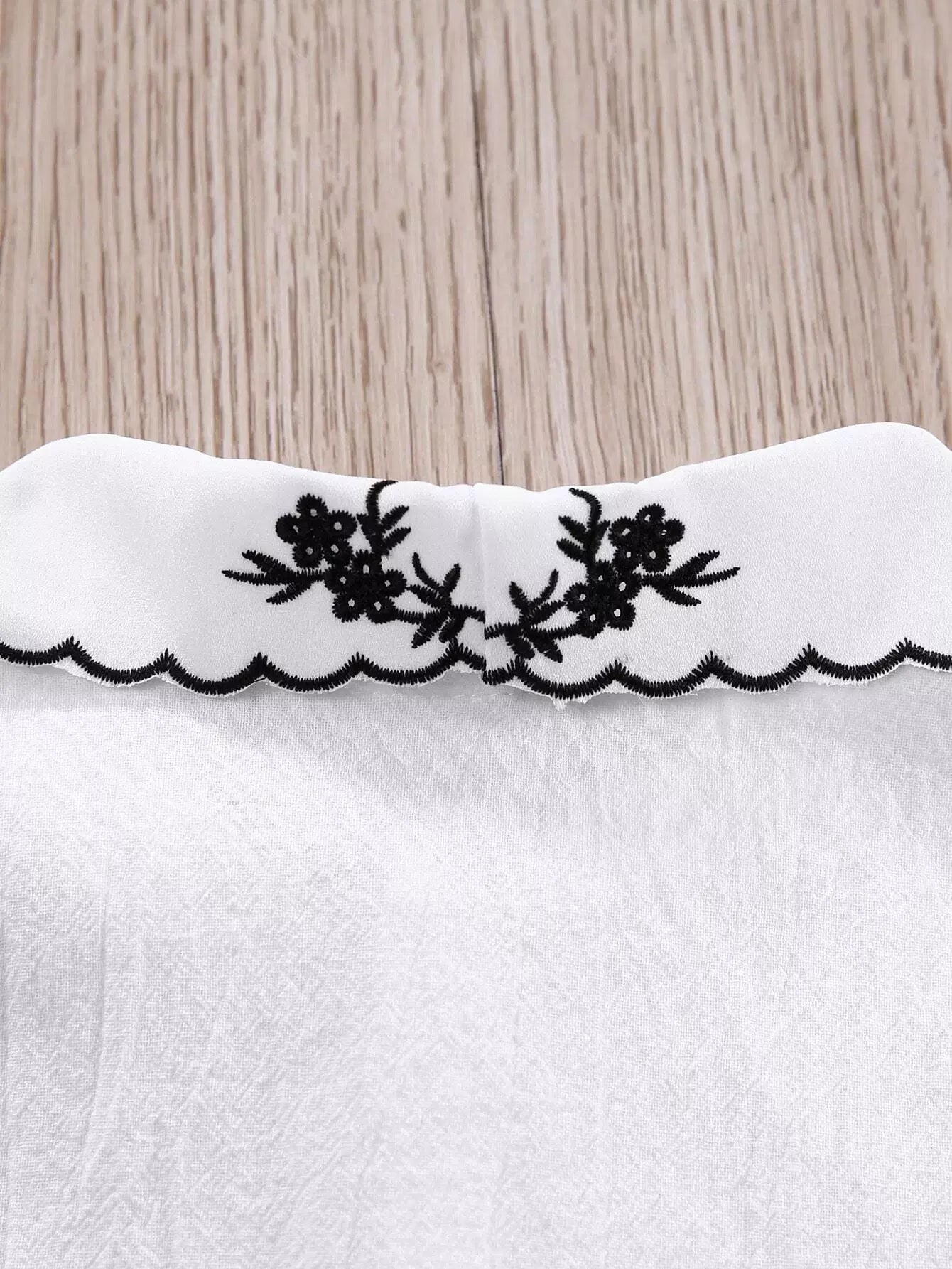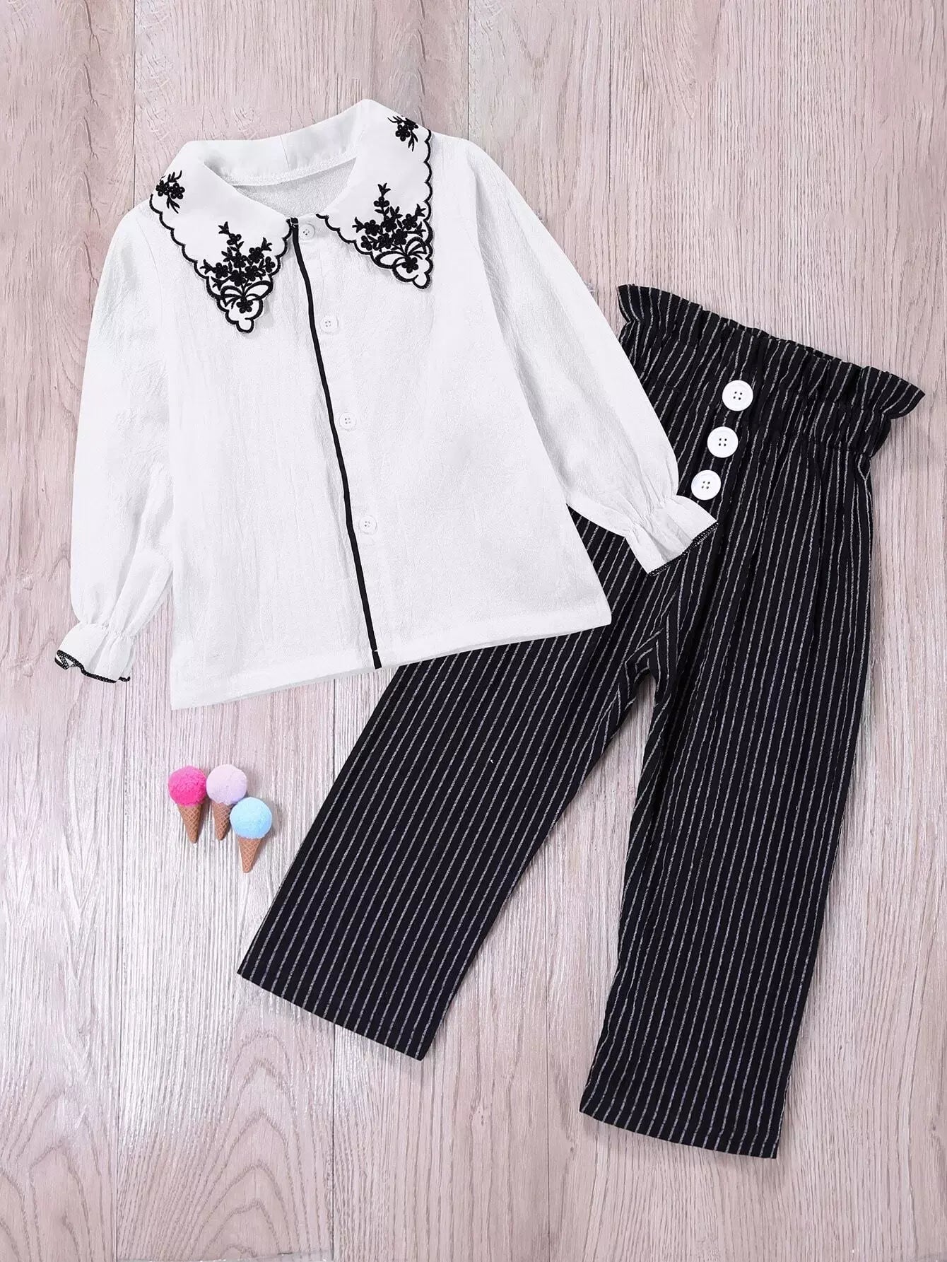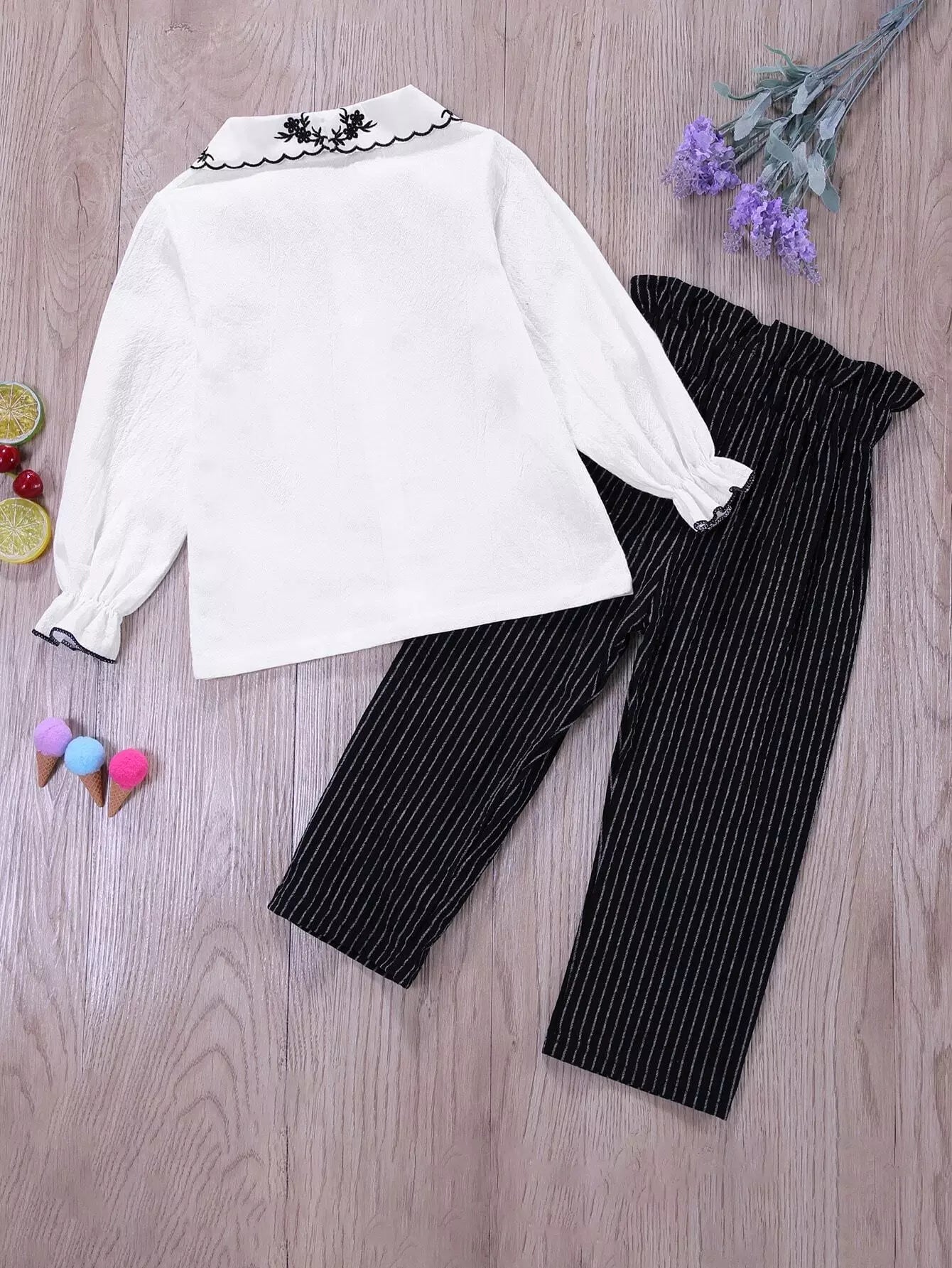 طفل صغير - بلوزة مطرزة بالزهور للفتيات الصغيرات وسروال خصر مخطط على شكل حقيبة ورقية