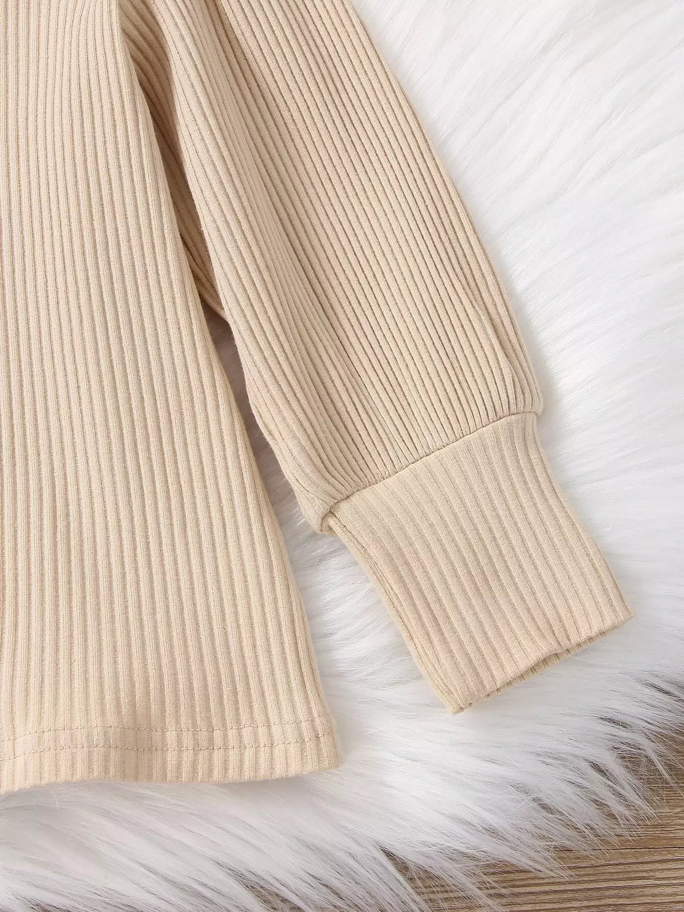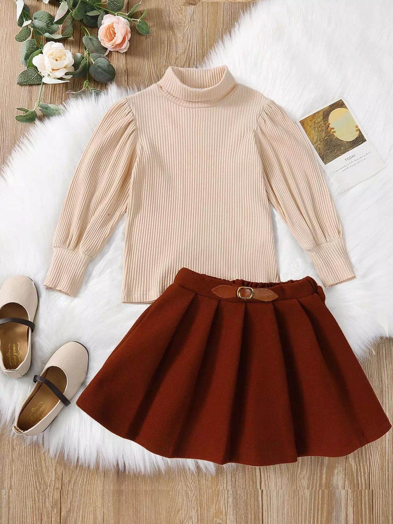 بلوزة بأكمام فانوسية بياقة مدورة للبنات الصغار وتنورة بطيات مطوية بإبزيم