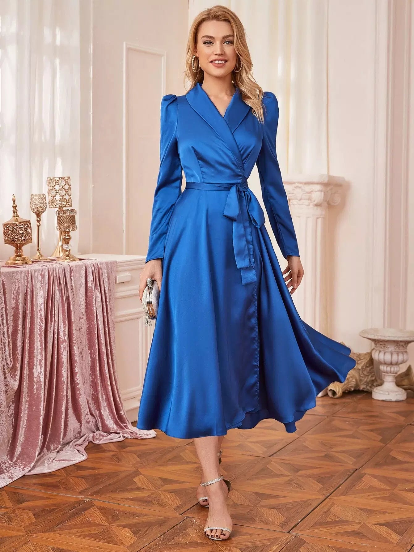 للنساء - فستان من الساتان بياقة شال وأكمام كبيرة وحزام