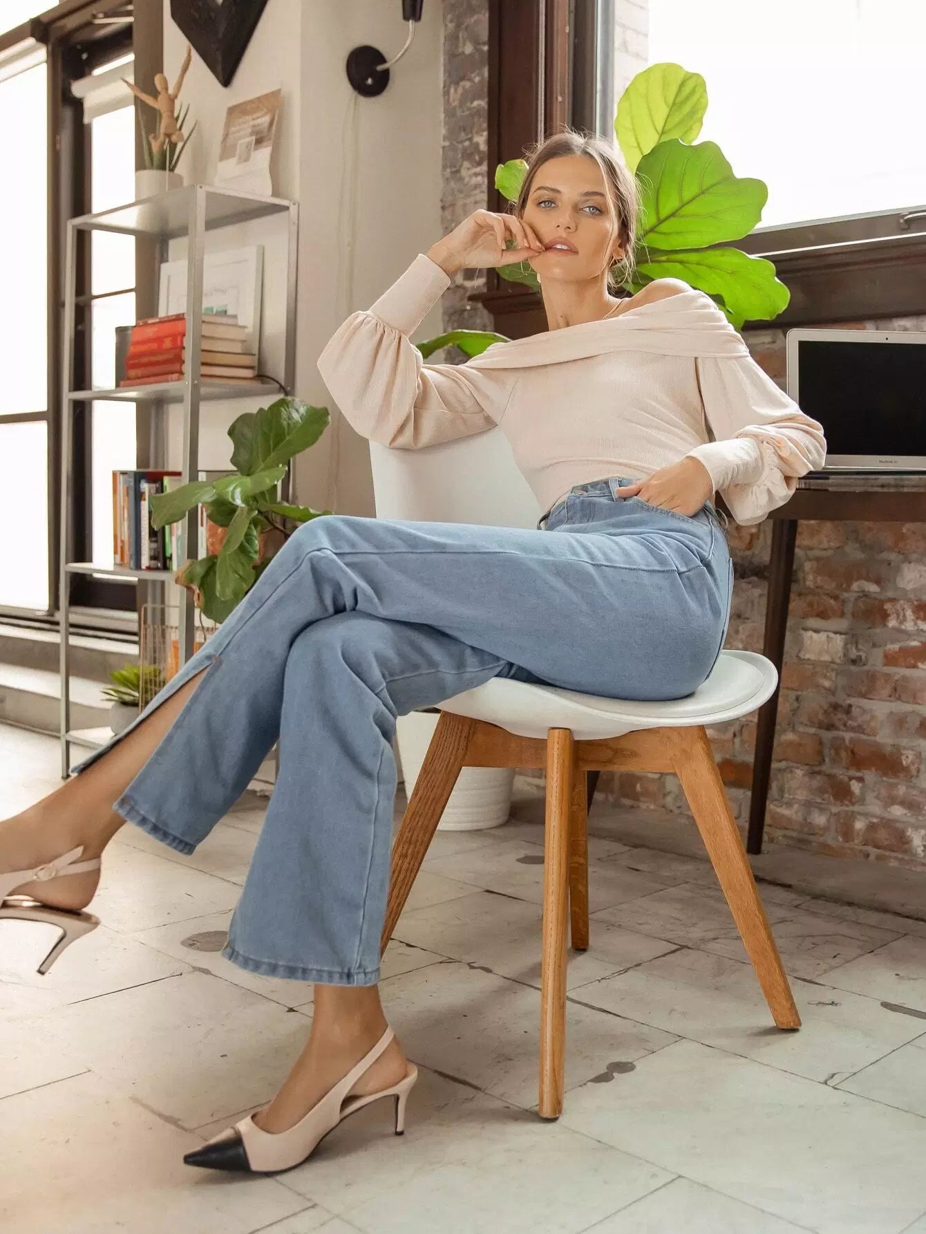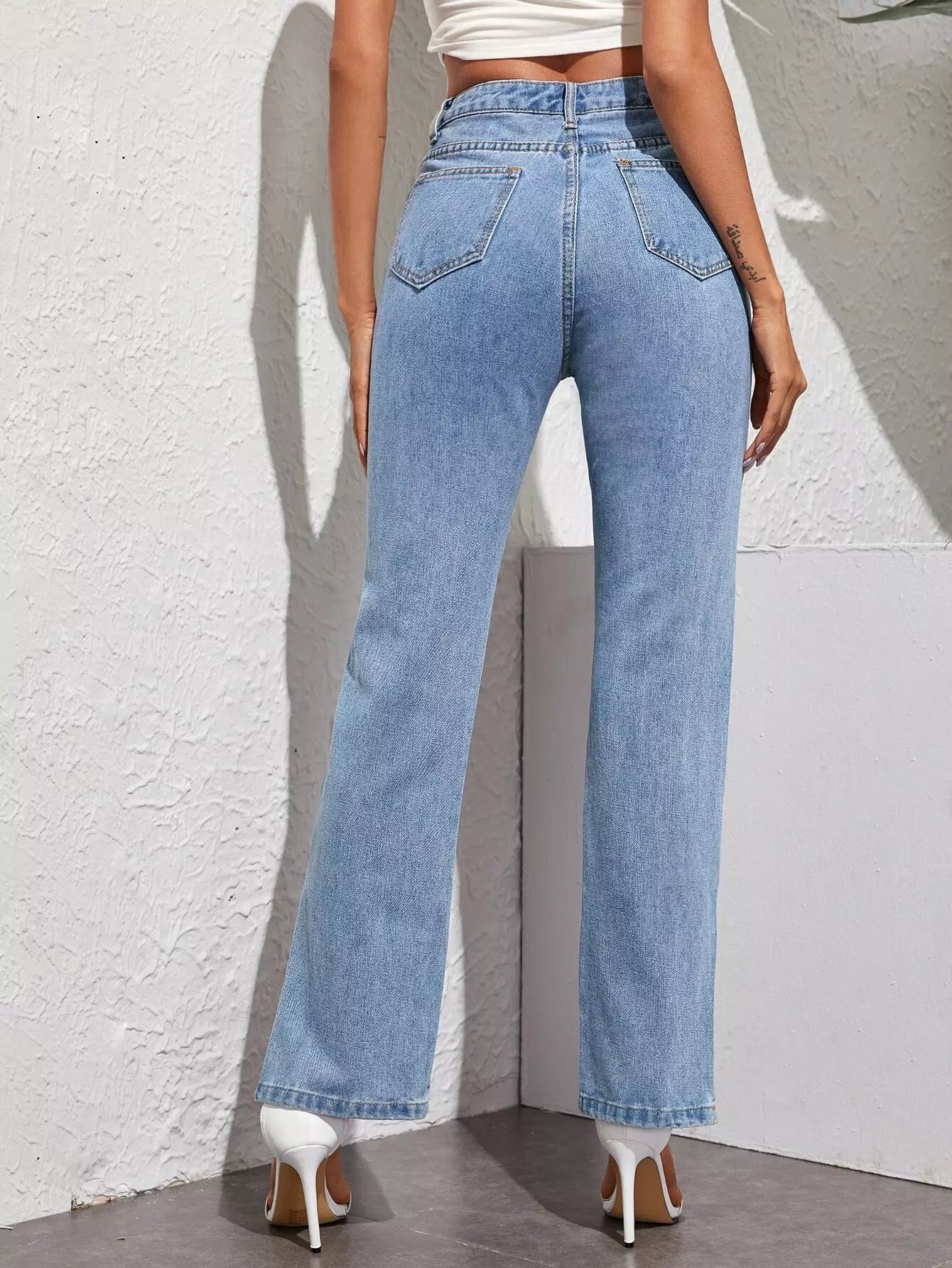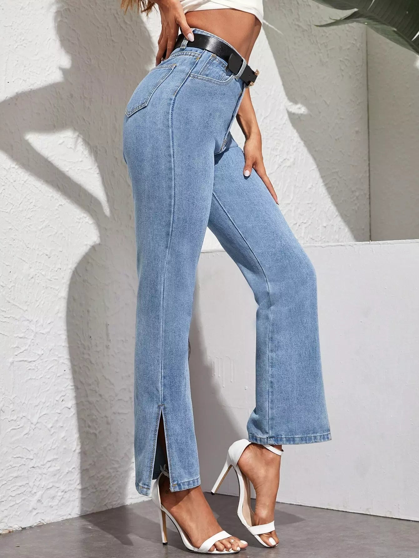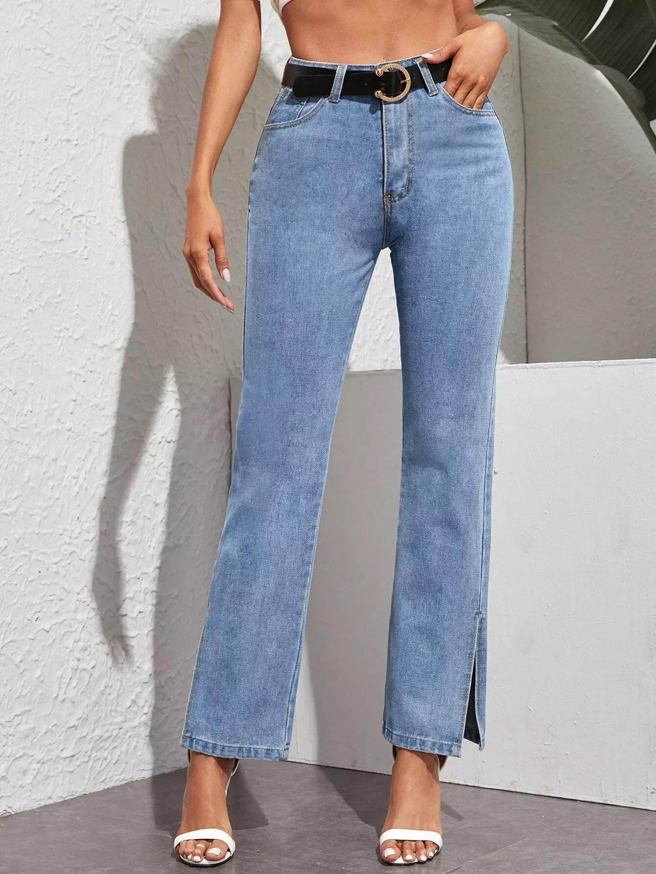 بنطلون جينز بحافة مشقوقة بساق مستقيمة بدون حزام