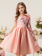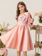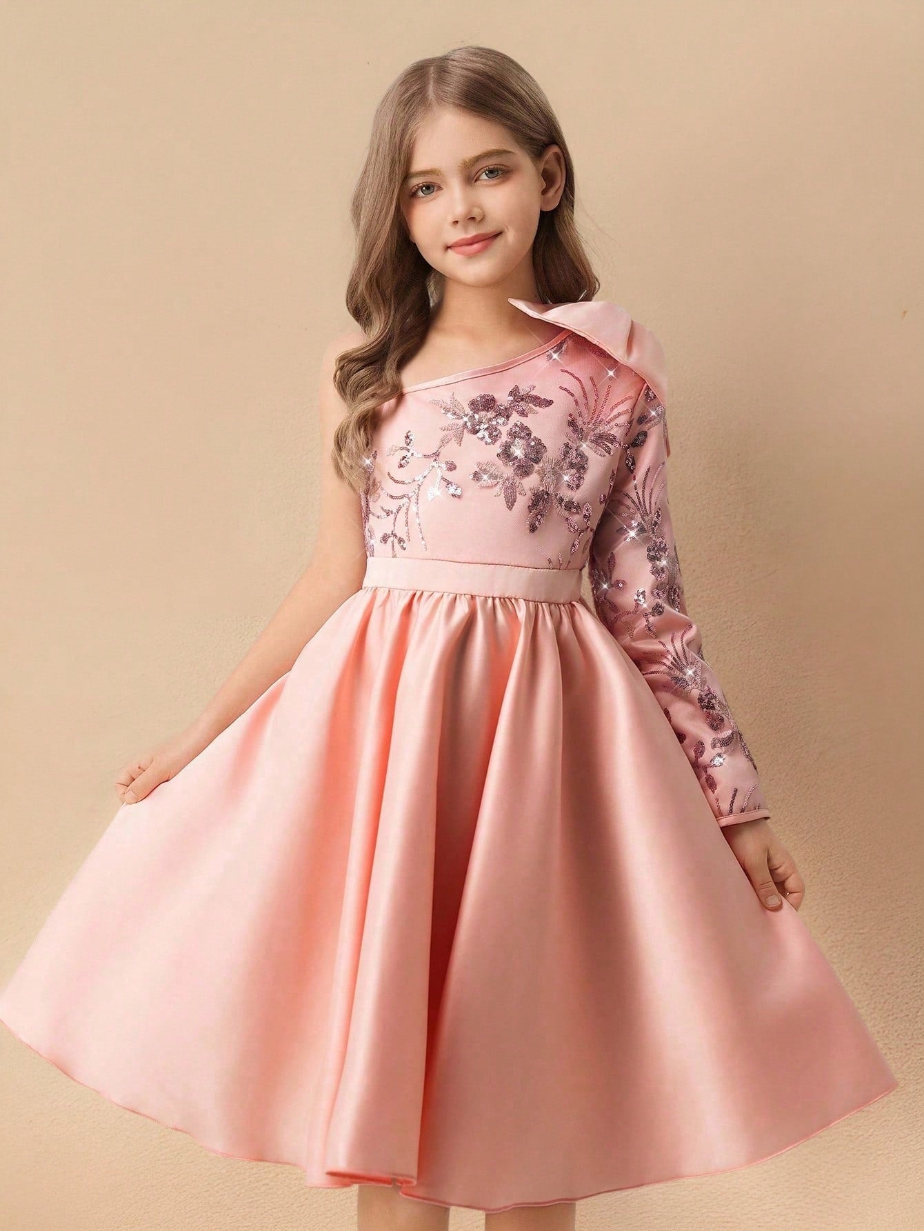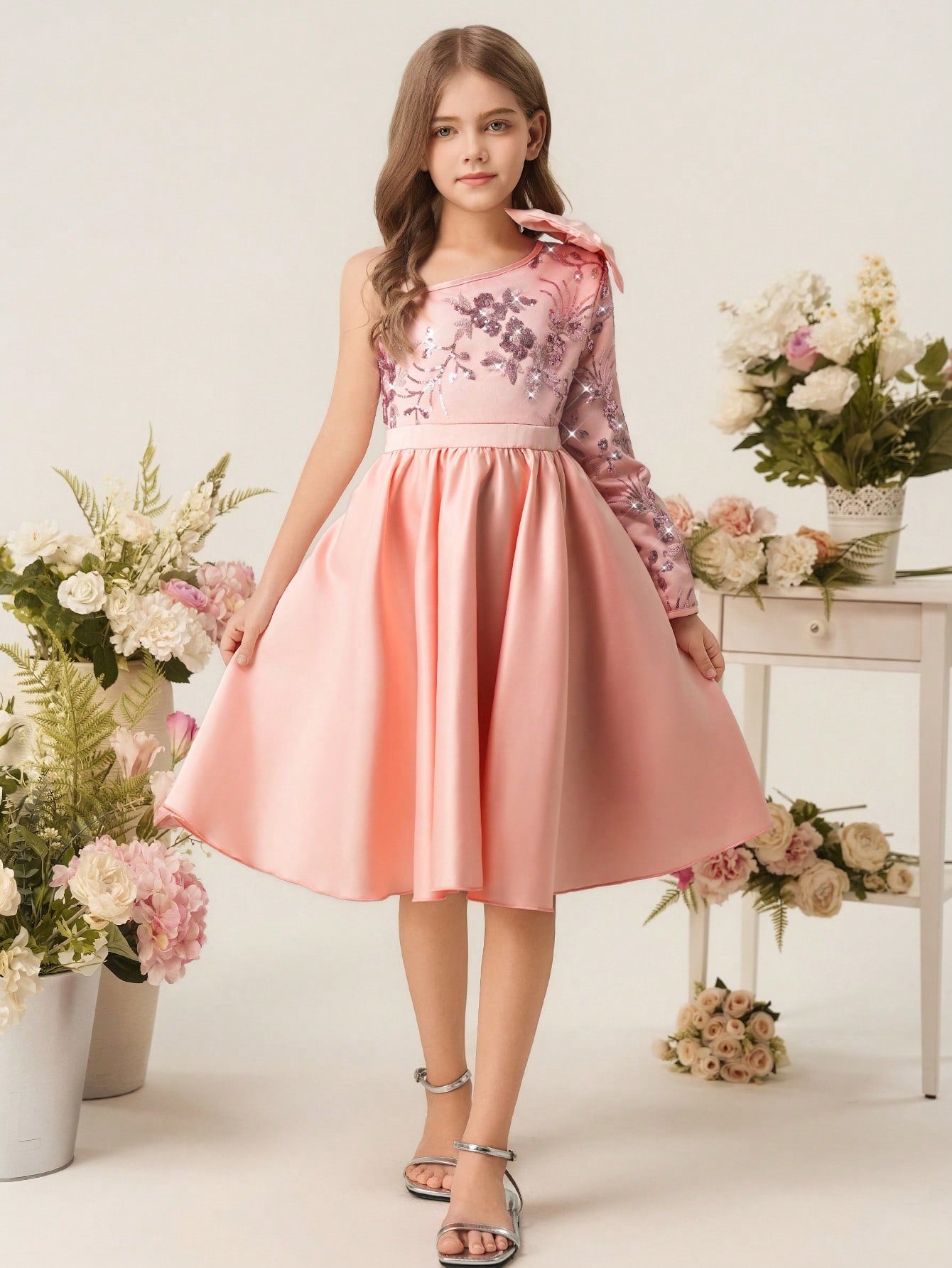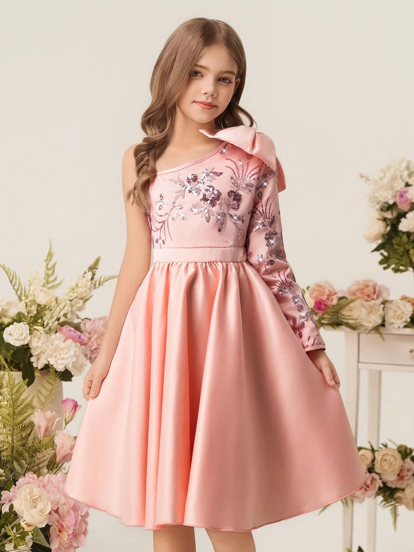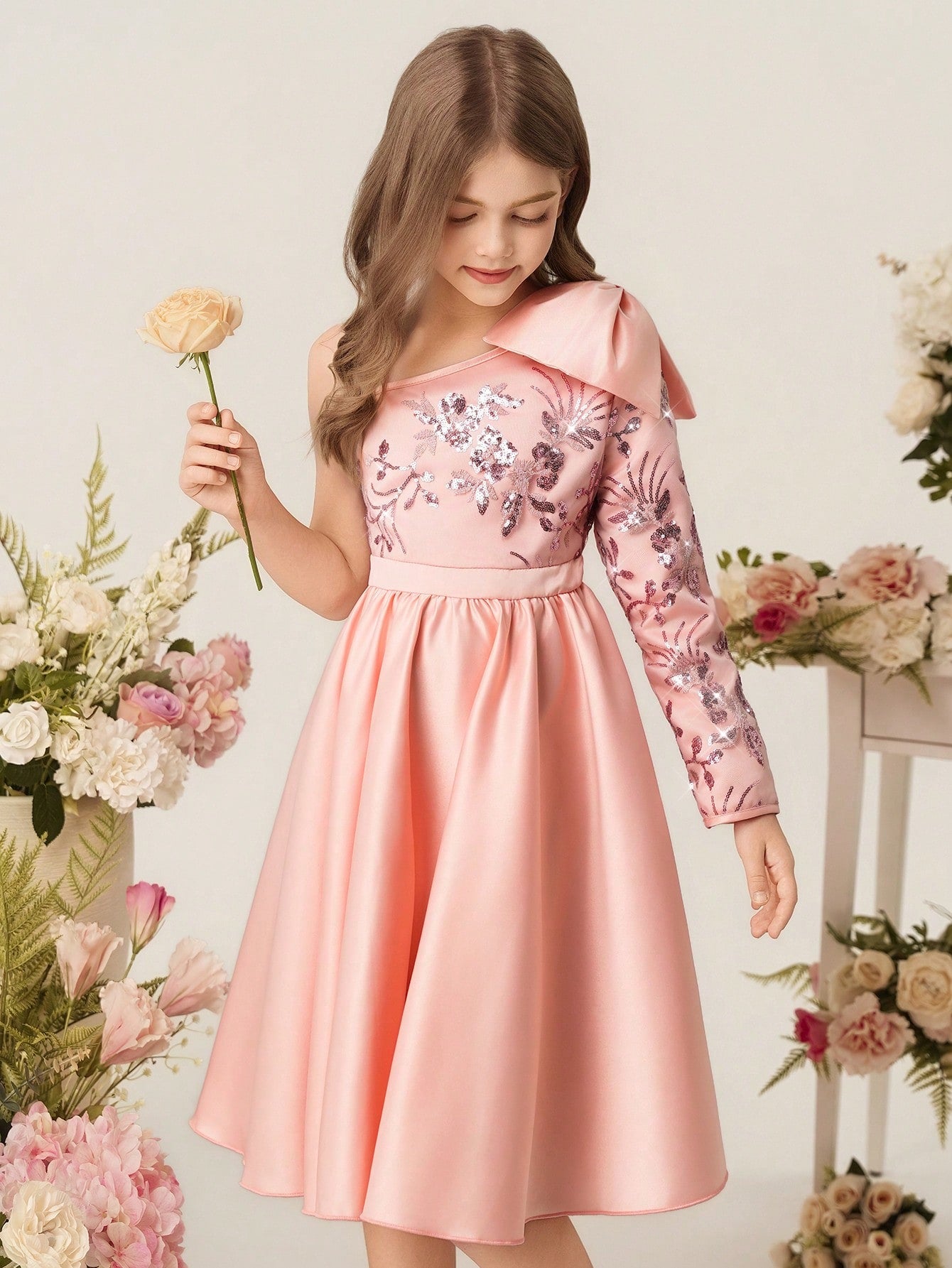 Flower Tween Girls Sequin Patchwork Satin One Shoulder Bowknot A-Line Short Dress, Wedding Bridesmaid