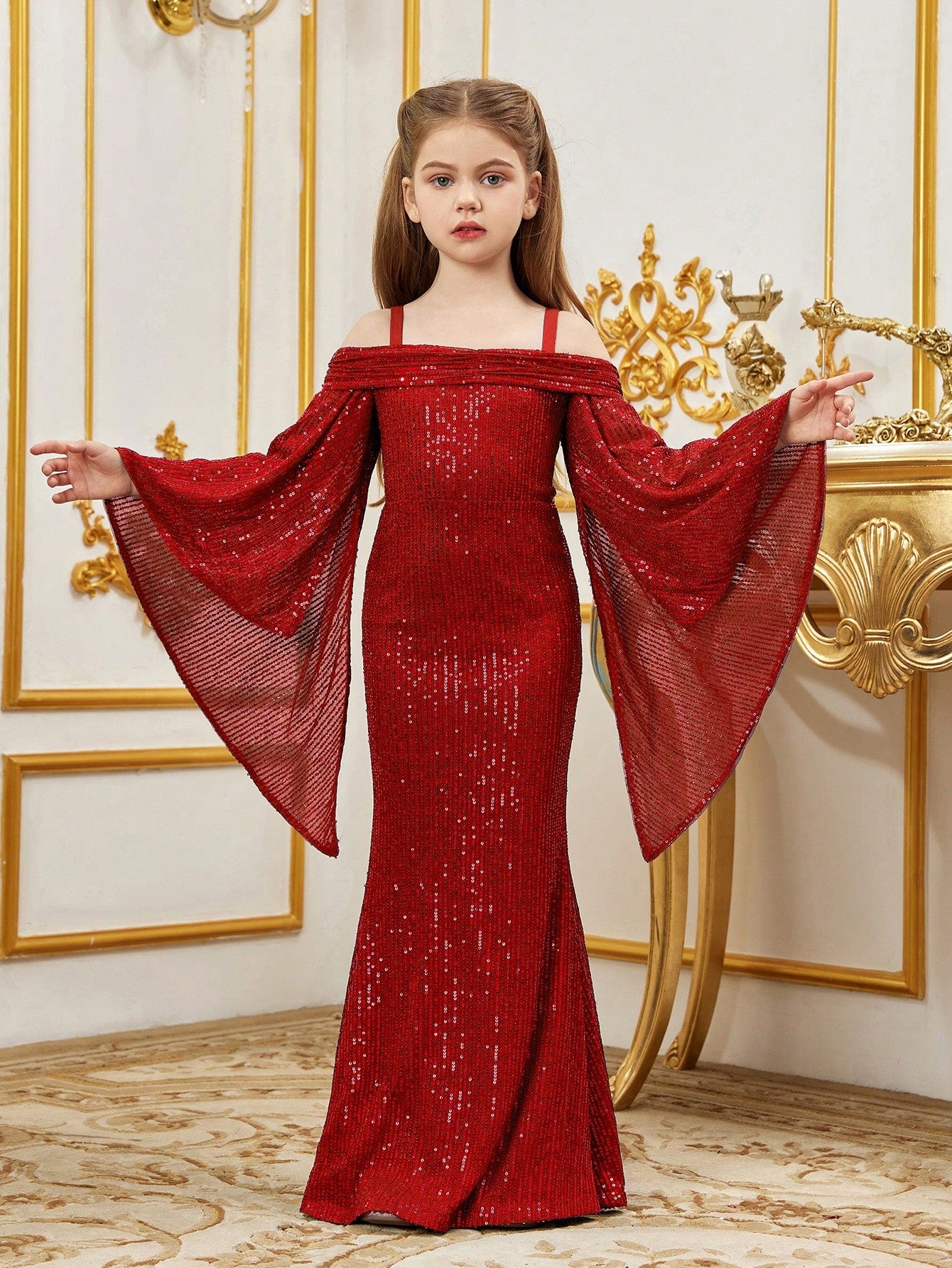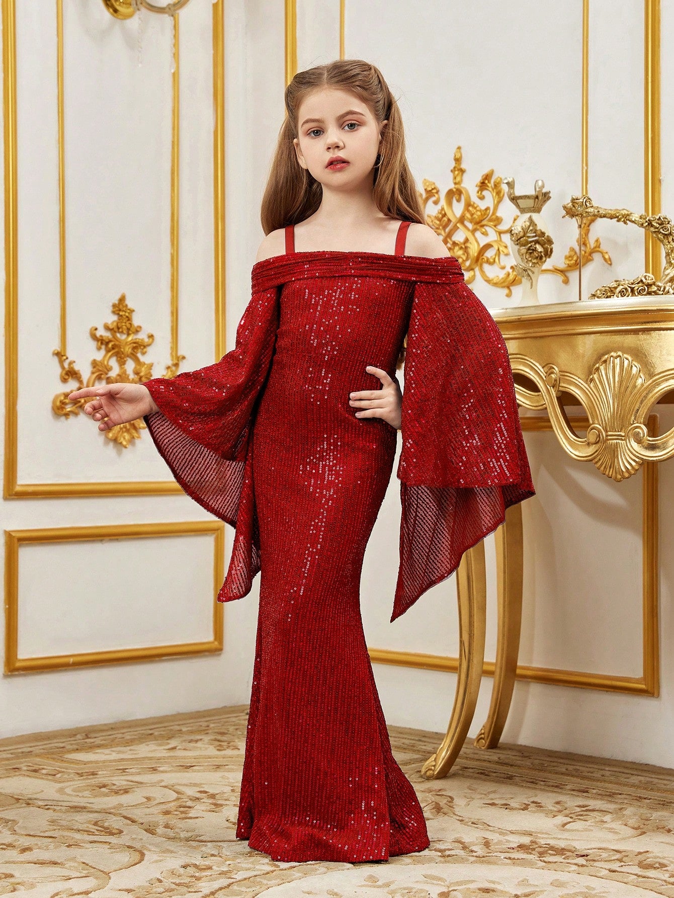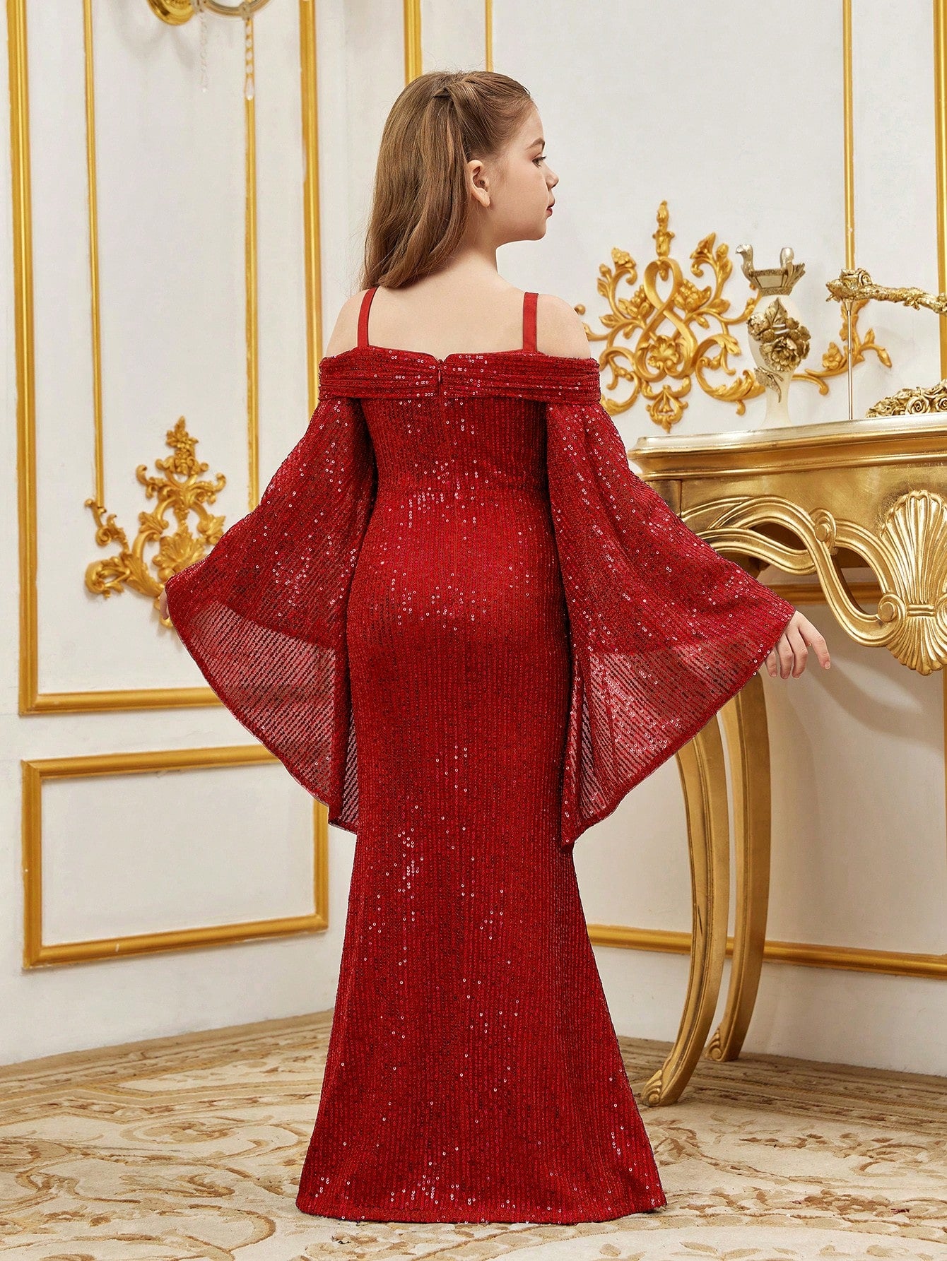 Tween Girl Open Shoulder Sequin Mermaid Hem Cami Dress With Flared Sleeves