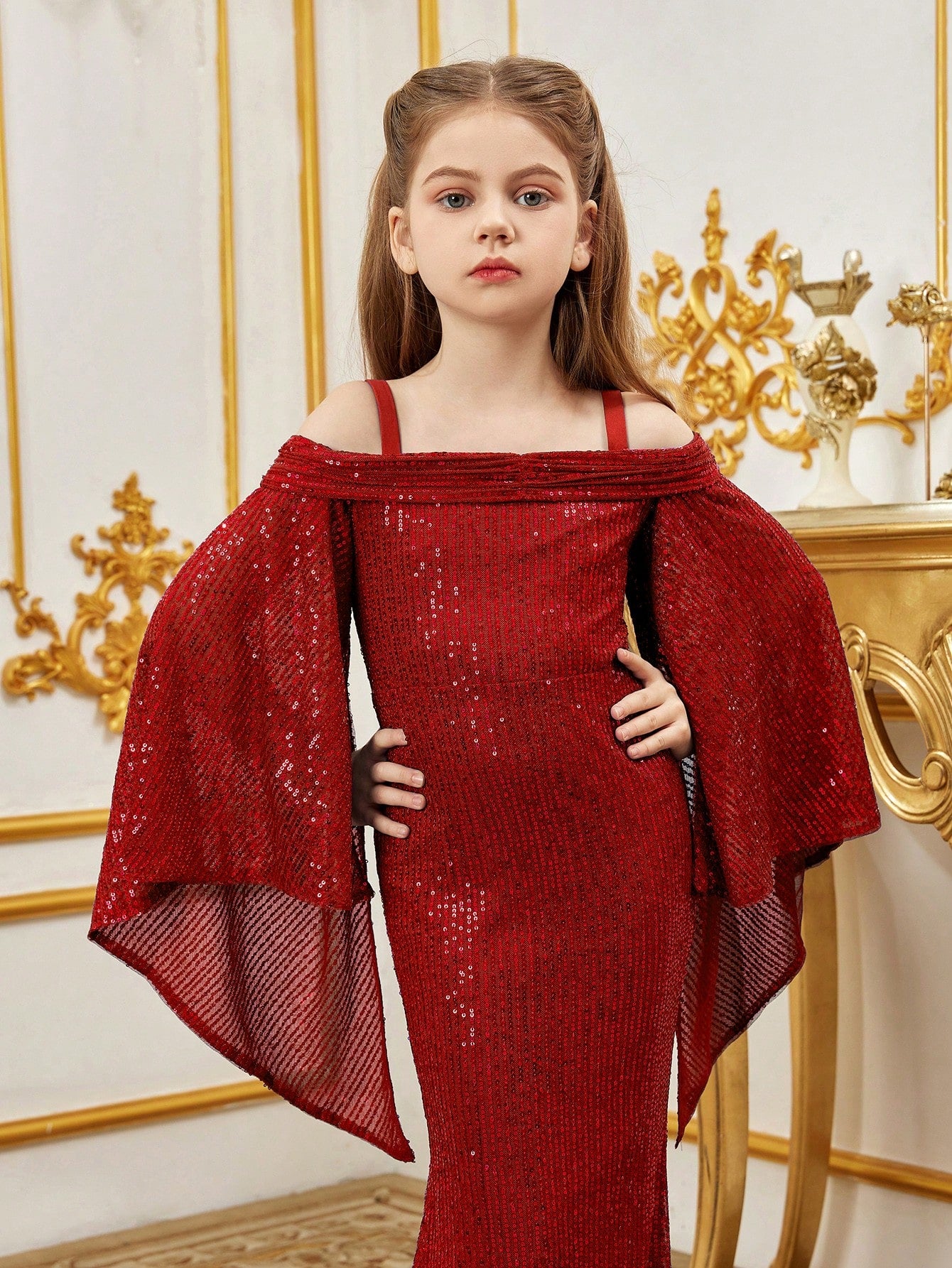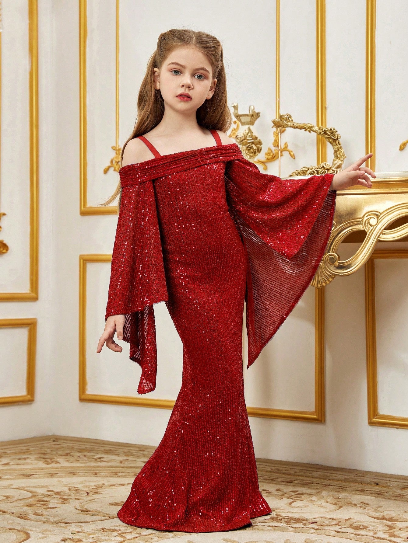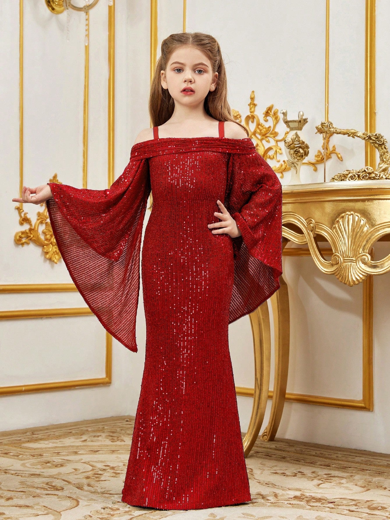 Tween Girl Open Shoulder Sequin Mermaid Hem Cami Dress With Flared Sleeves