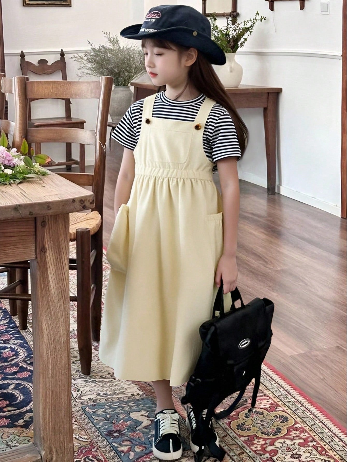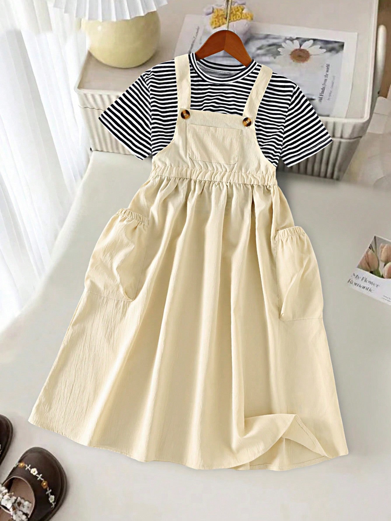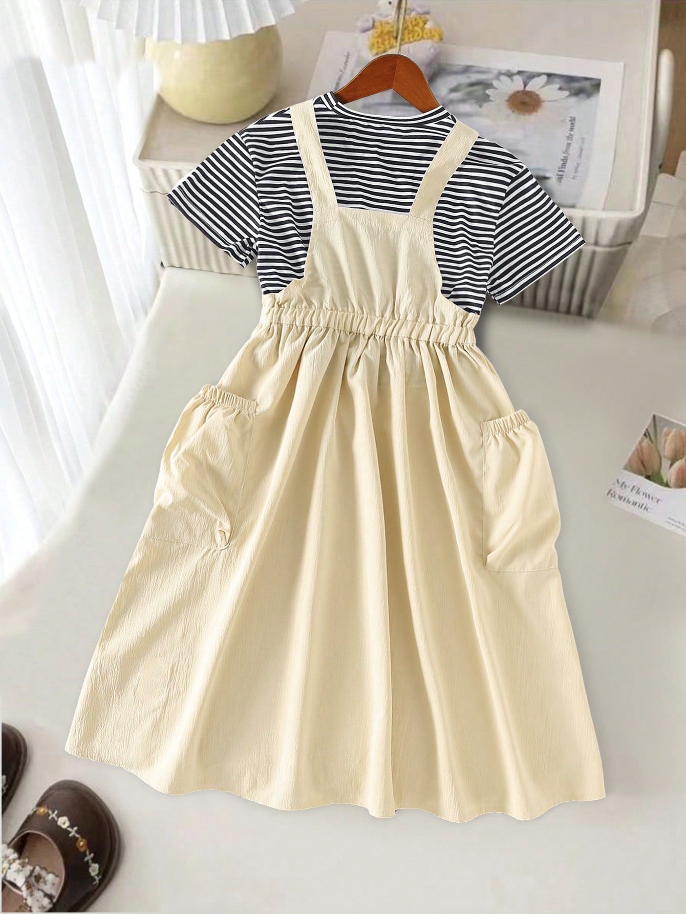 Tween Girls Casual Everyday Loose Drop Shoulder Striped Tee And Solid Color High Waist Midi Suspender