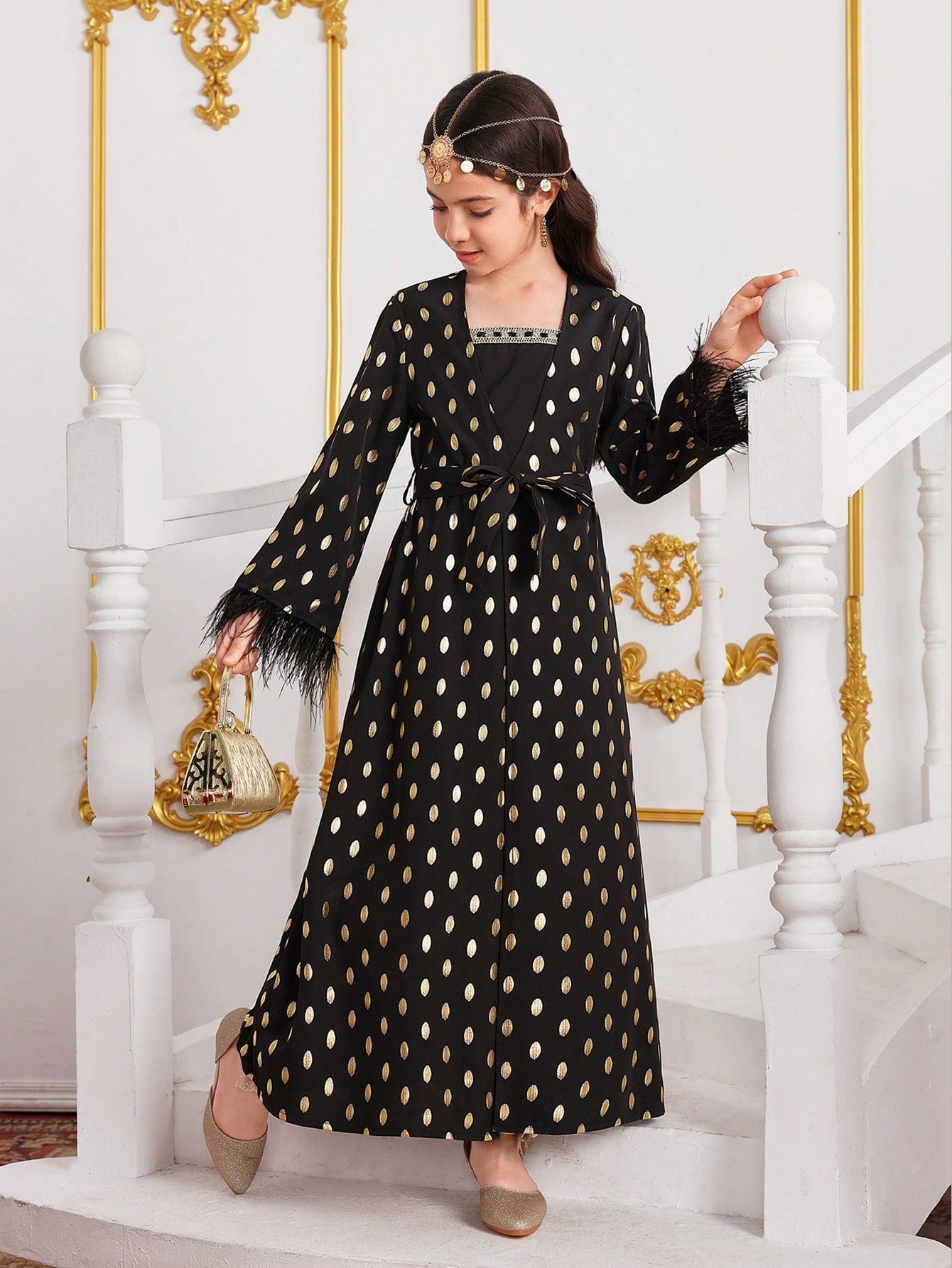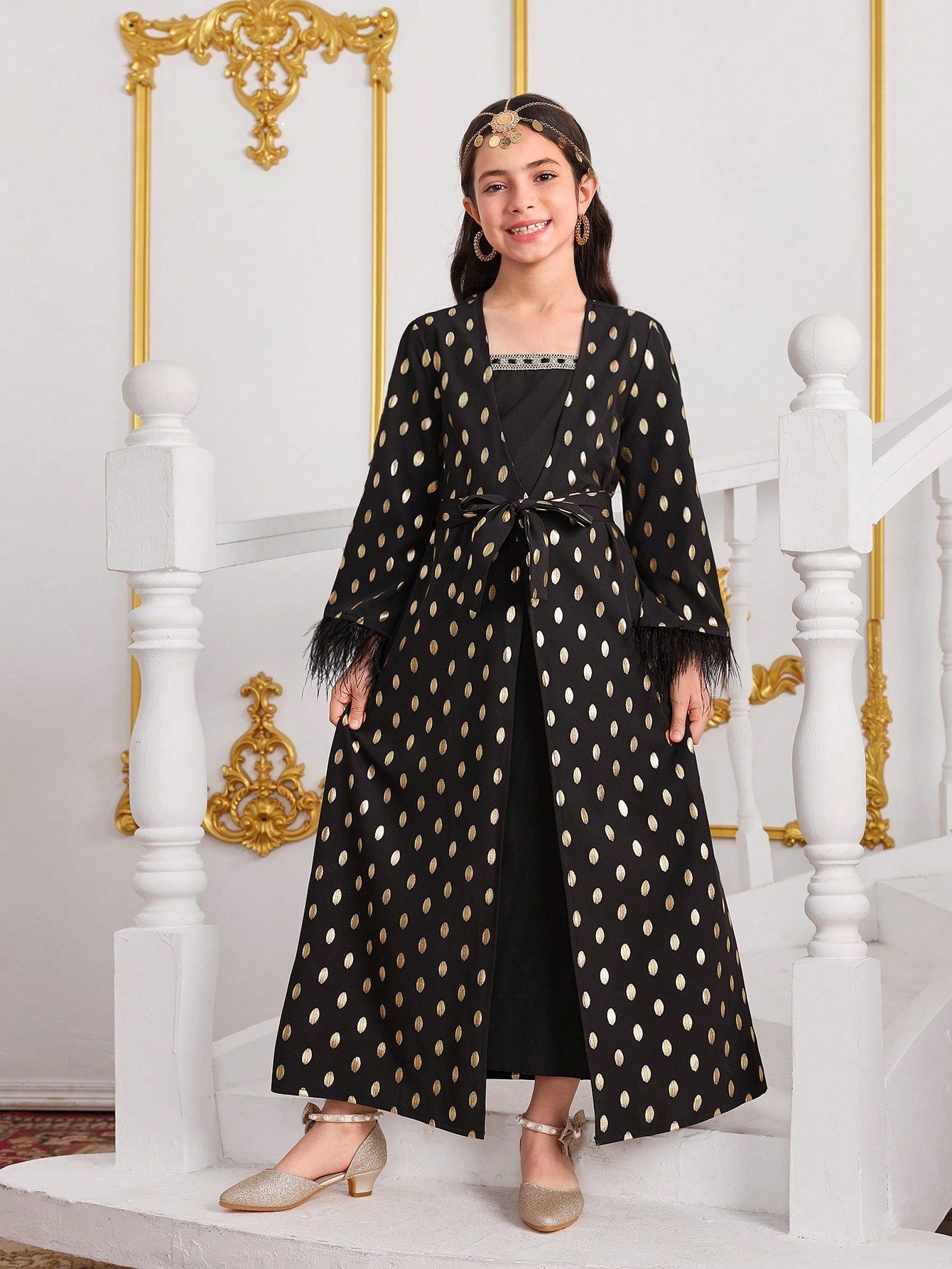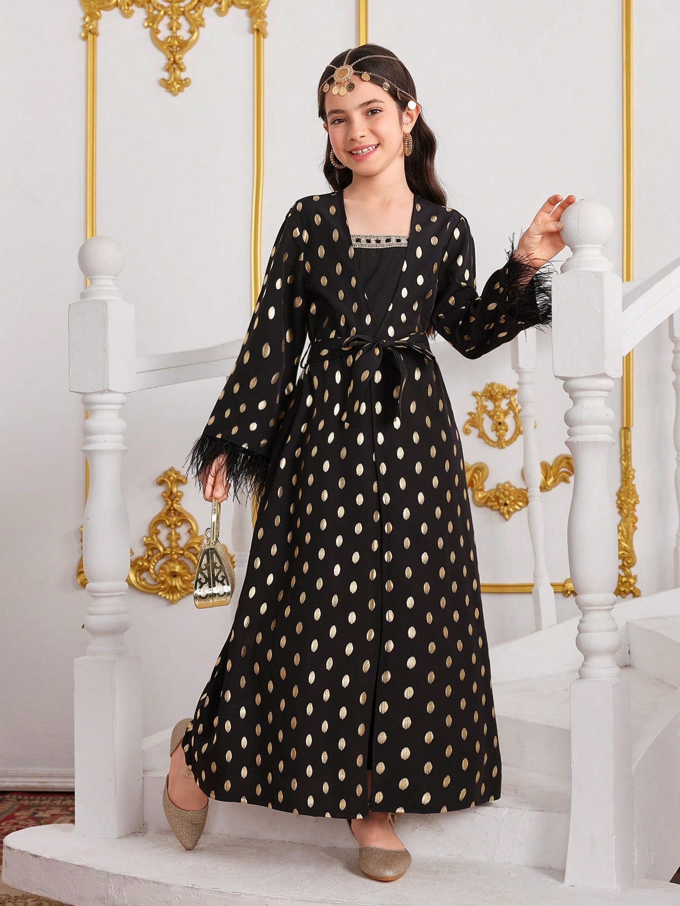 Tween Girls' Fashionable Gold Foil Print Jacket And Long Skirt Set