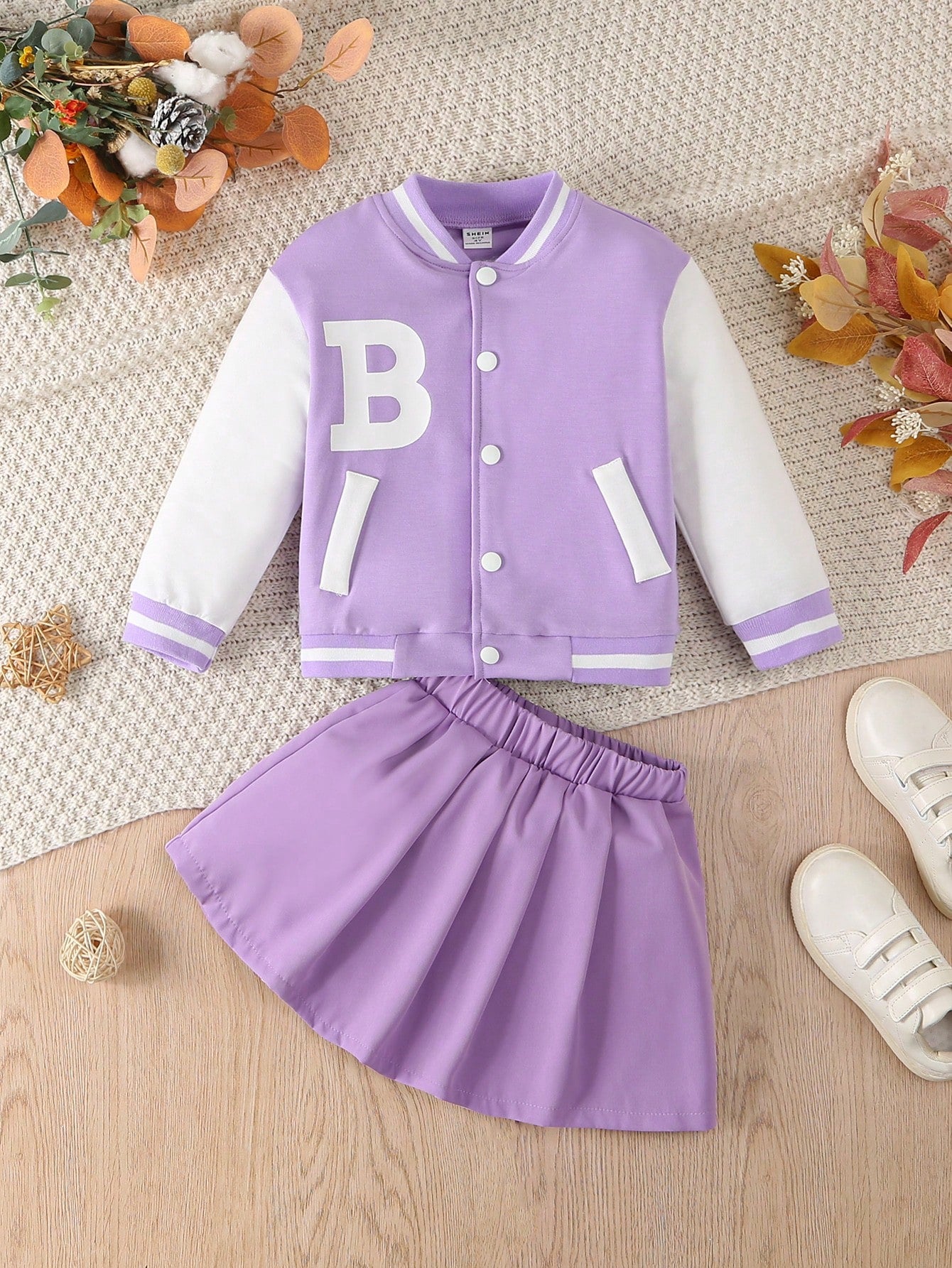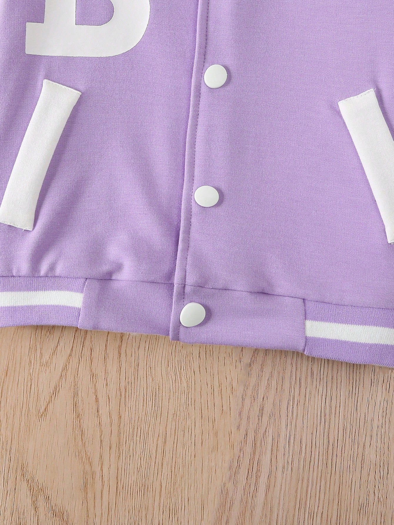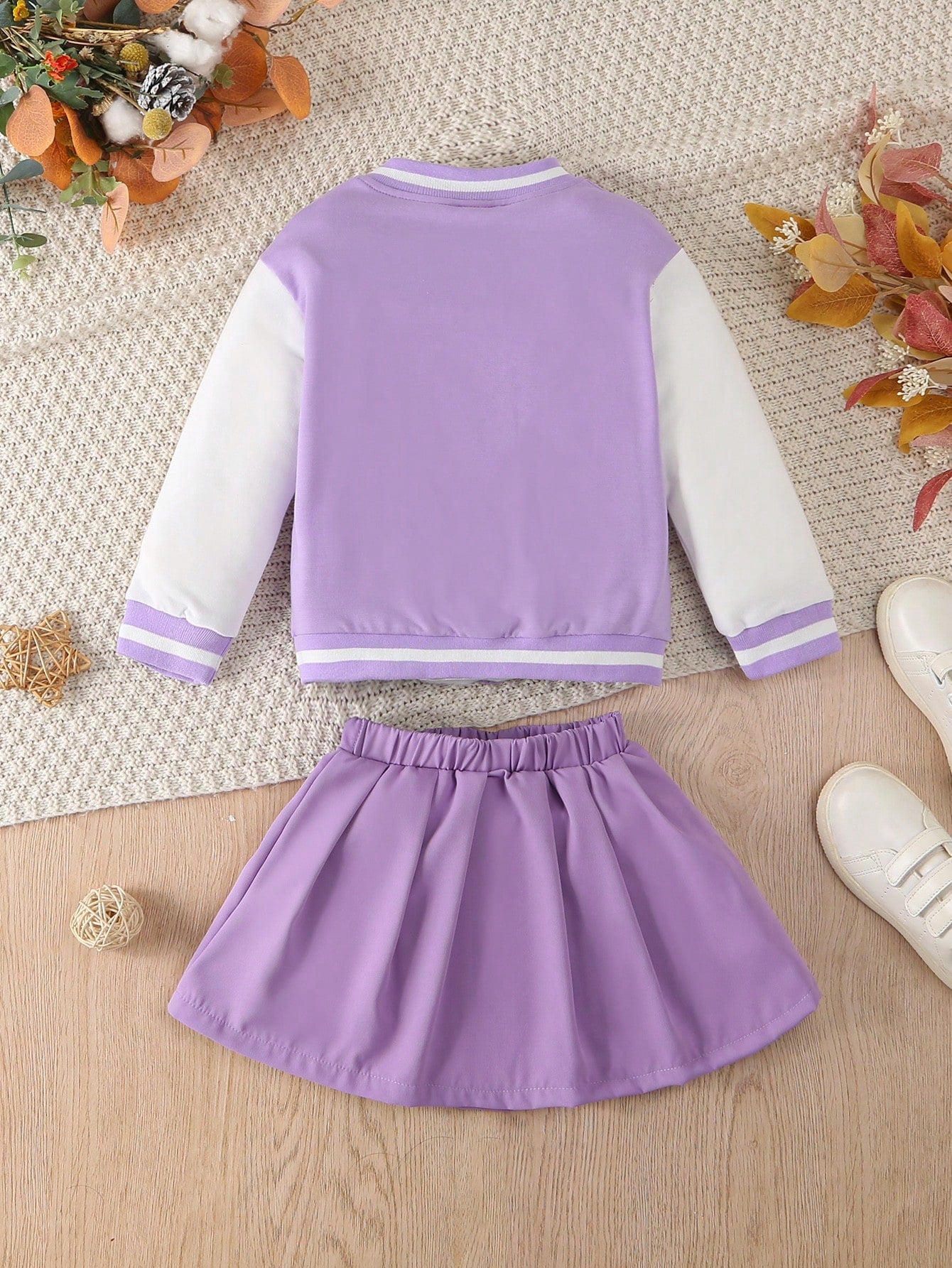 Young Girl Baseball Collar Color Block Button Front Long Sleeve Jacket + Purple Elastic Waist Pleated
