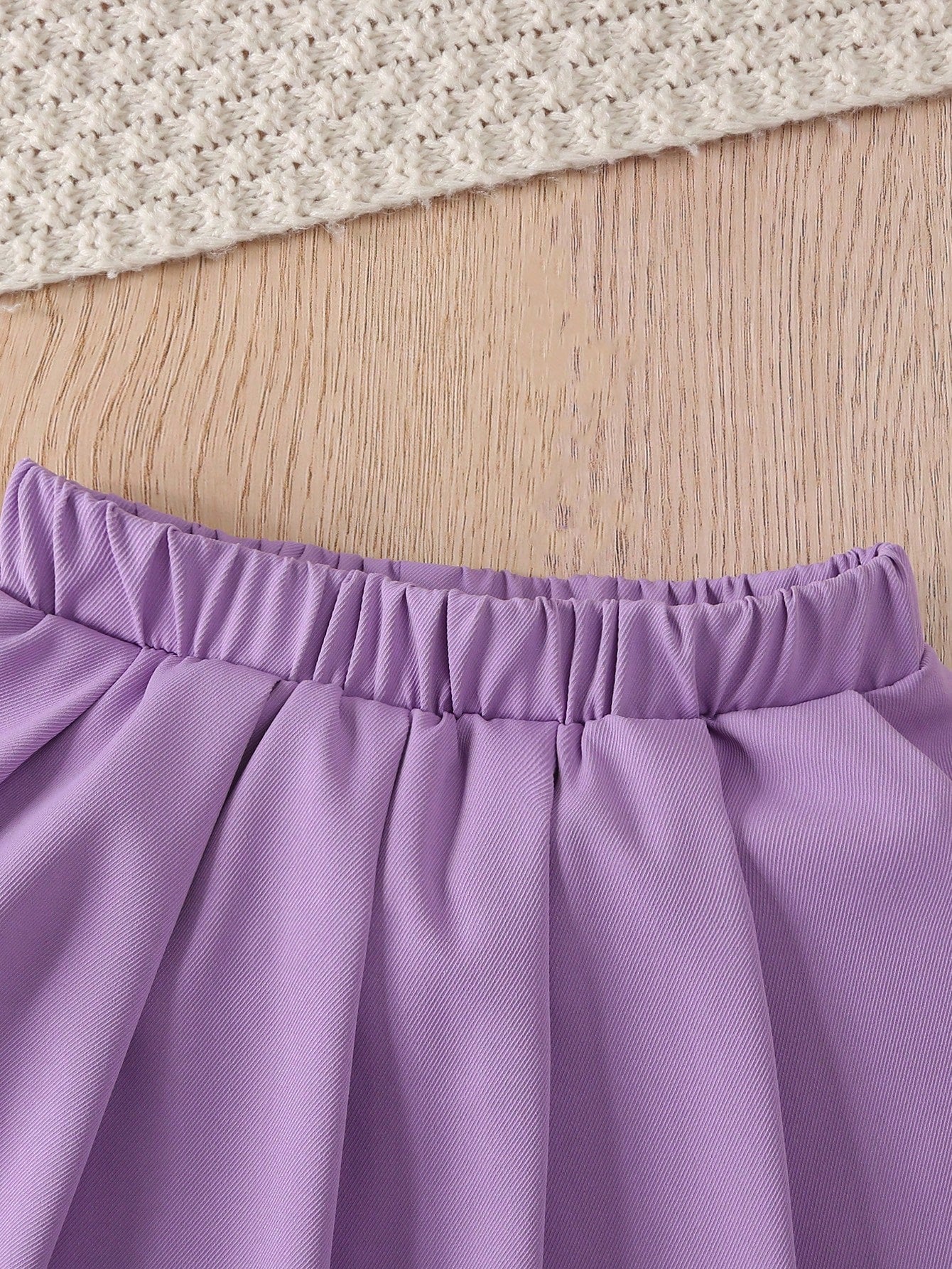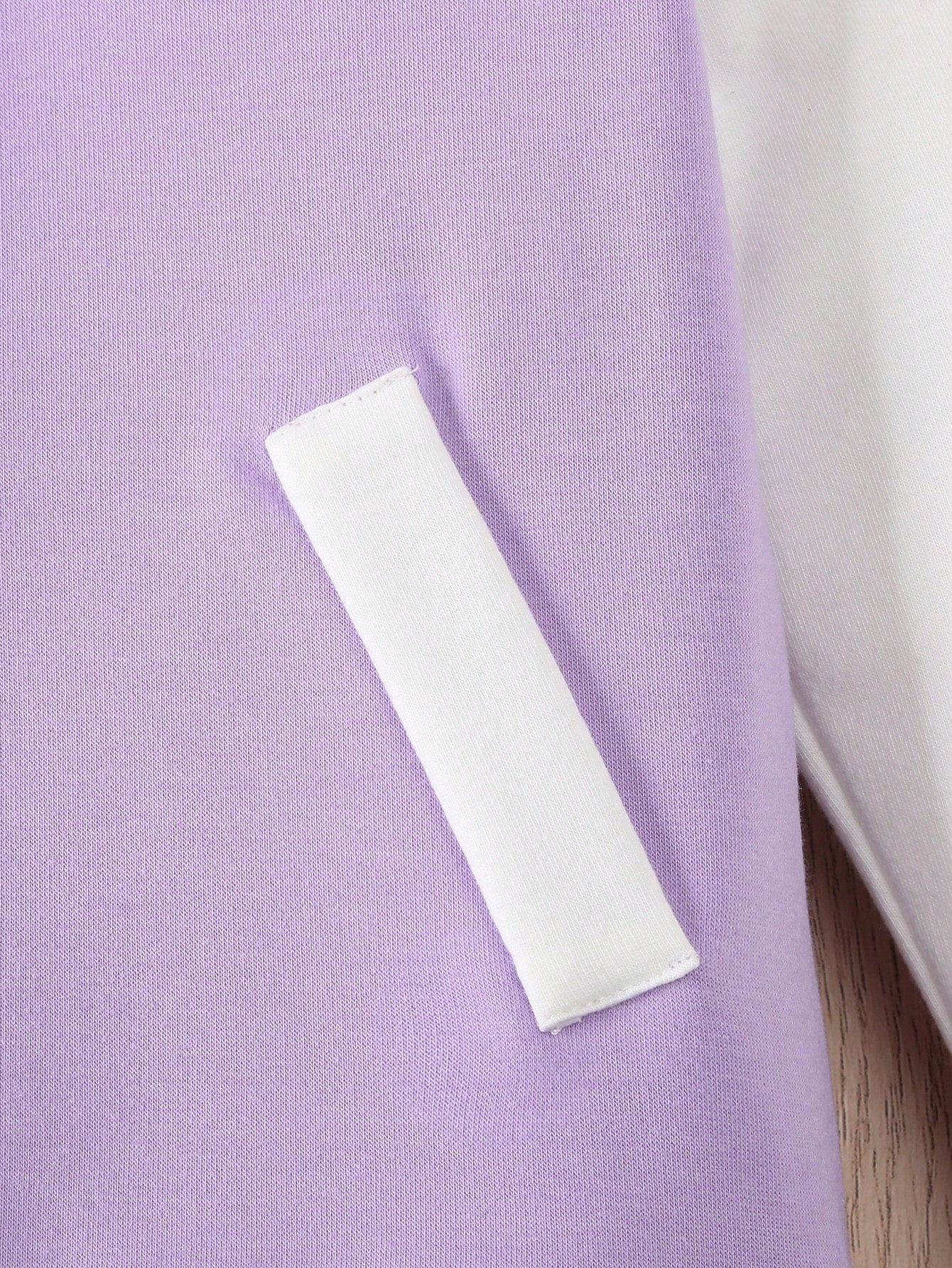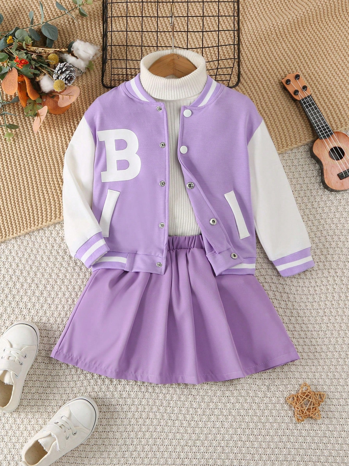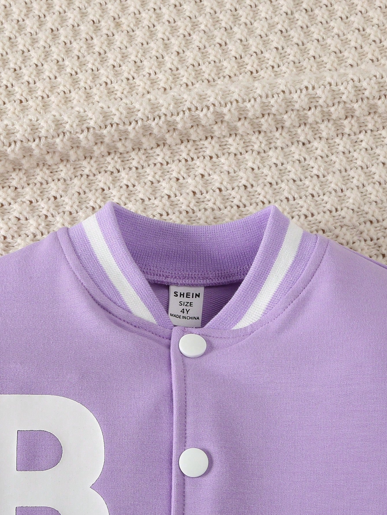 Young Girl Baseball Collar Color Block Button Front Long Sleeve Jacket + Purple Elastic Waist Pleated