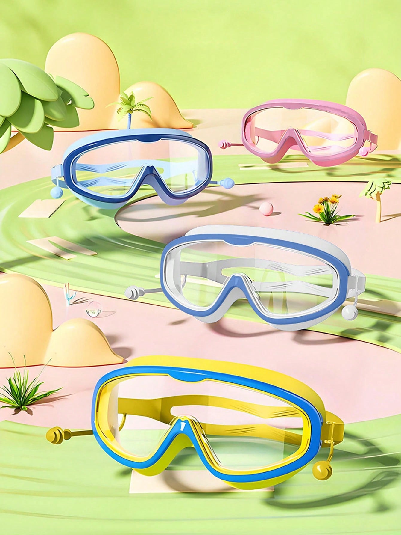 نظارات سباحة عالية الدقة مضادة للماء والضباب للجنسين، قطعة واحدة، مع سدادات أذن. مقاومة للماء.