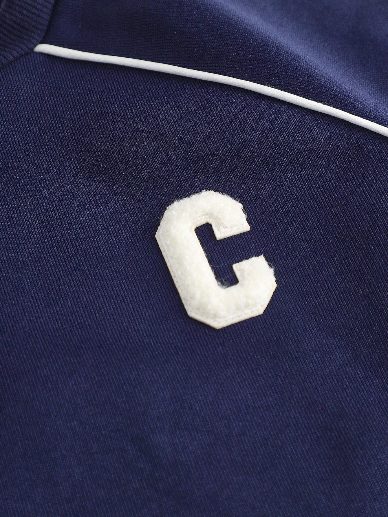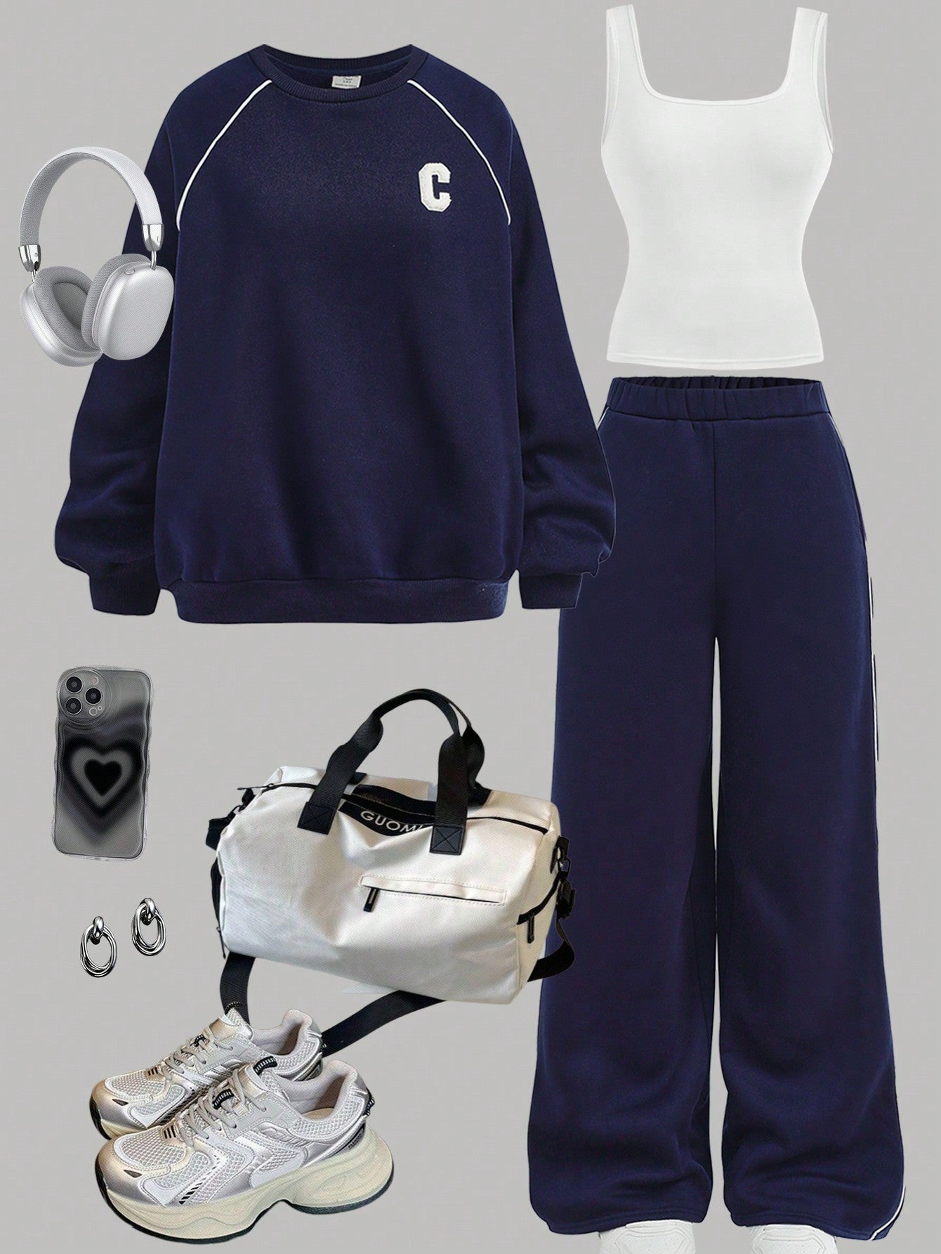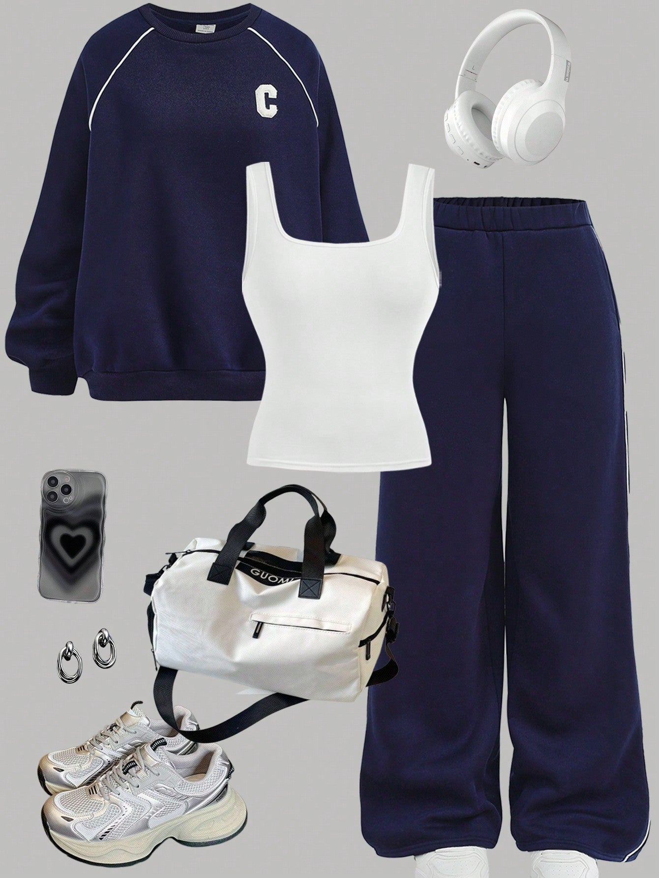 Girlism Teen Girls 3pcs/Set Contrast Color Trim Letter Graphic Long Sleeve Hoodie, Tank Top And Sweatpants,