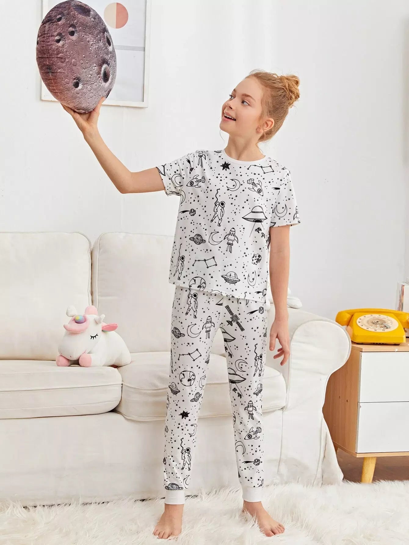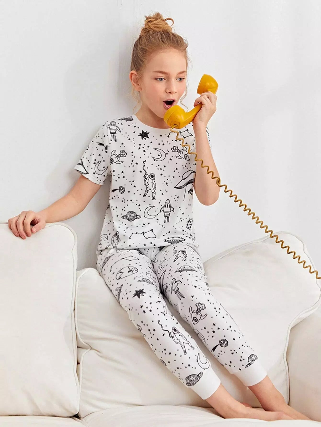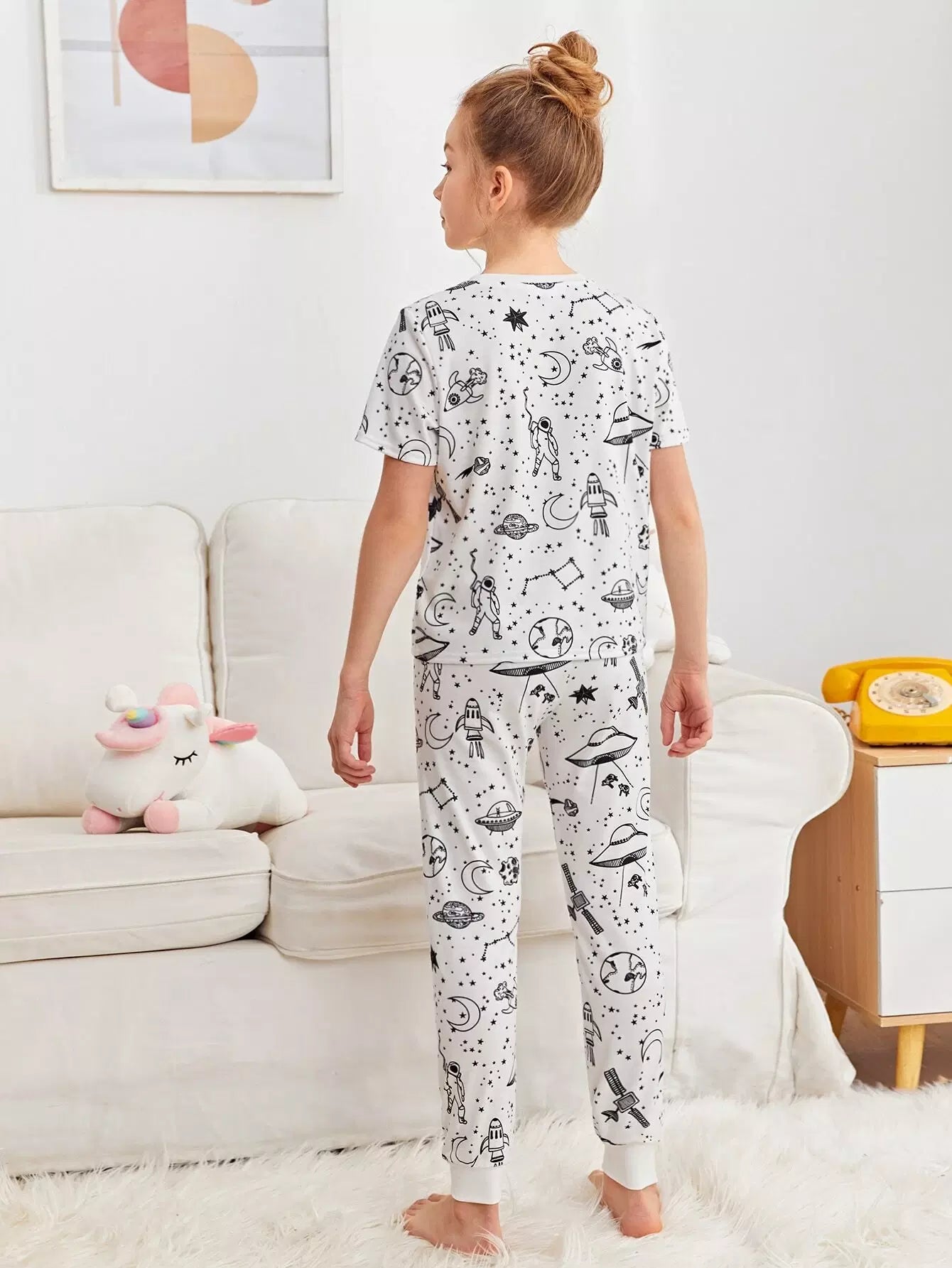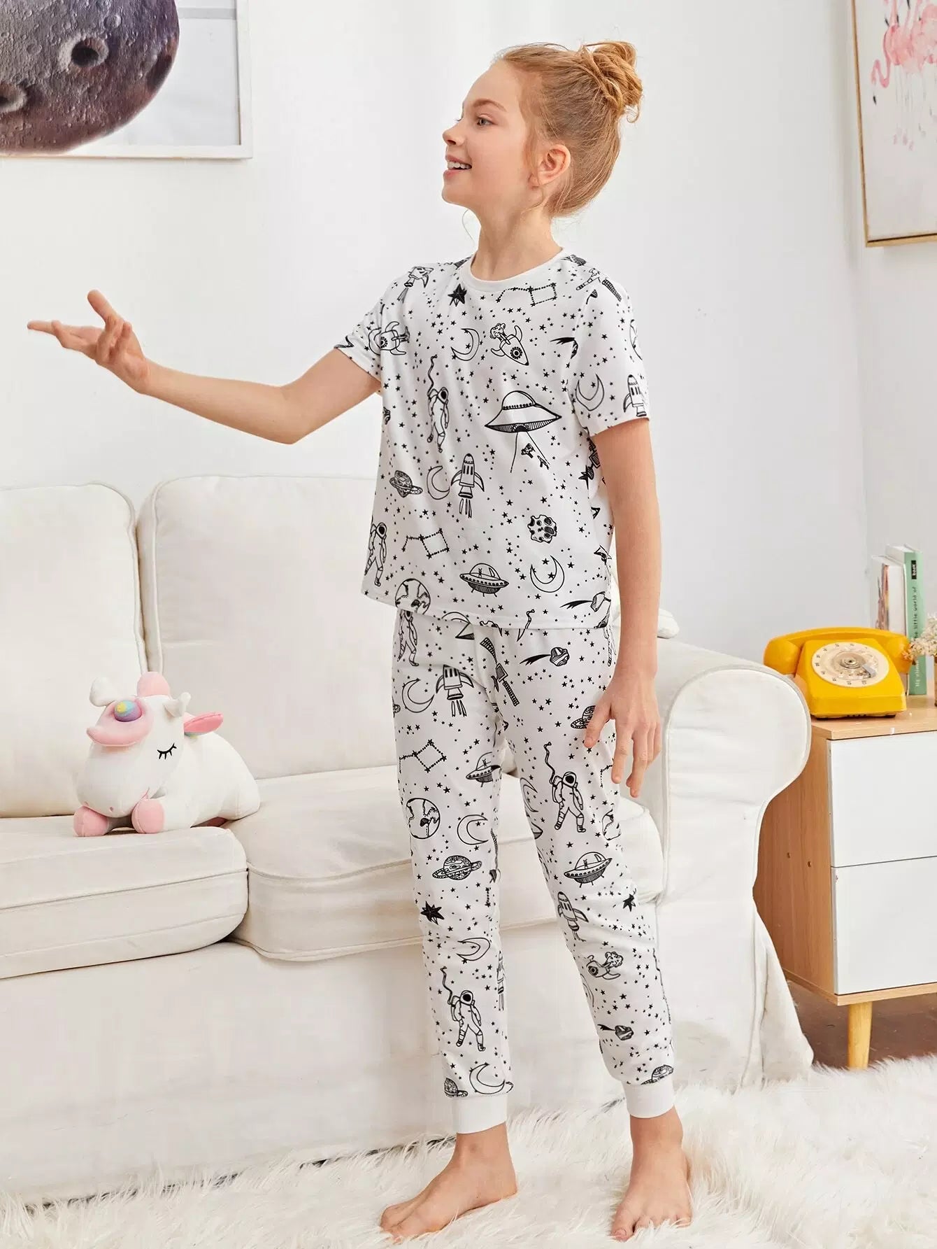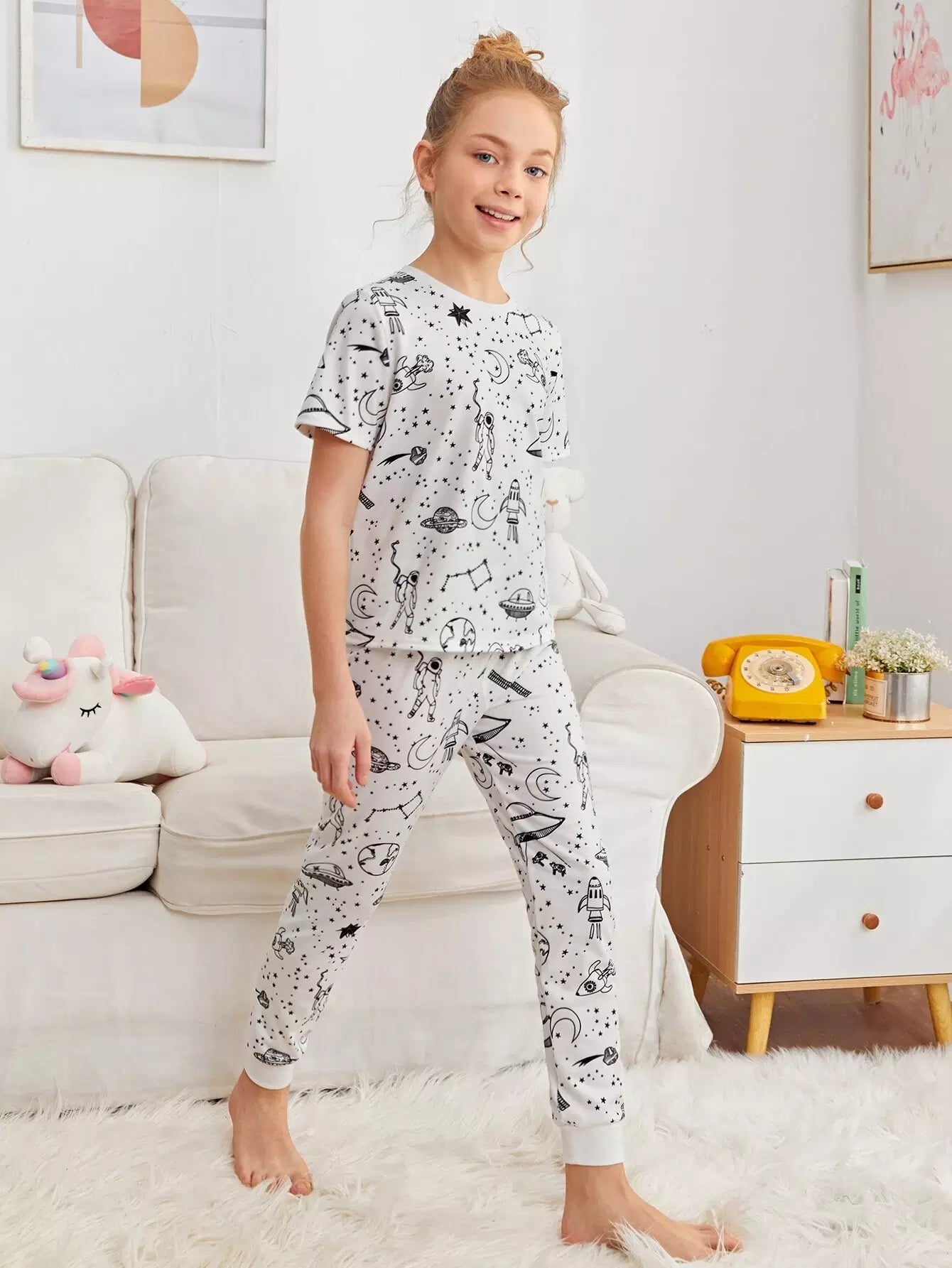 طقم بيجامة مكون من توب وبنطلون بطبعة جرافيكية للبنات