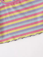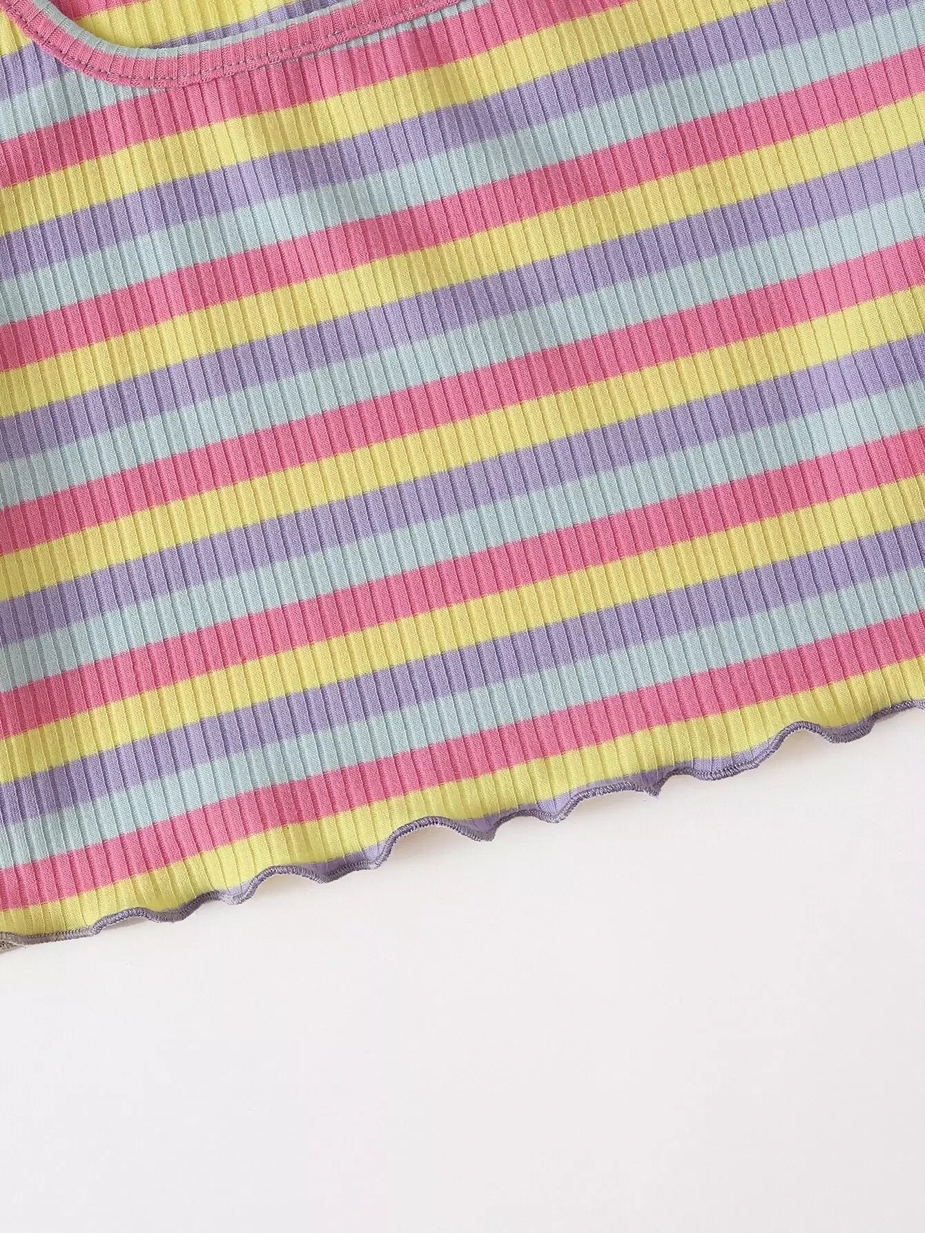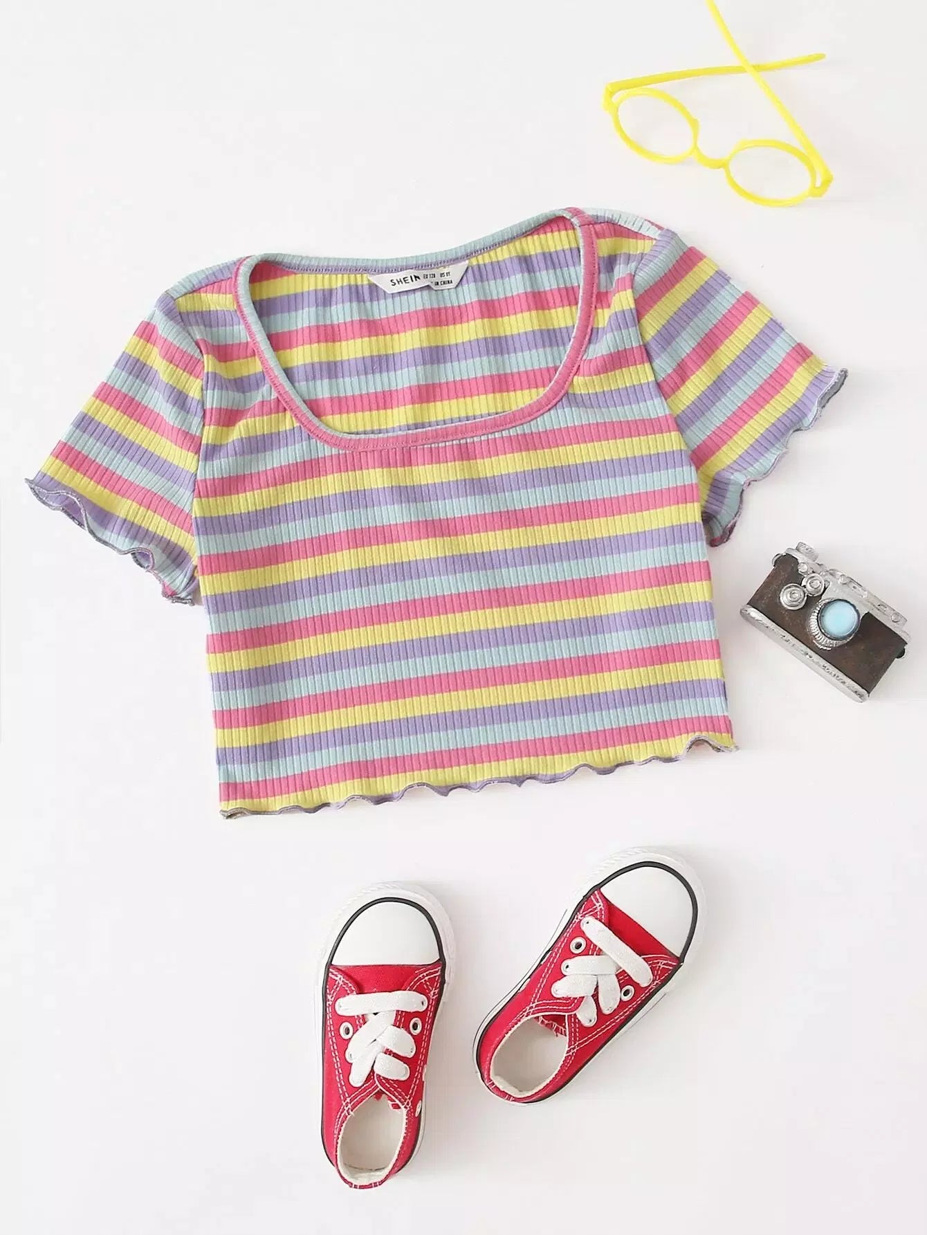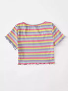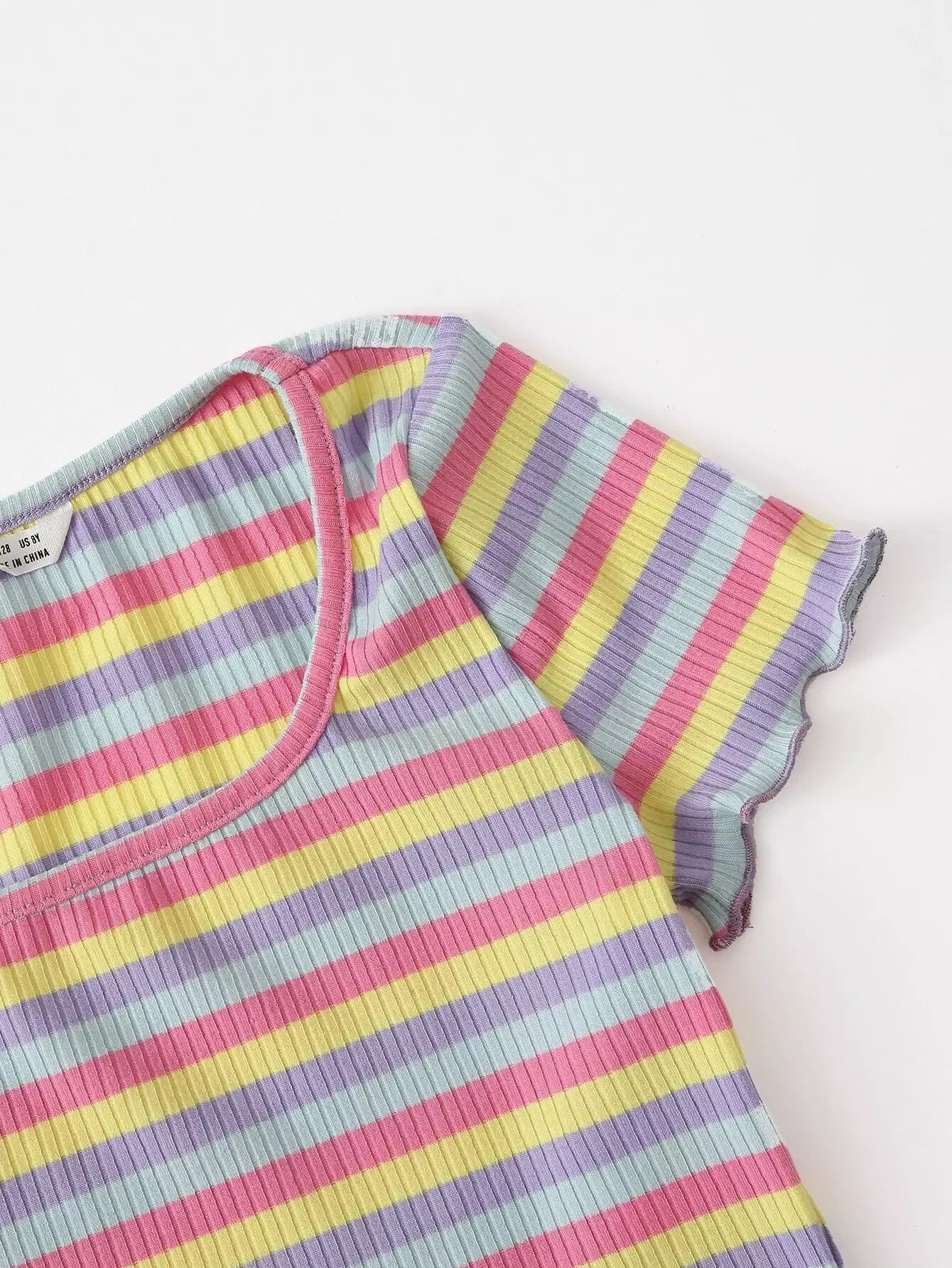 تي شيرت قصير مخطط بألوان متعددة مع حواف من الخس للفتيات