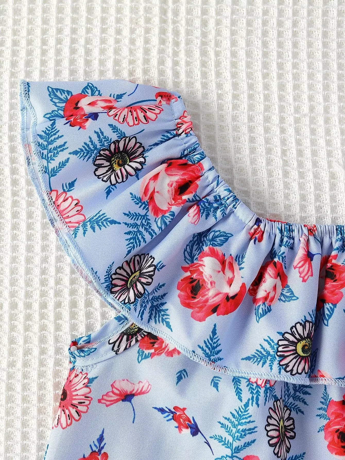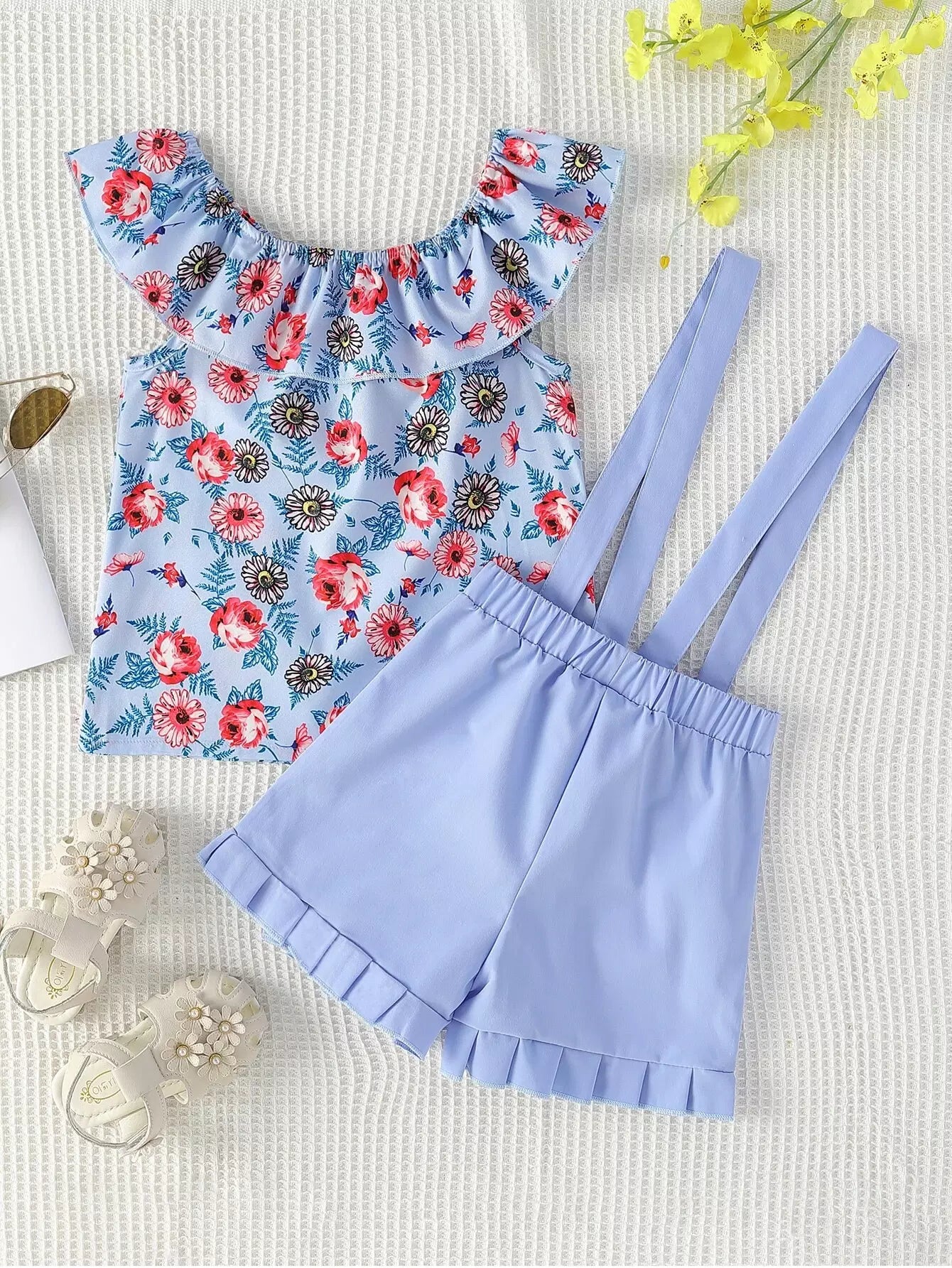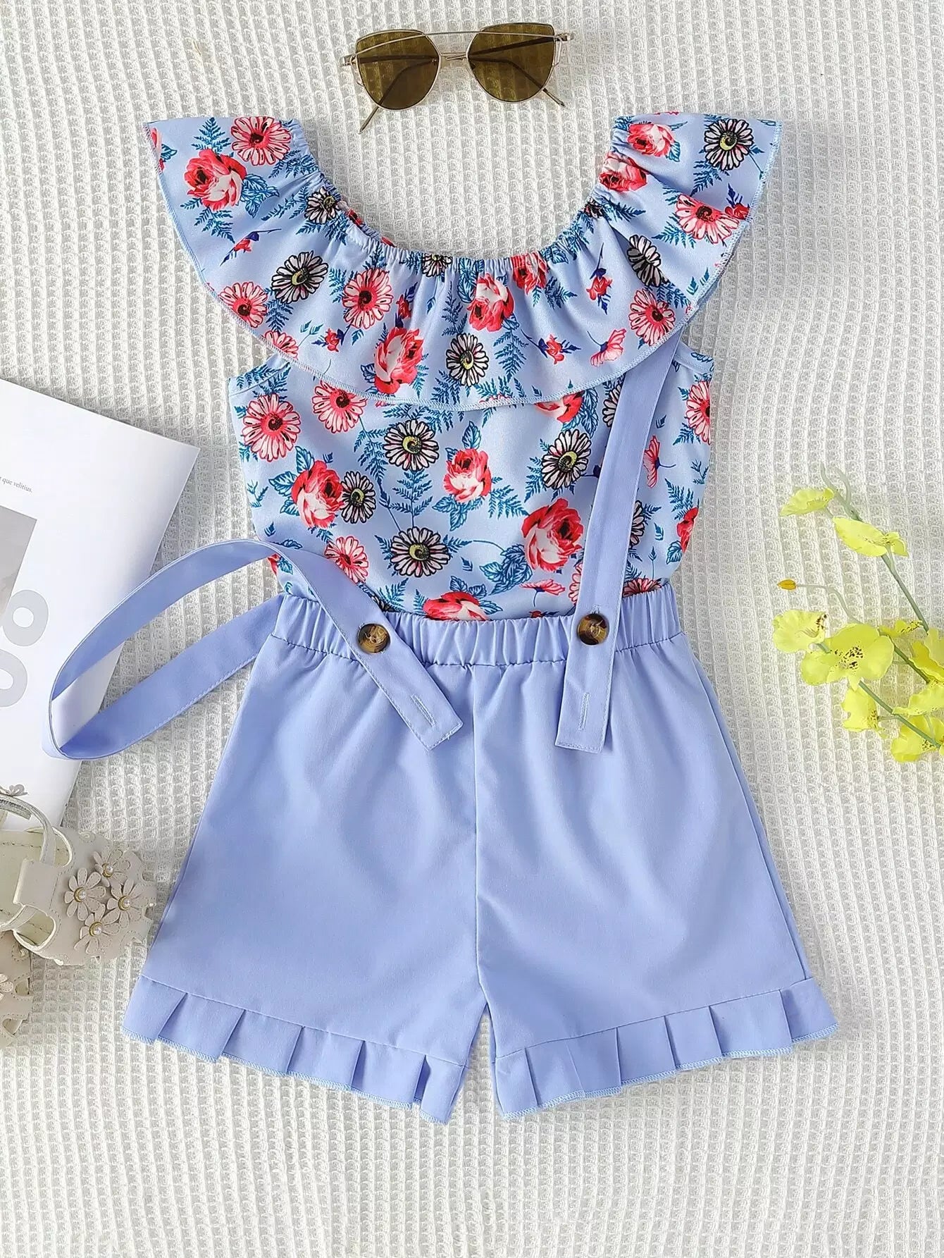بلوزة مزينة بكشكشة زهرية اللون للفتيات الصغيرات مع شورت قصير بحاشية مطوية