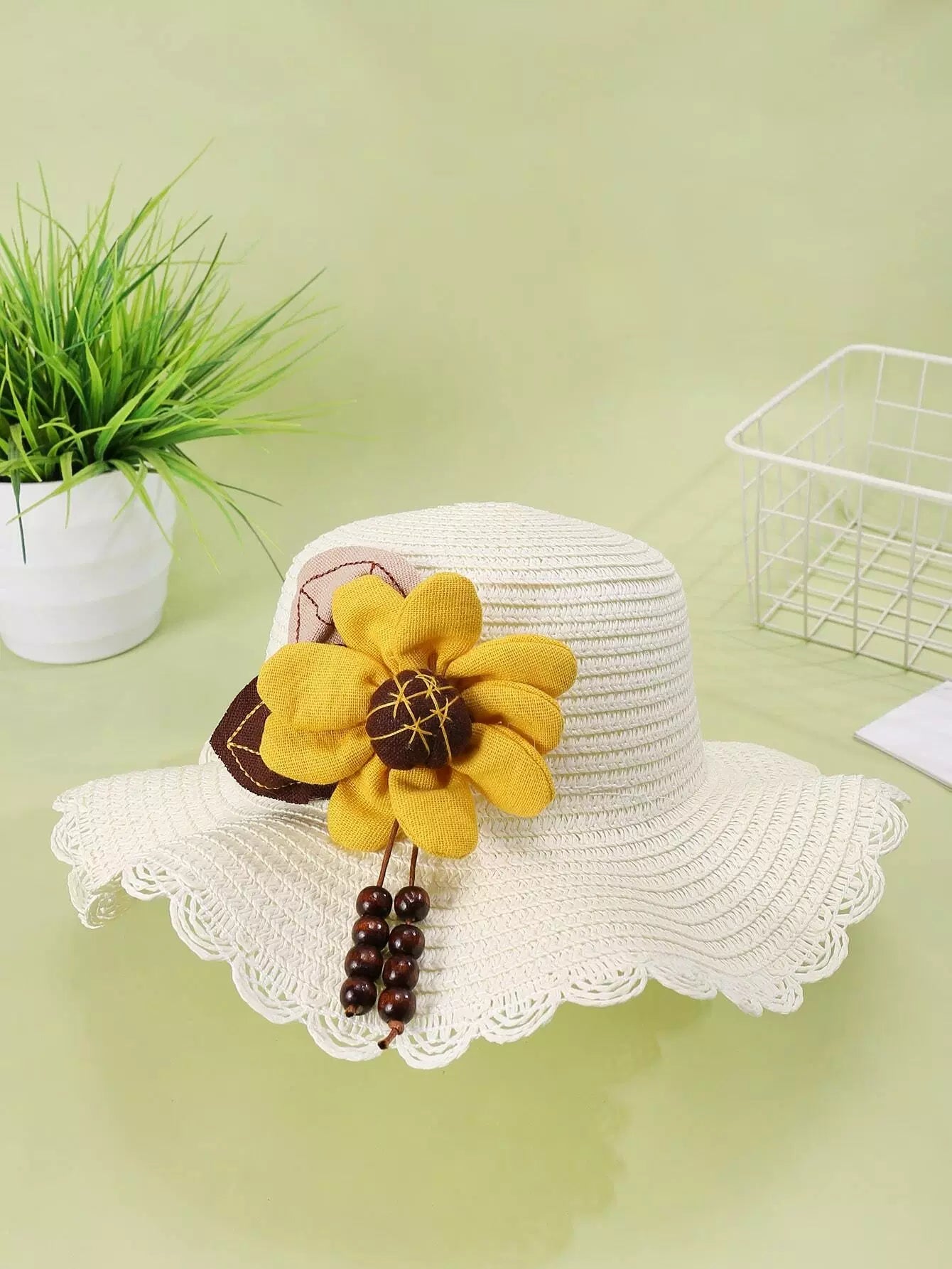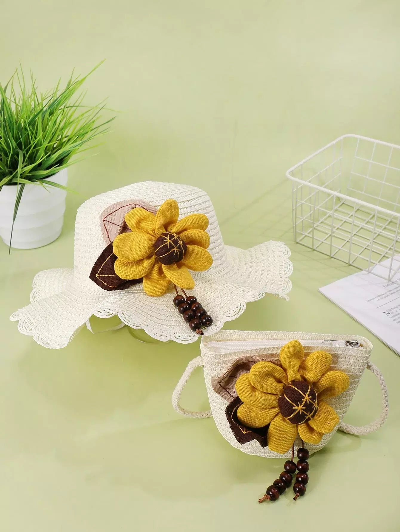 حقيبة قش مزينة بزهرة عباد الشمس للبنات مع قبعة