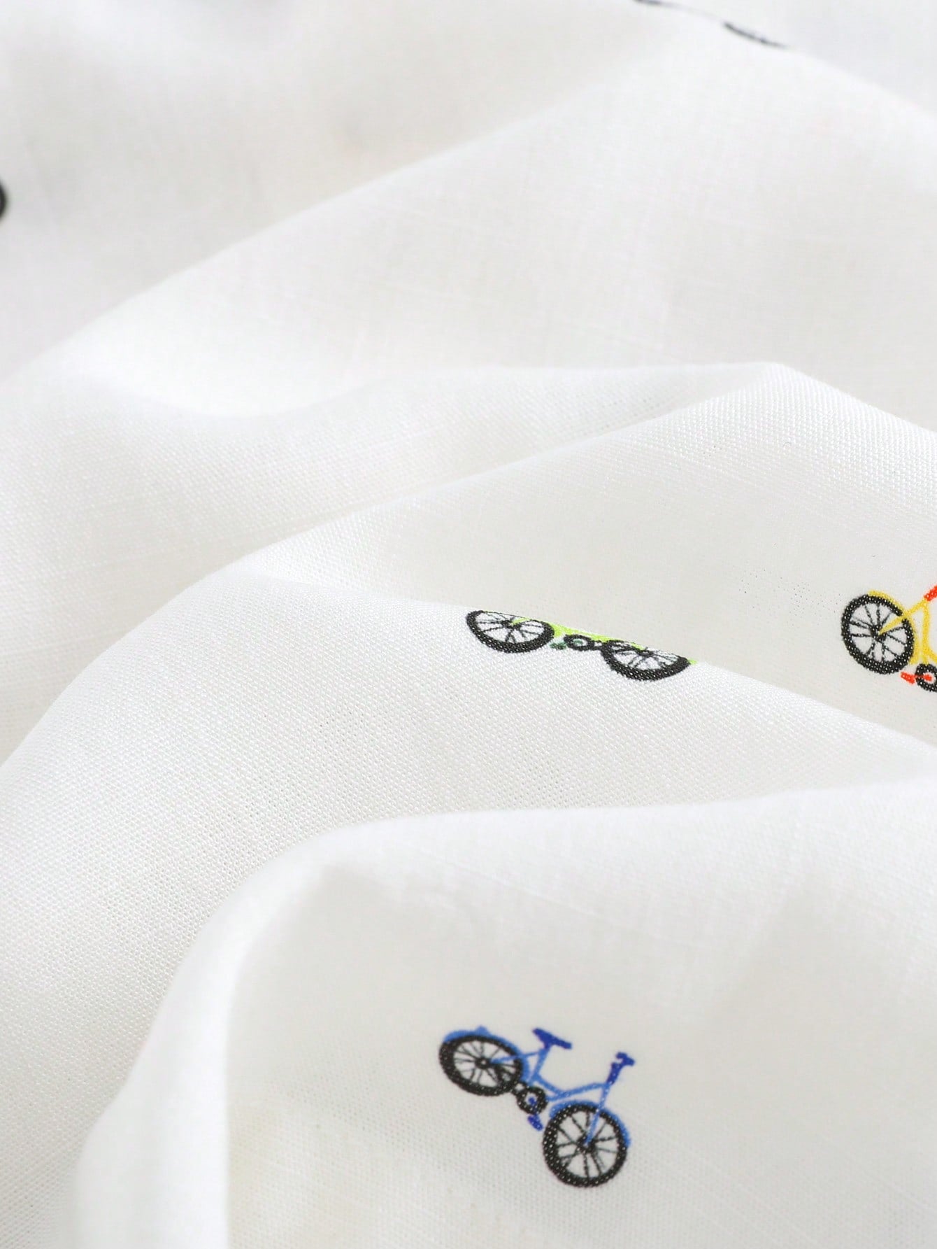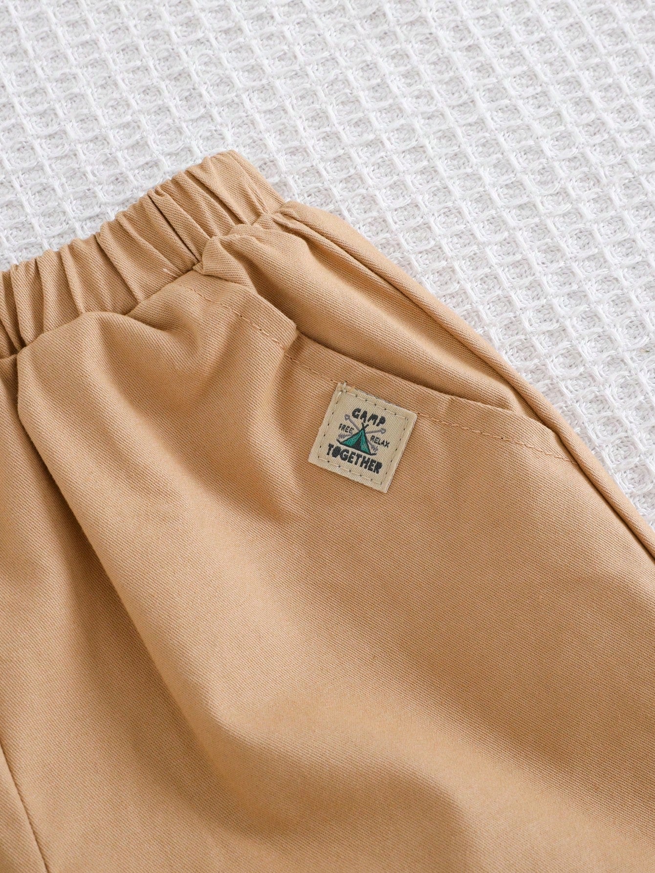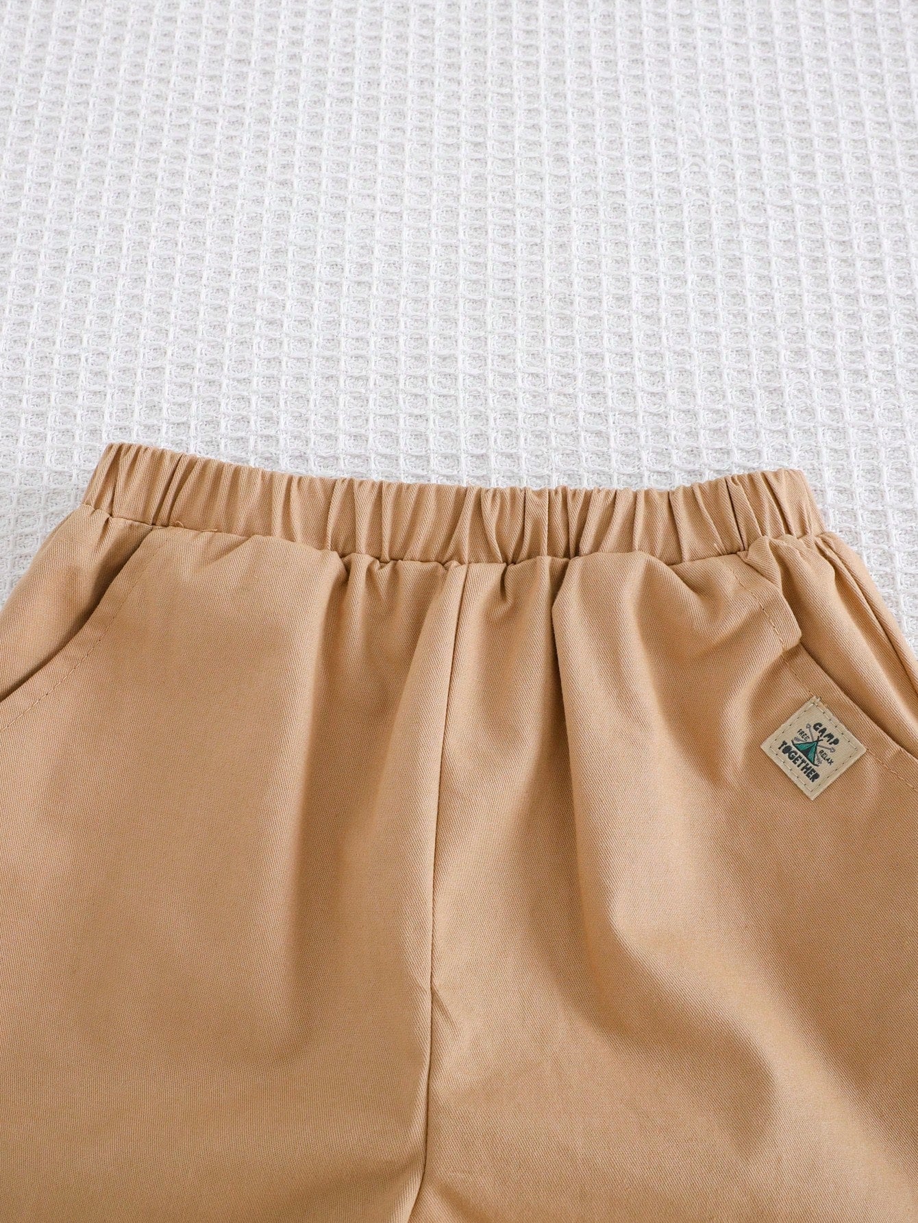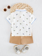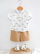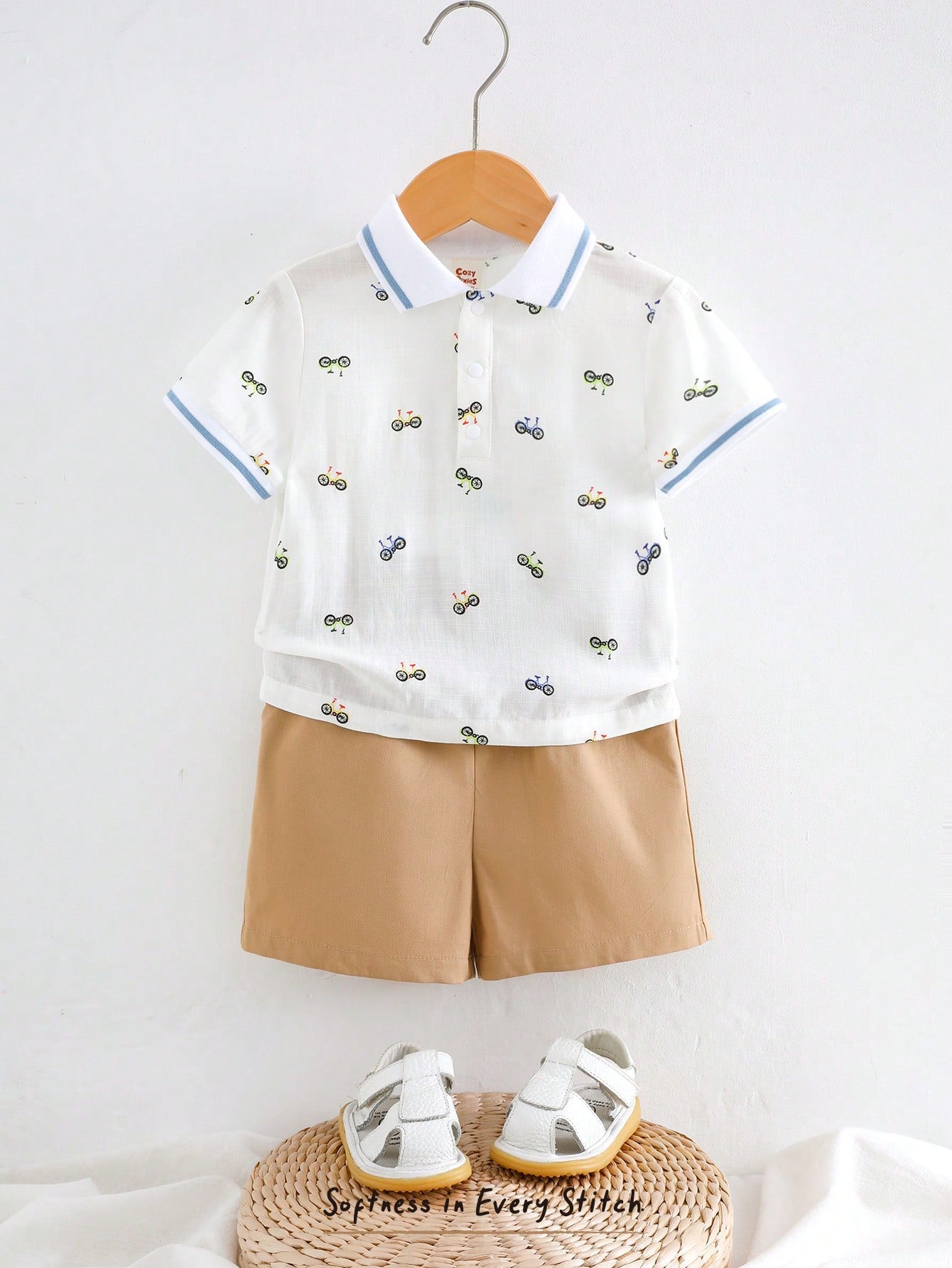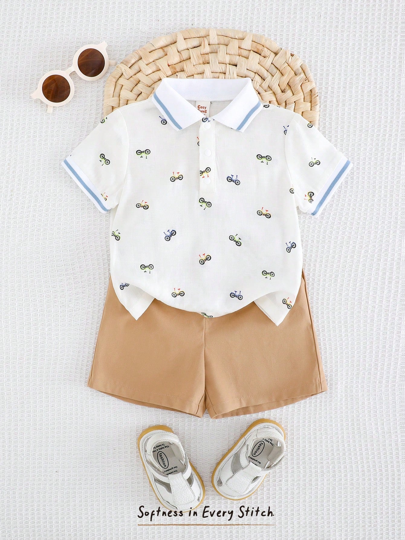 Cozy Pixies 2pcs Baby Boy Set: Cartoon Animal Print Lapel Short Sleeve Top And Elastic Waist Shorts