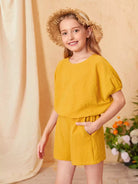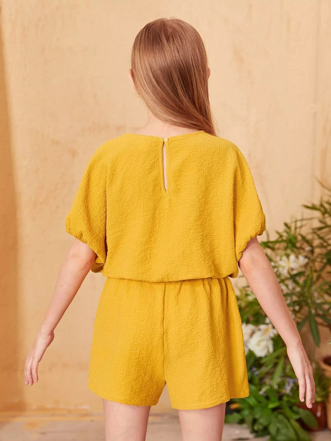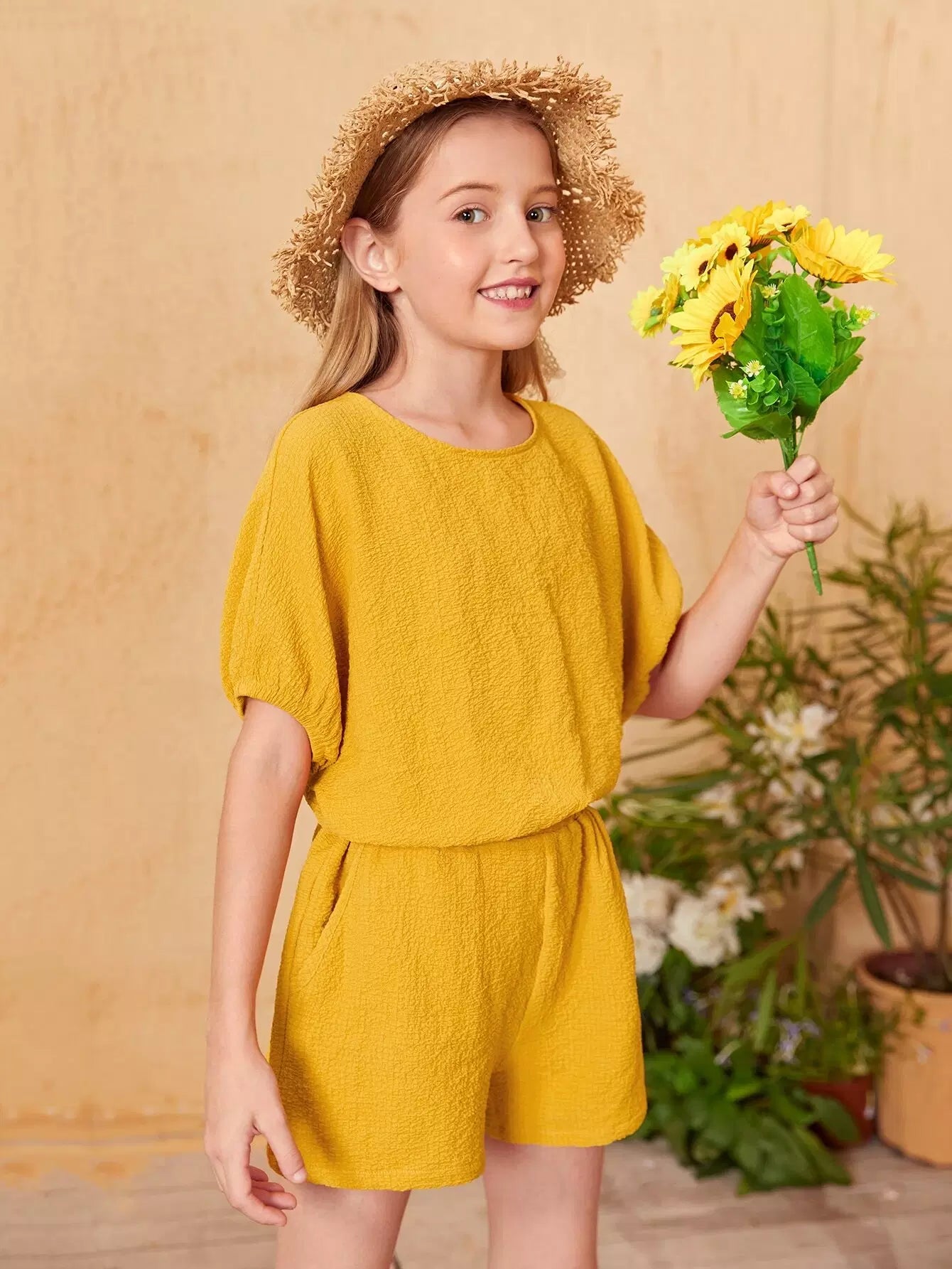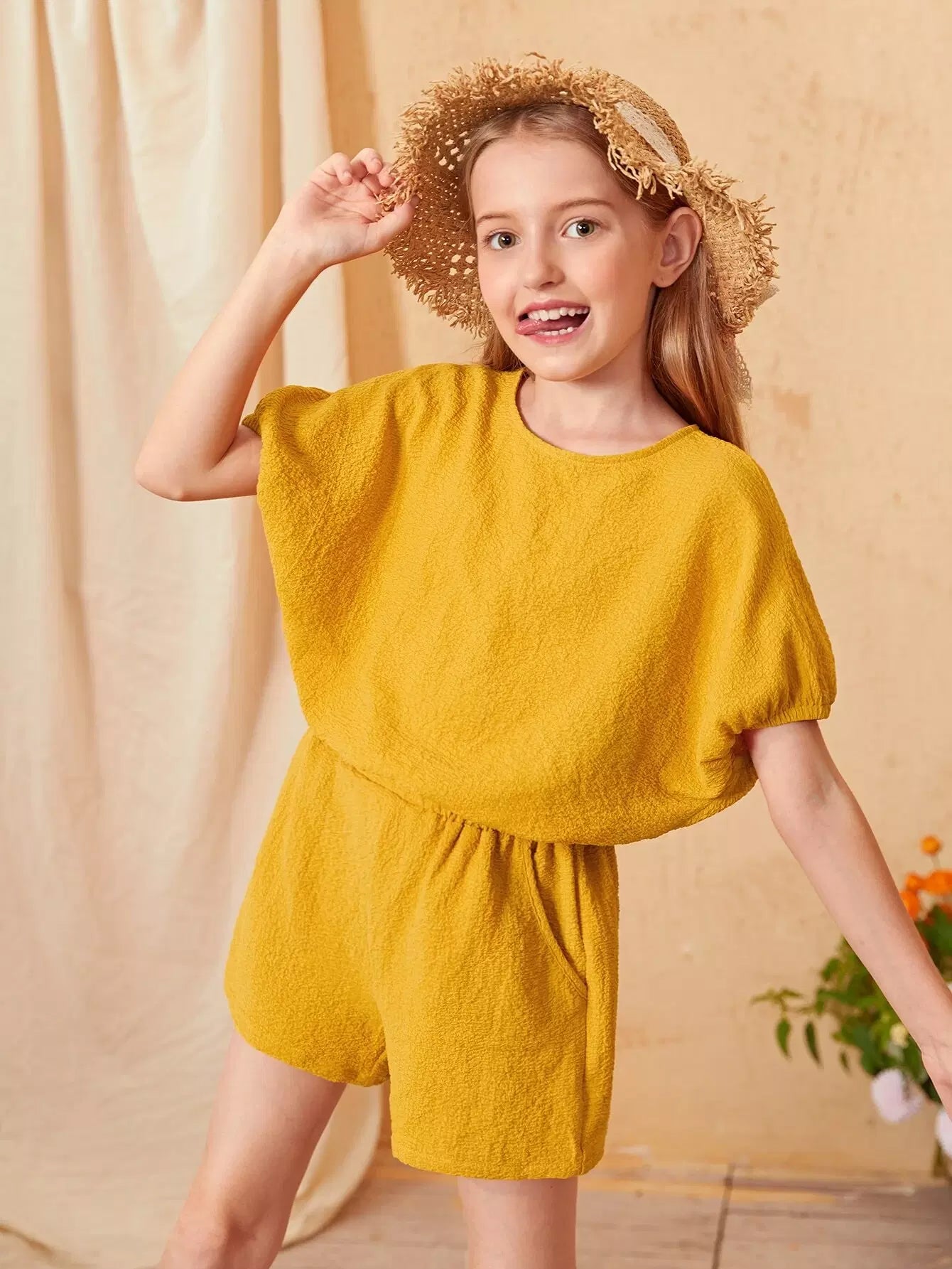 طقم شورت وقميص بأكمام خفاش وفتحة خلفية للفتيات