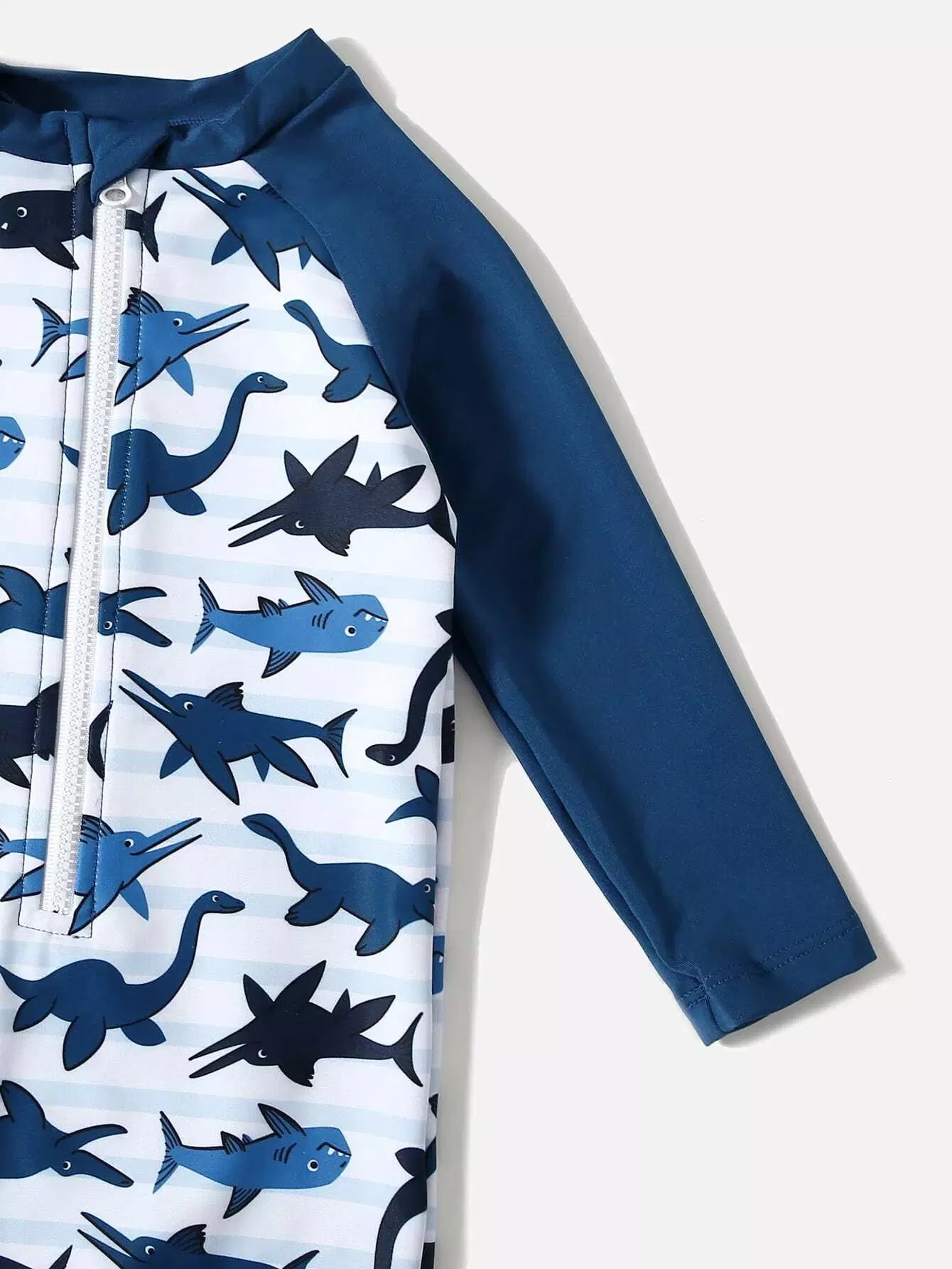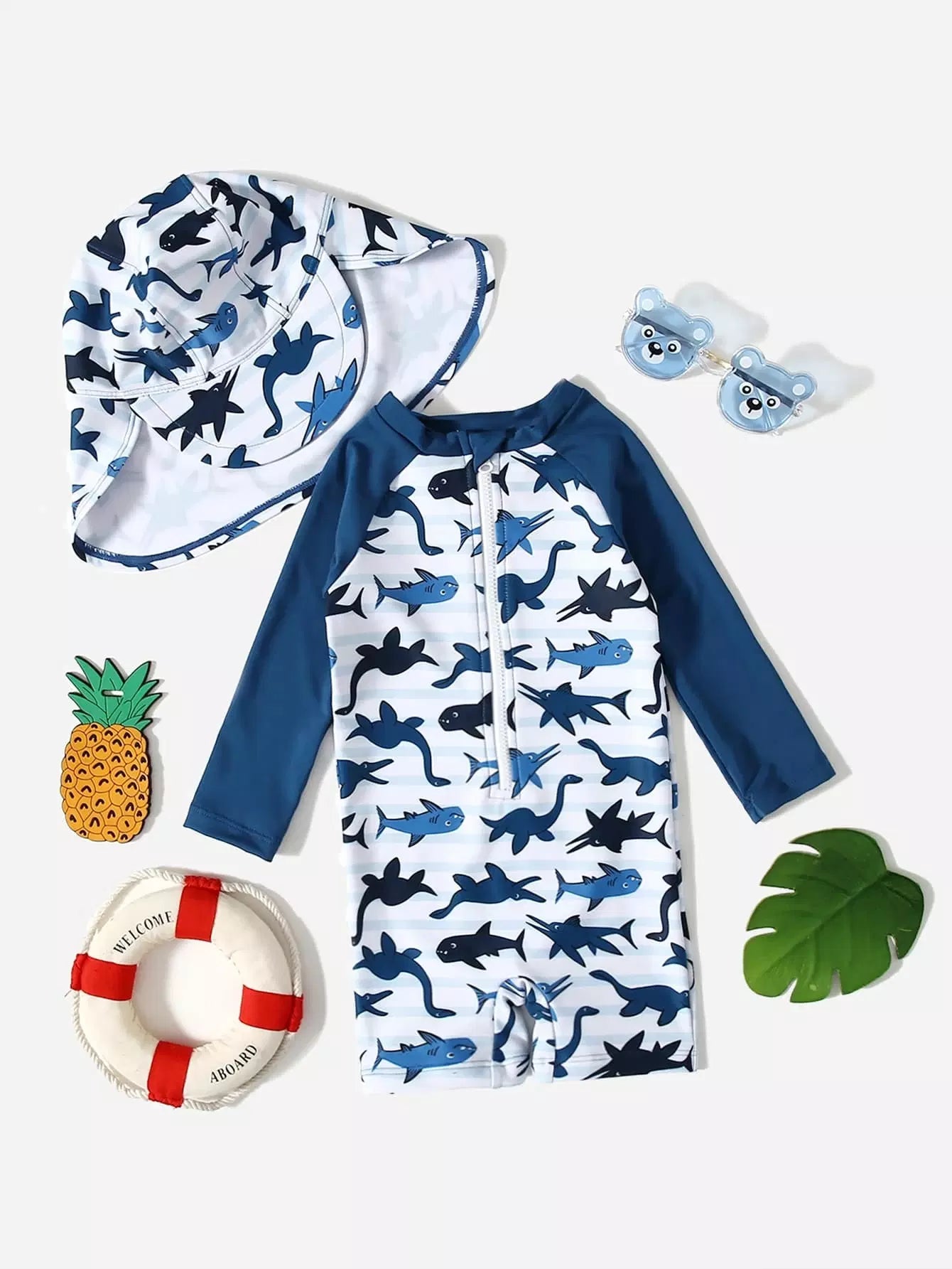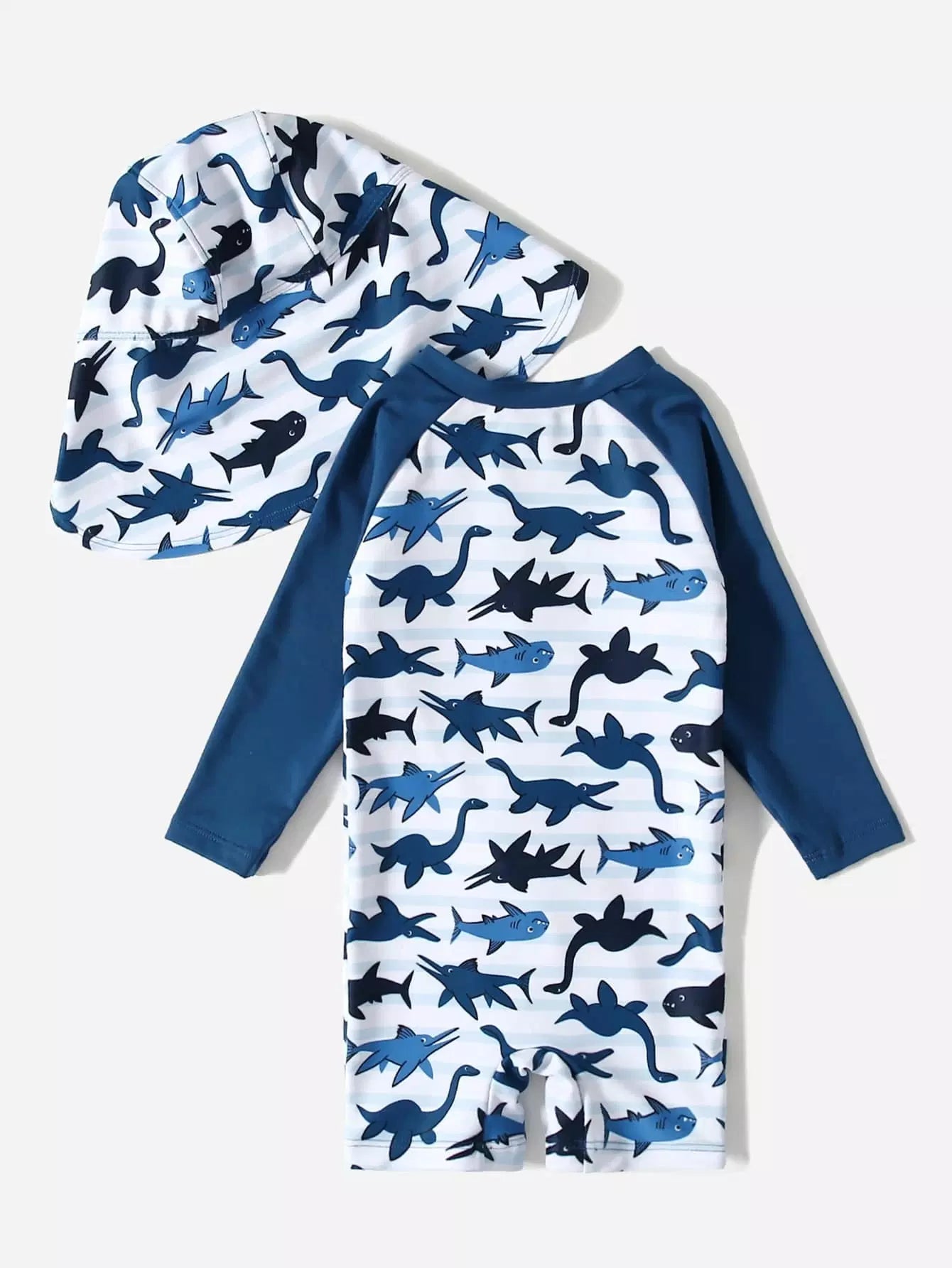 بدلة سباحة بقطعة واحدة بطبعة حيوانات للأطفال مع قبعة