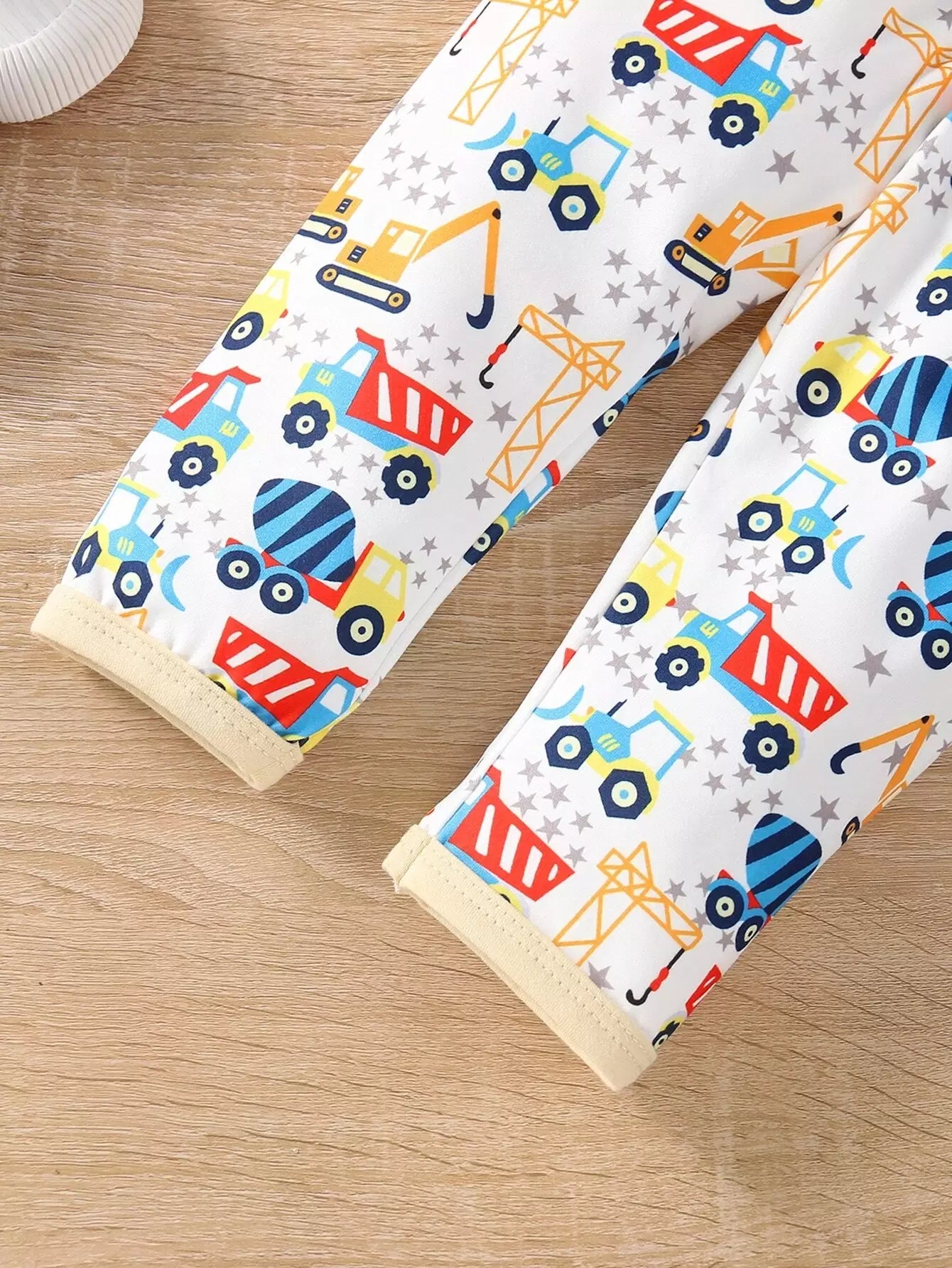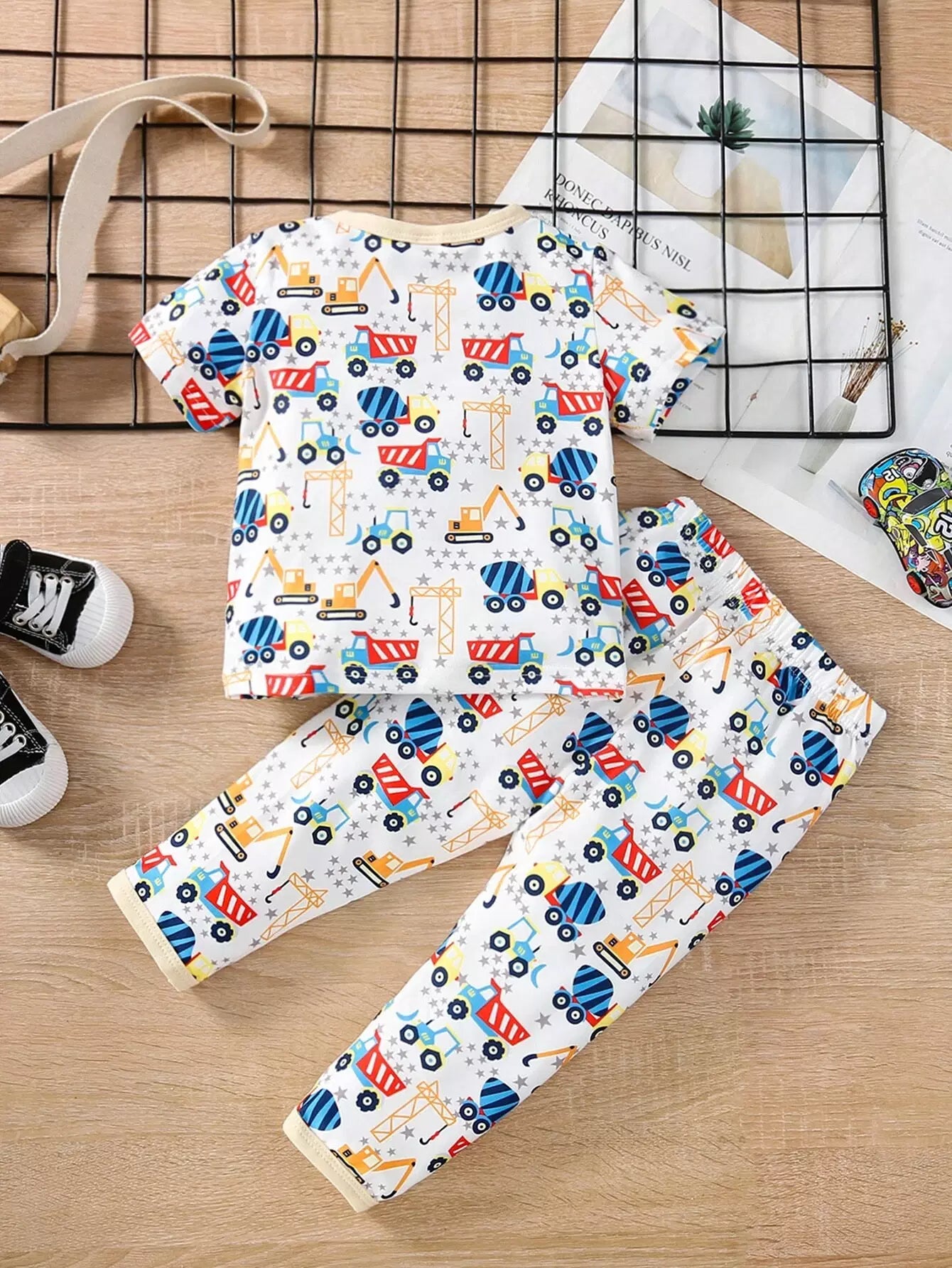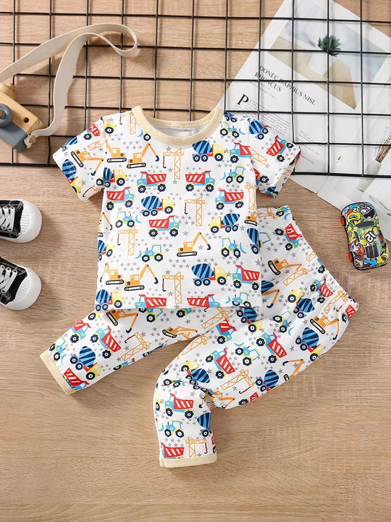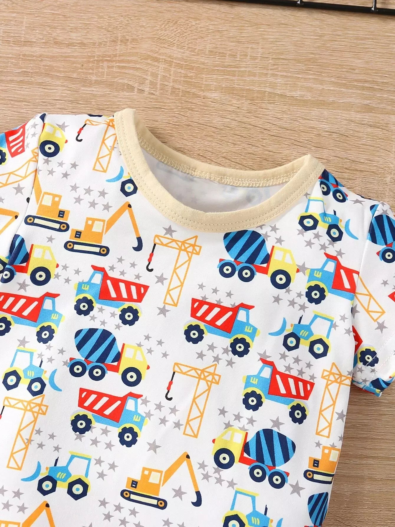 تي شيرت بطبعة حفارة كرتونية لطفل رضيع مع بنطلون