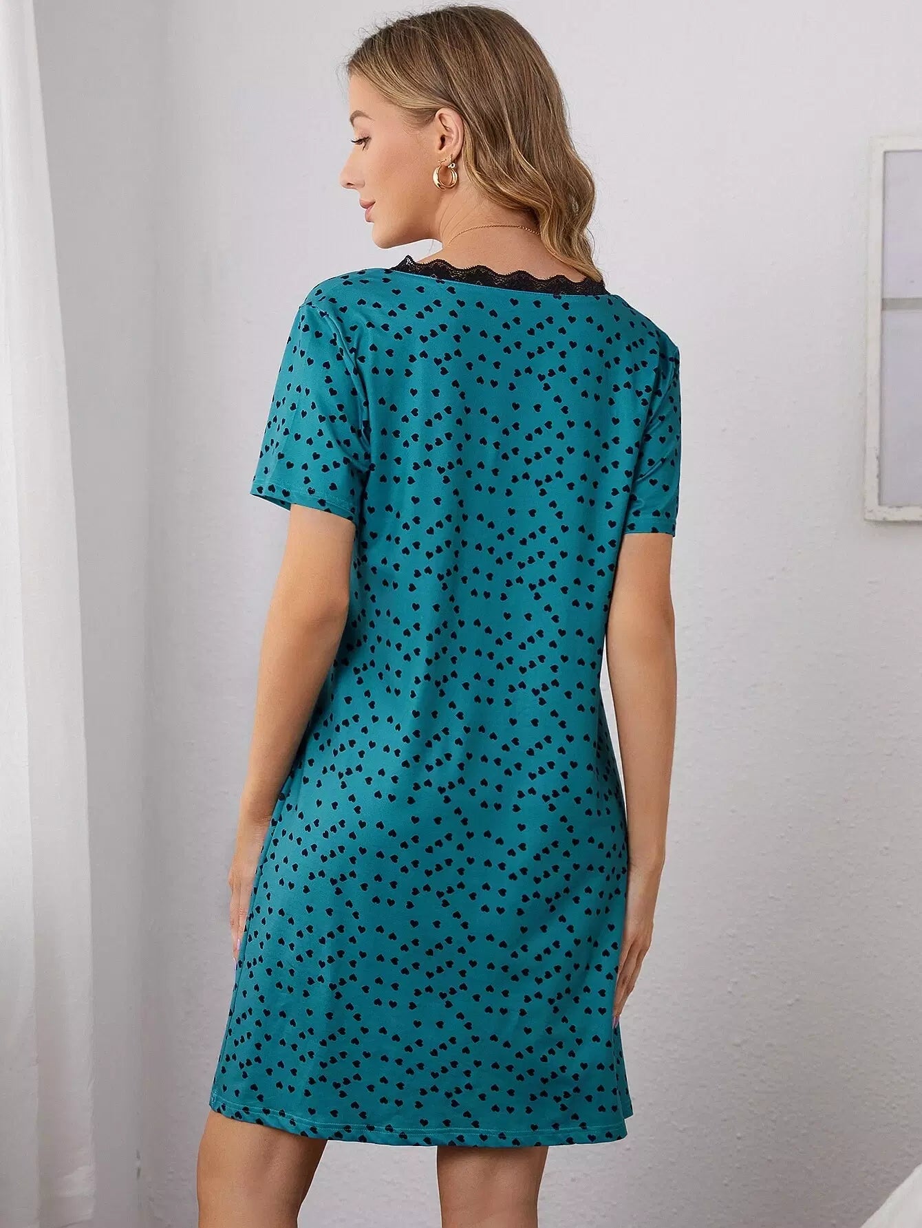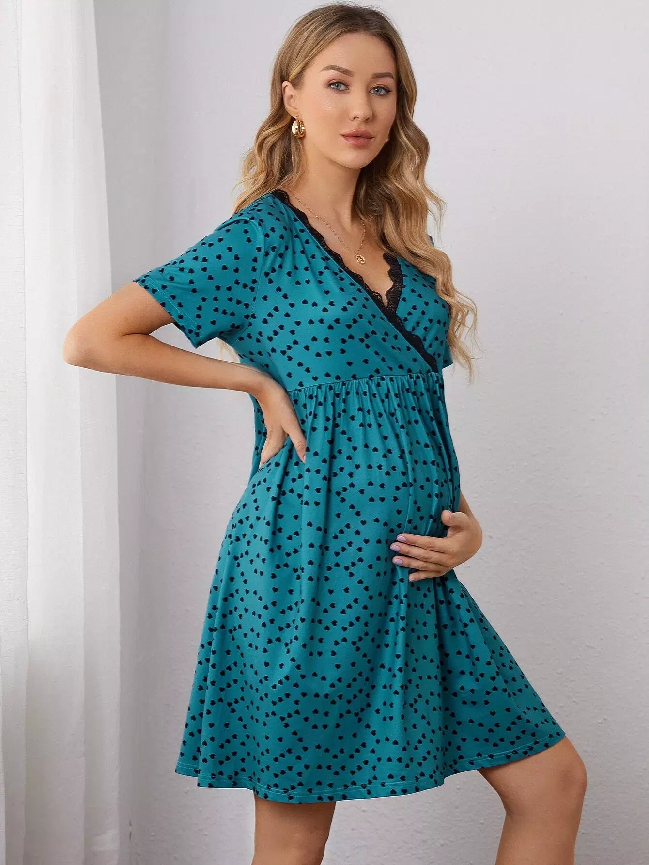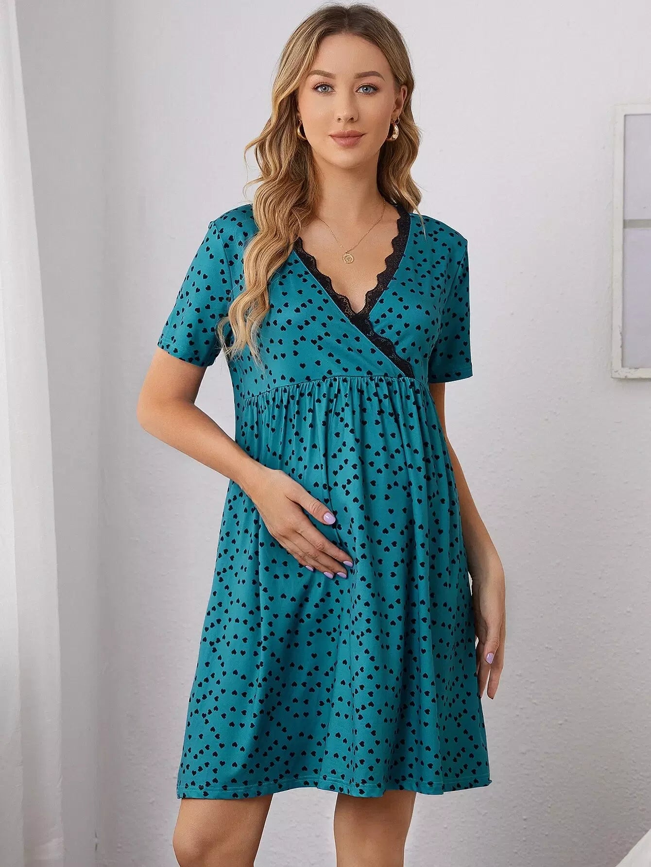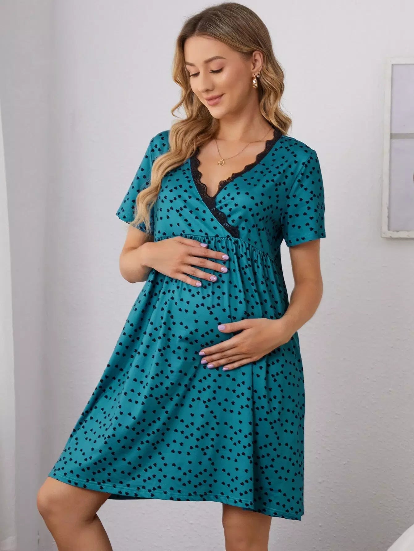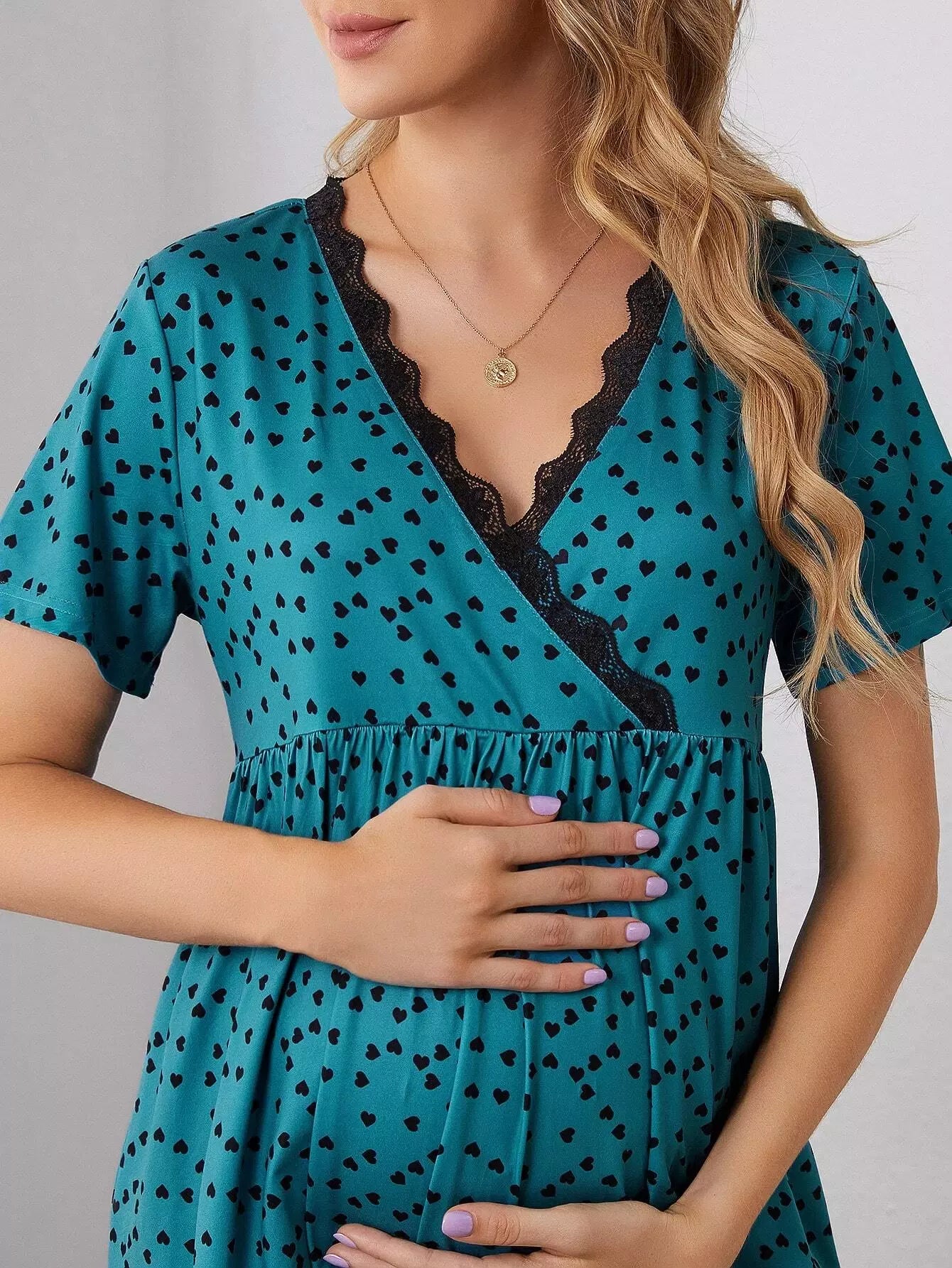 فستان نوم للحوامل بطبعة قلب كاملة وحواف من الدانتيل