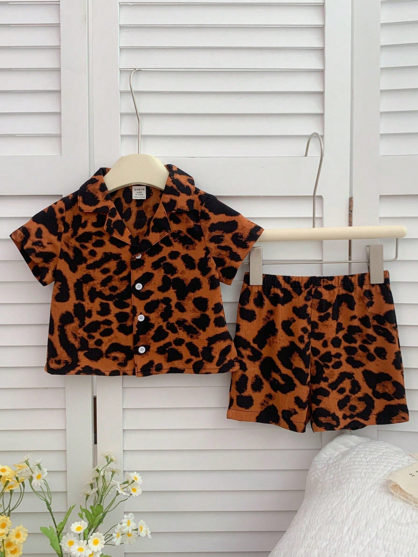 kids SHEIN 2pcs Baby Leopard Print Lapel Collar Short Sleeve Cardigan & Elastic Waist Shorts Set