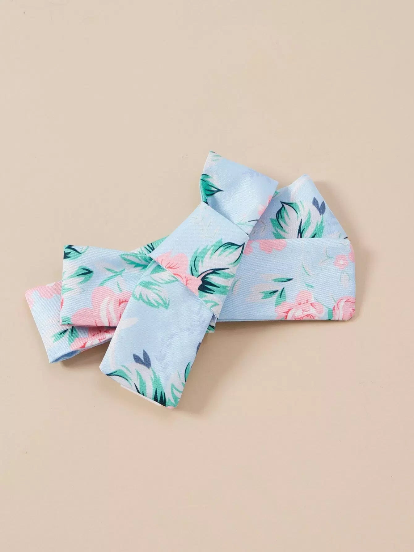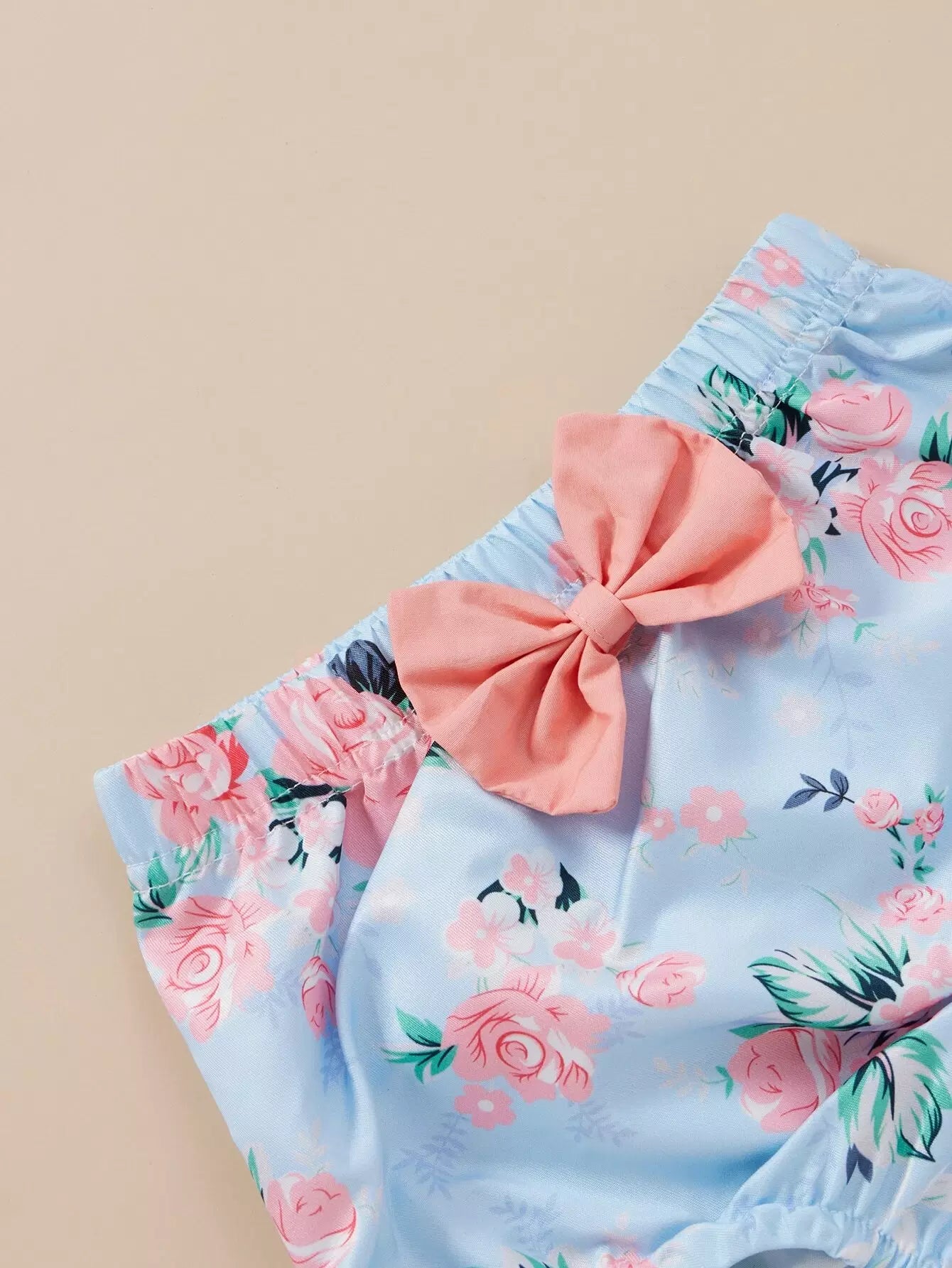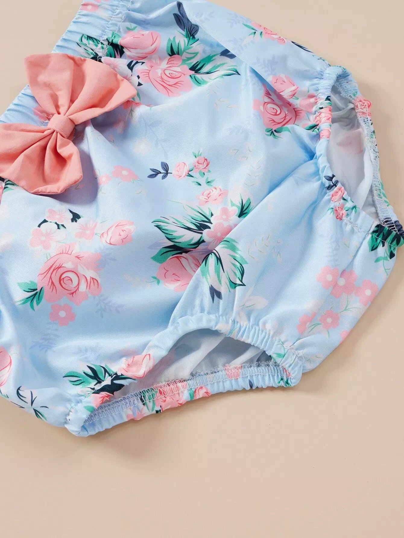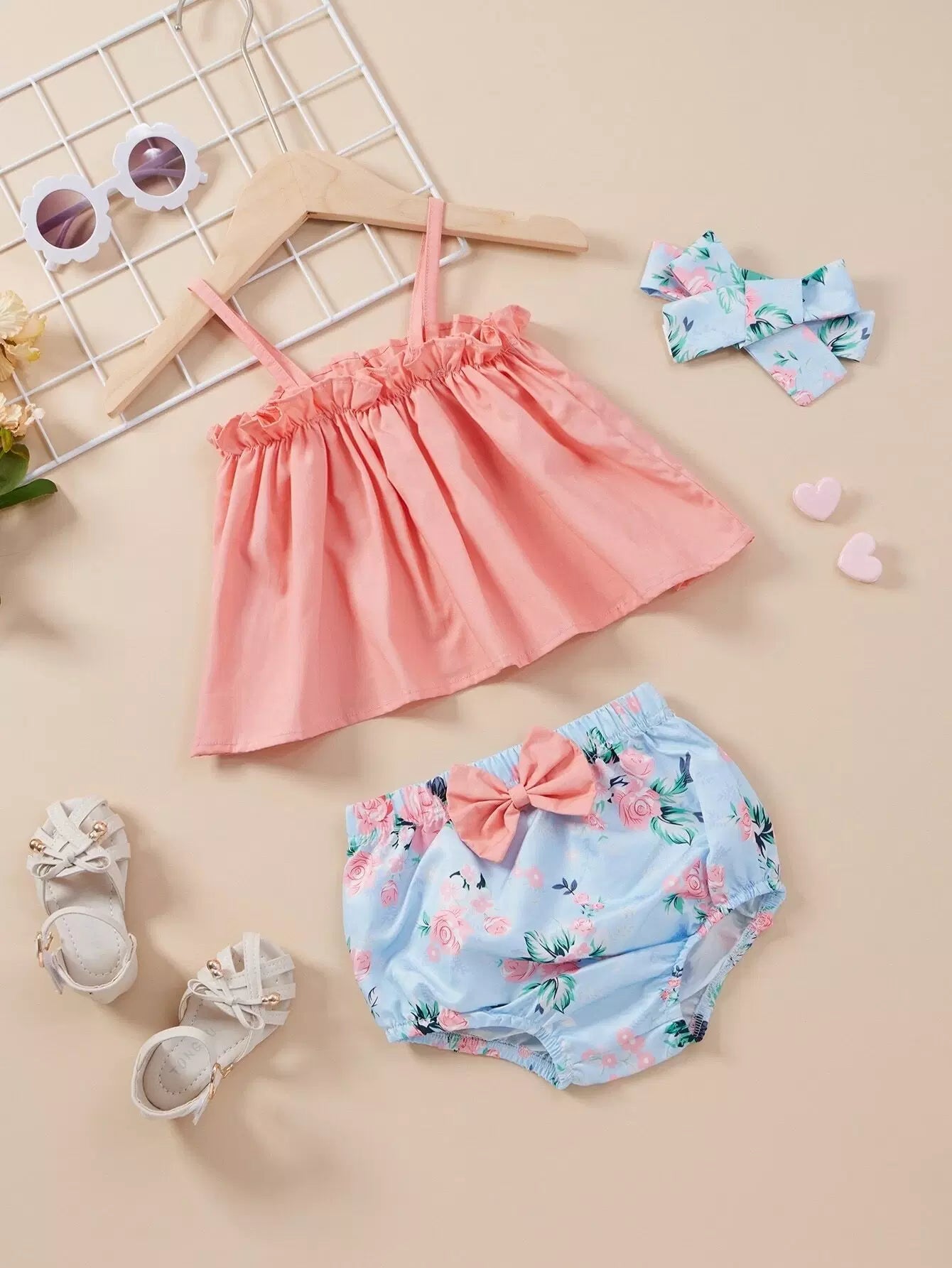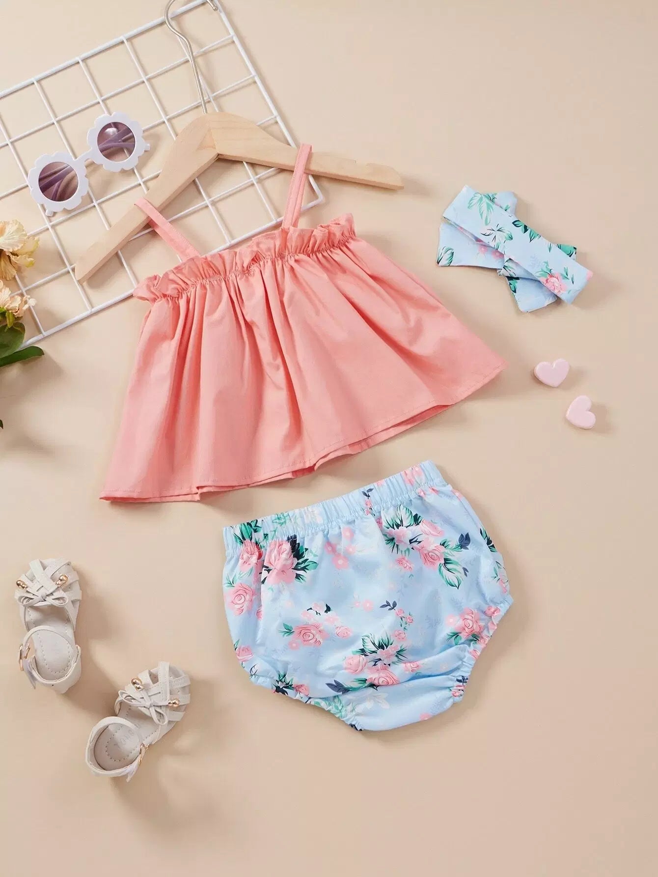 بلوزة كامي للطفلة الرضيعة وشورت قصير بطبعة زهور أمامية وعصابة رأس