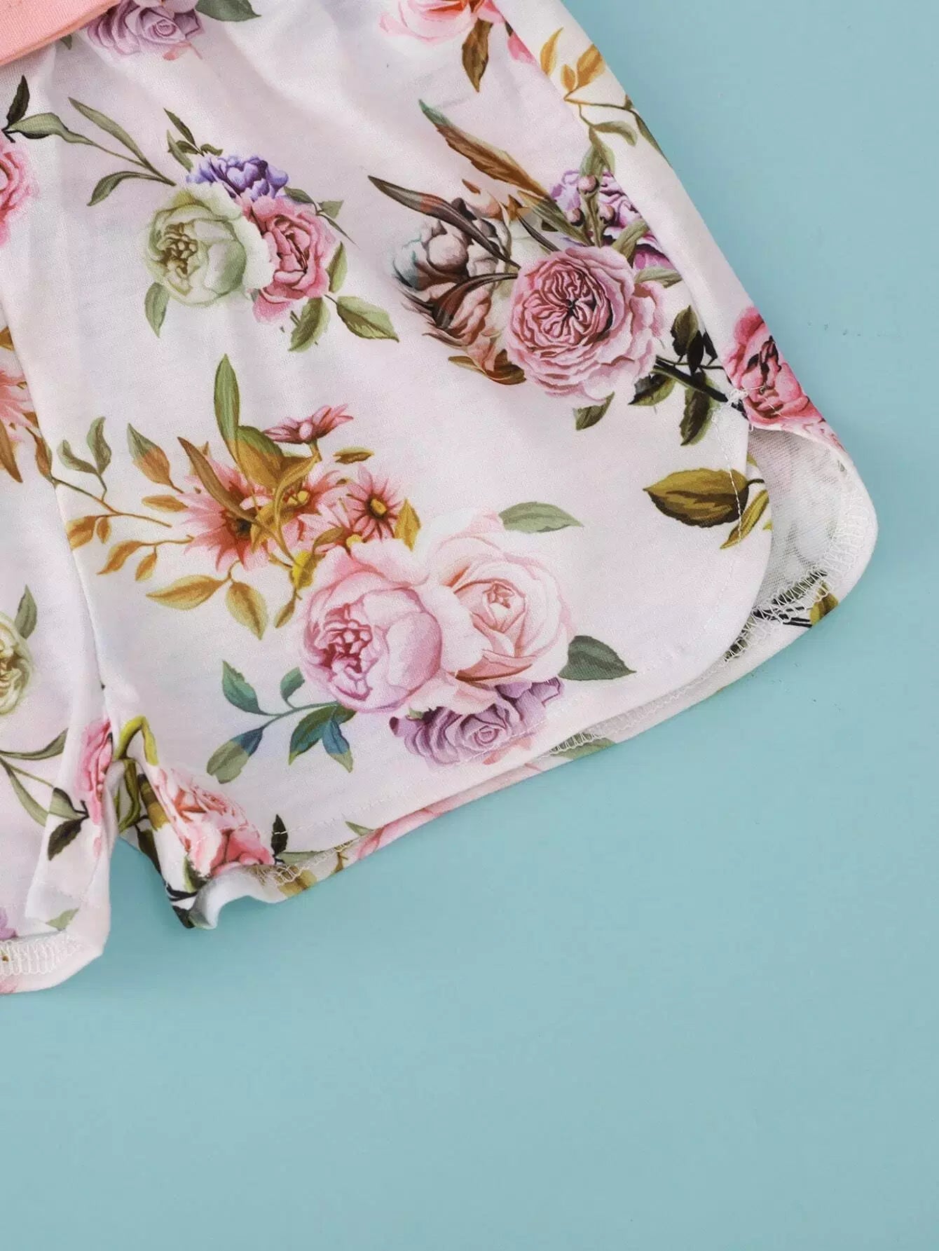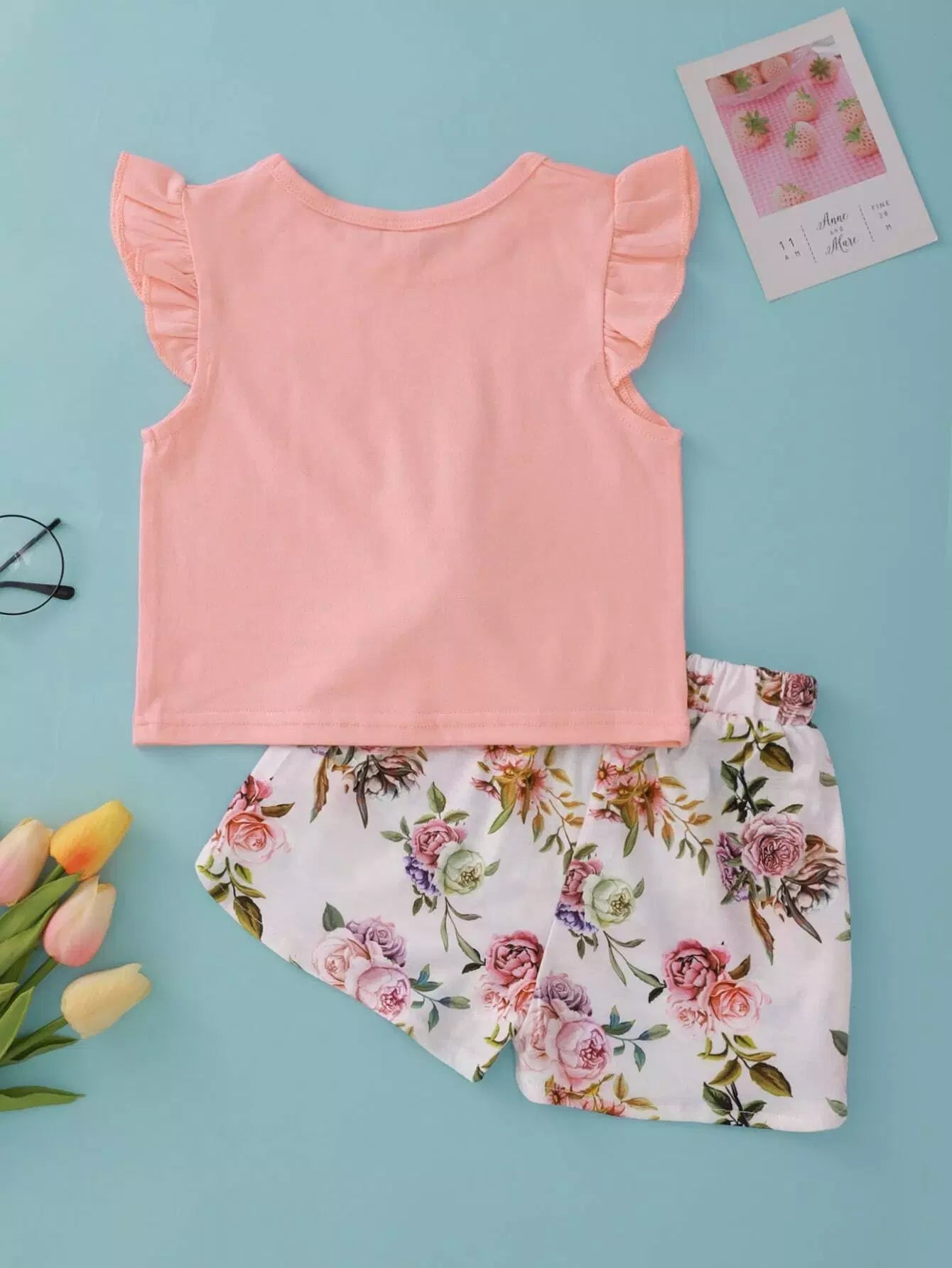 الأطفال - تي شيرت برسومات شعار للفتيات الصغيرات مع شورت مزين بالزهور
