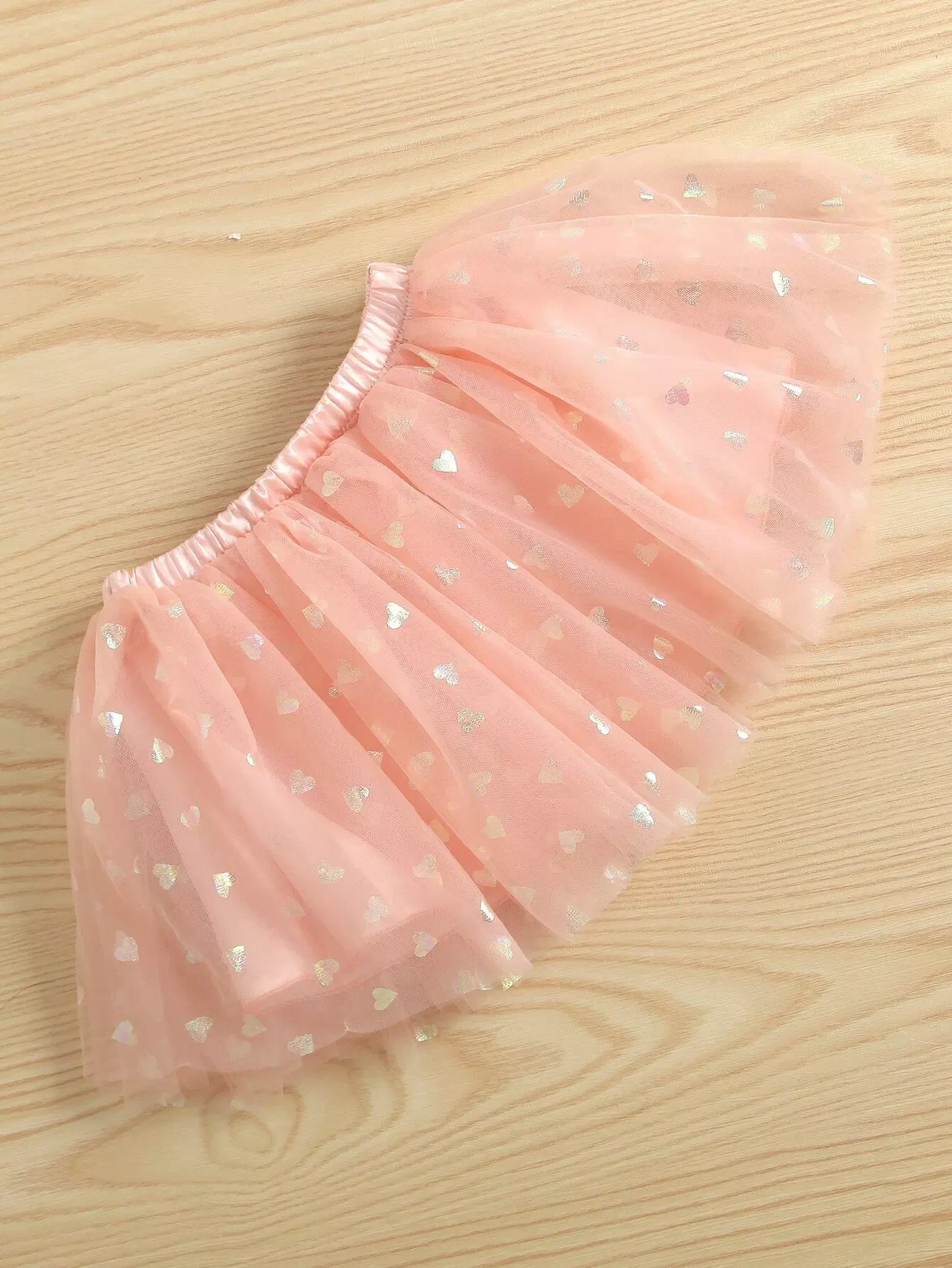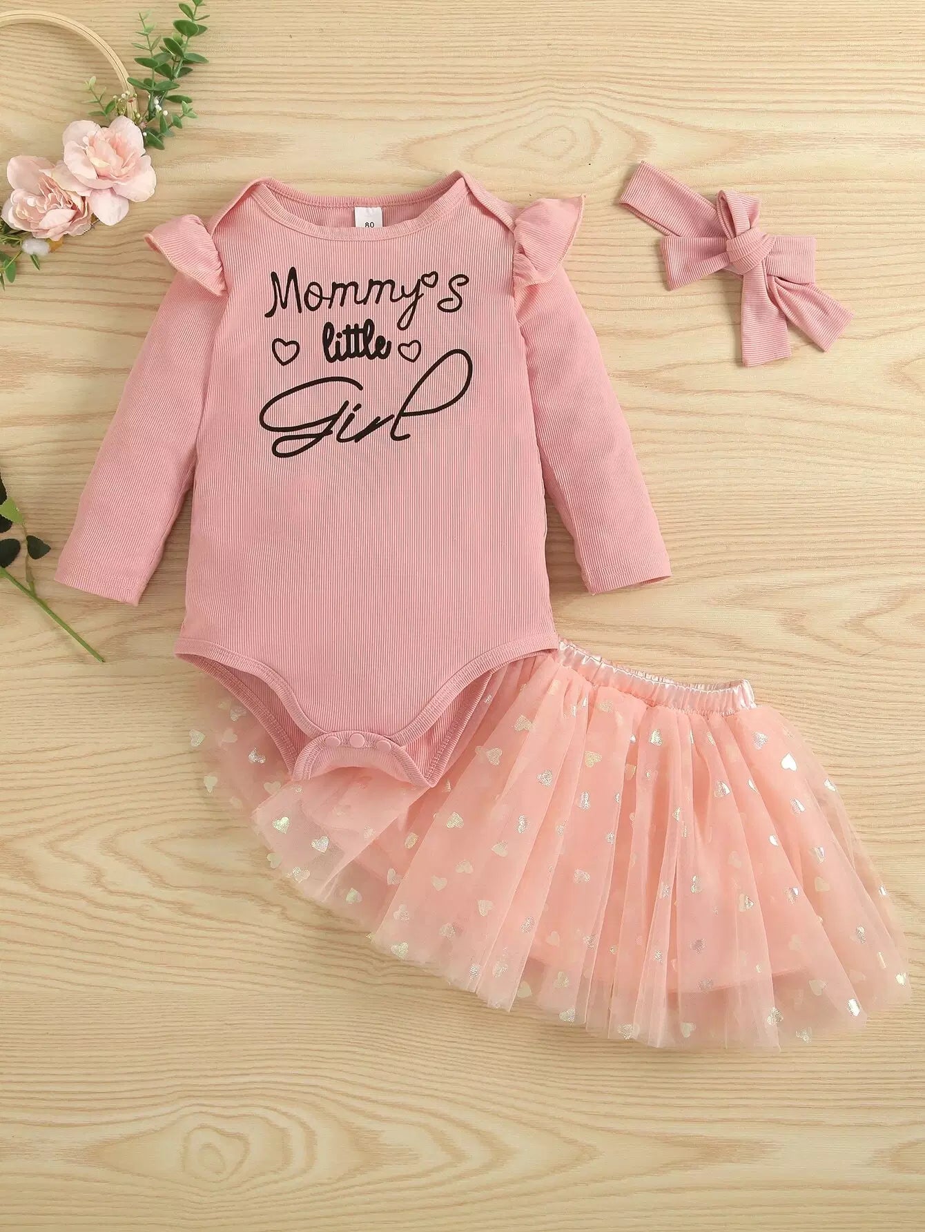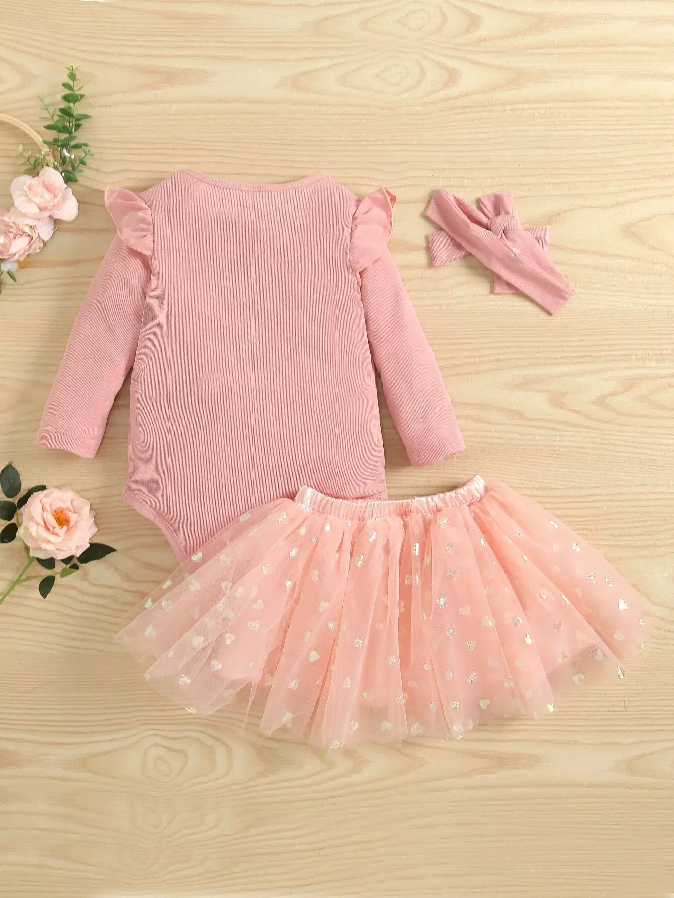 لباس قطعة واحدة لطفل رضيع مزين برسومات حروف على شكل كشكش وتنورة شبكية على شكل قلب مع عصابة للرأس