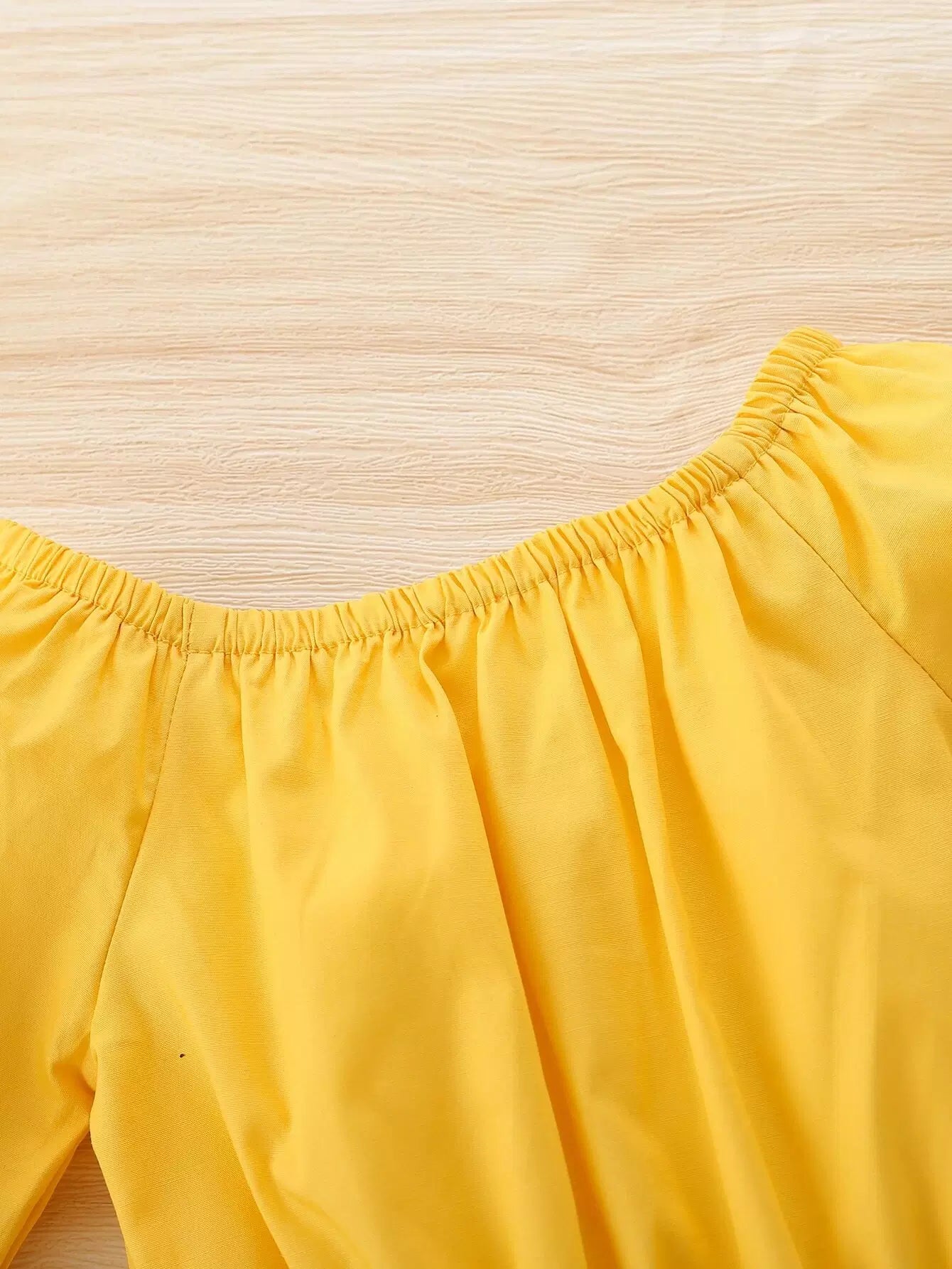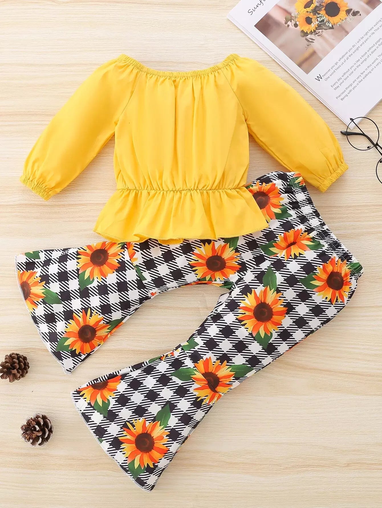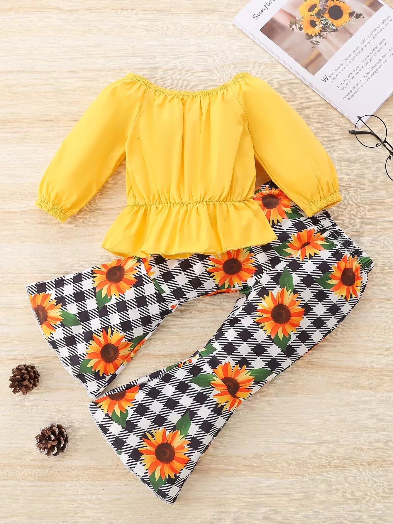 الأطفال - طقم ملابس علوية للأطفال بأكمام مكشكشة مكشوفة الكتفين وسروال واسع منقوش بطباعة عباد الشمس