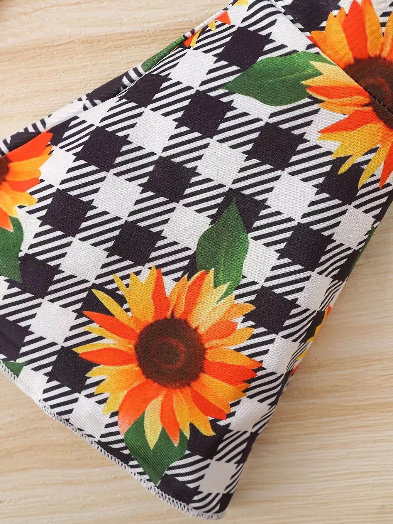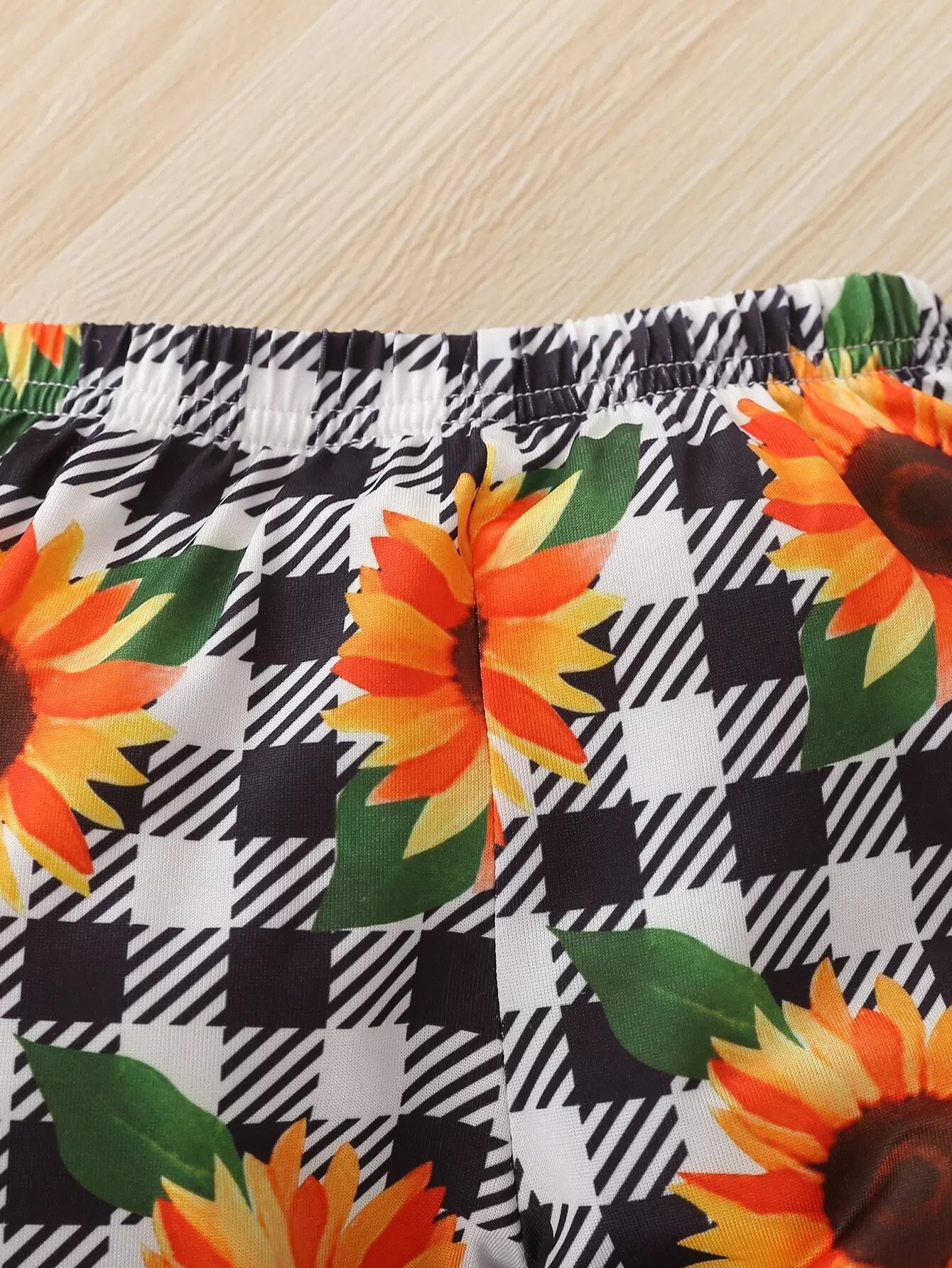 طقم بلوزة مكشكشة بحواف مكشكشة بدون أكتاف وبنطال واسع منقوش بطبعة عباد الشمس