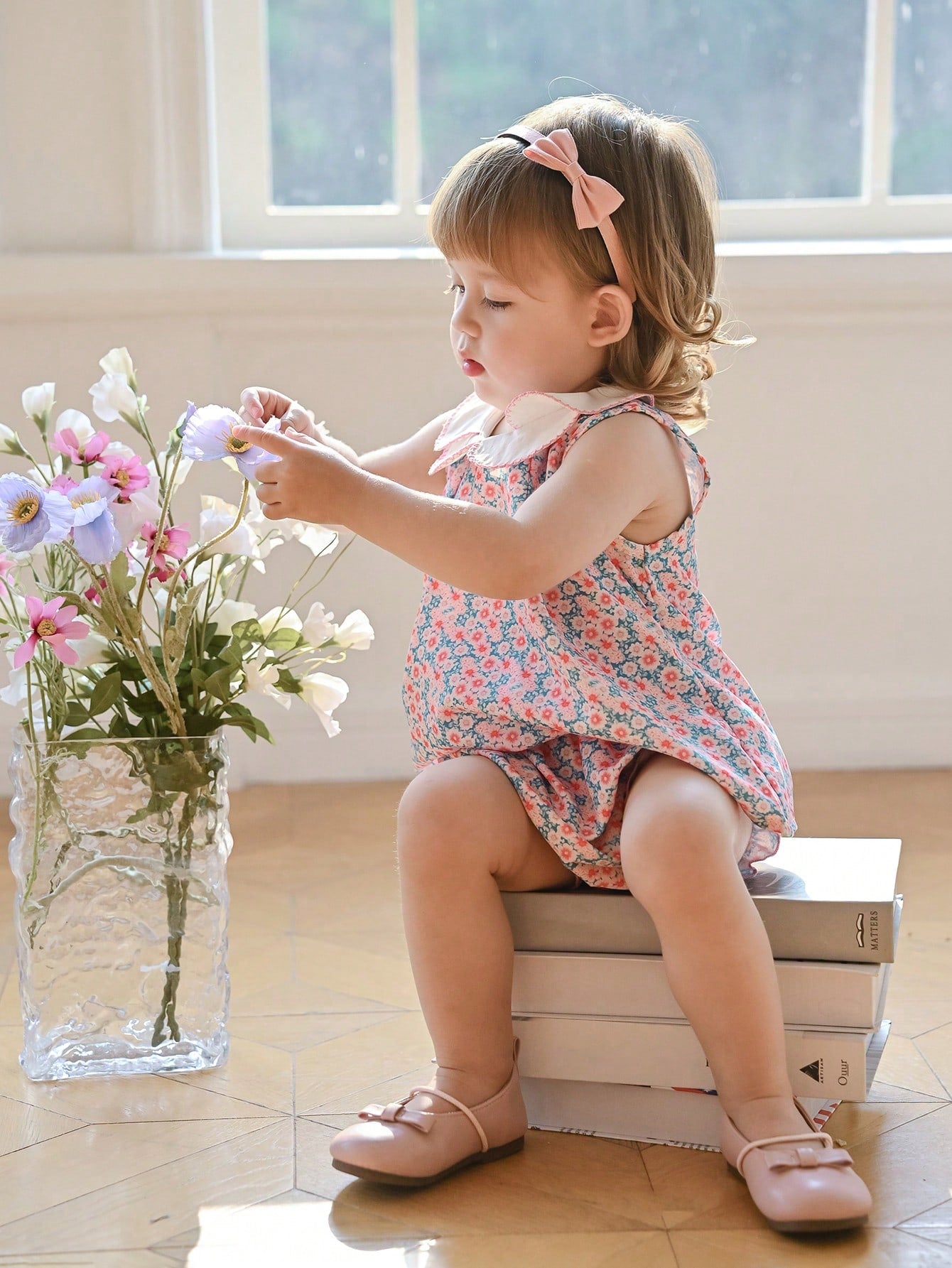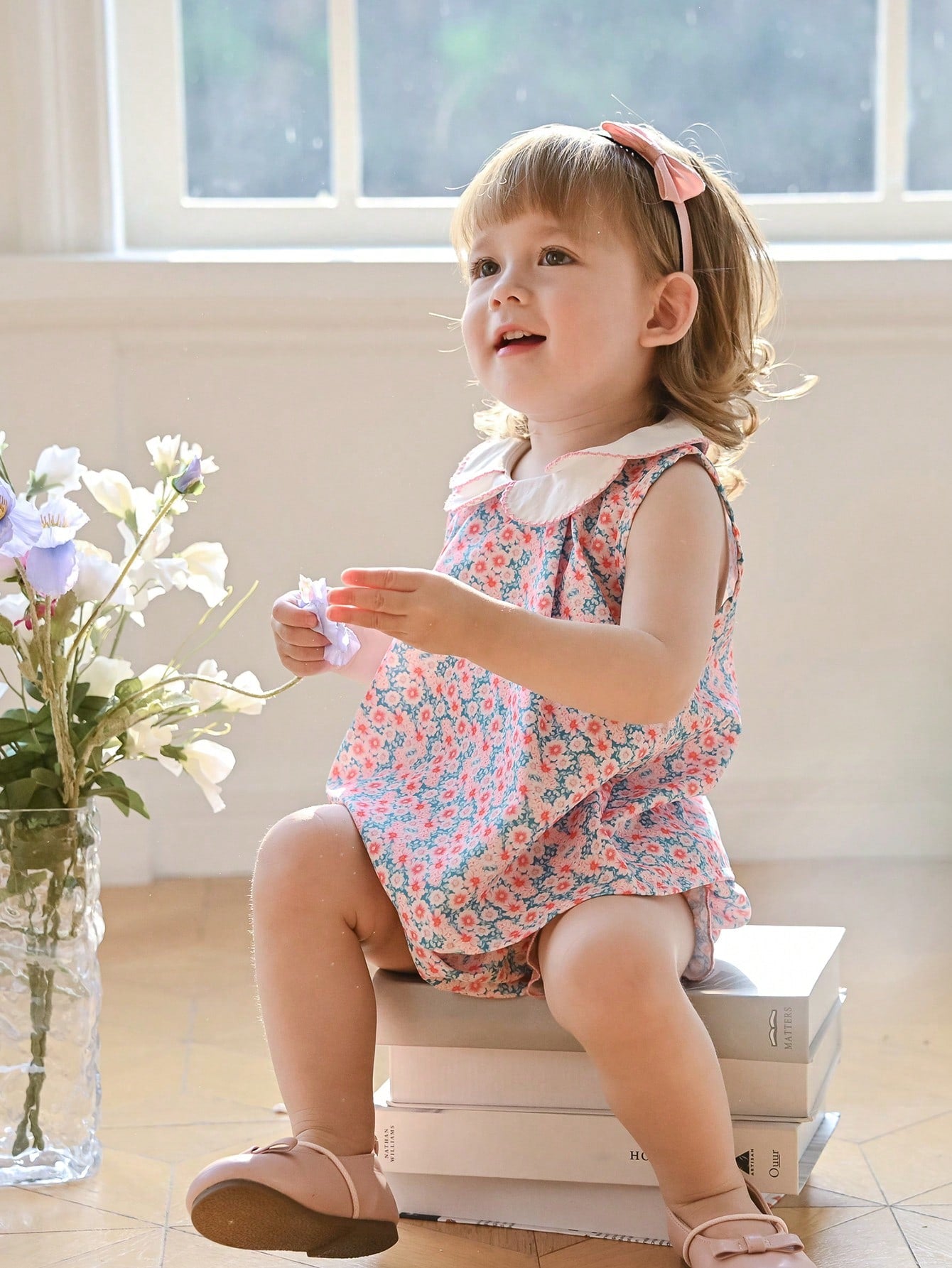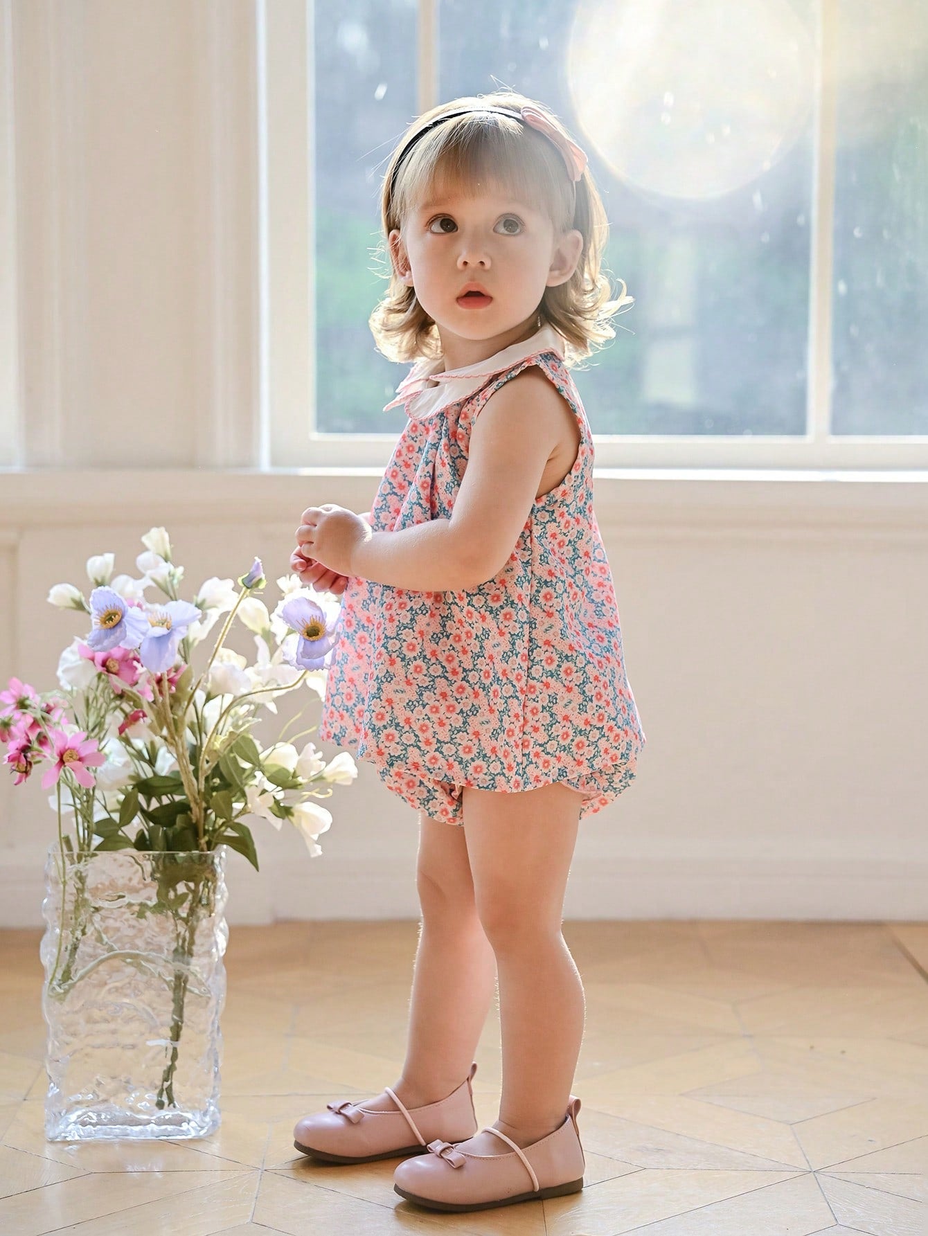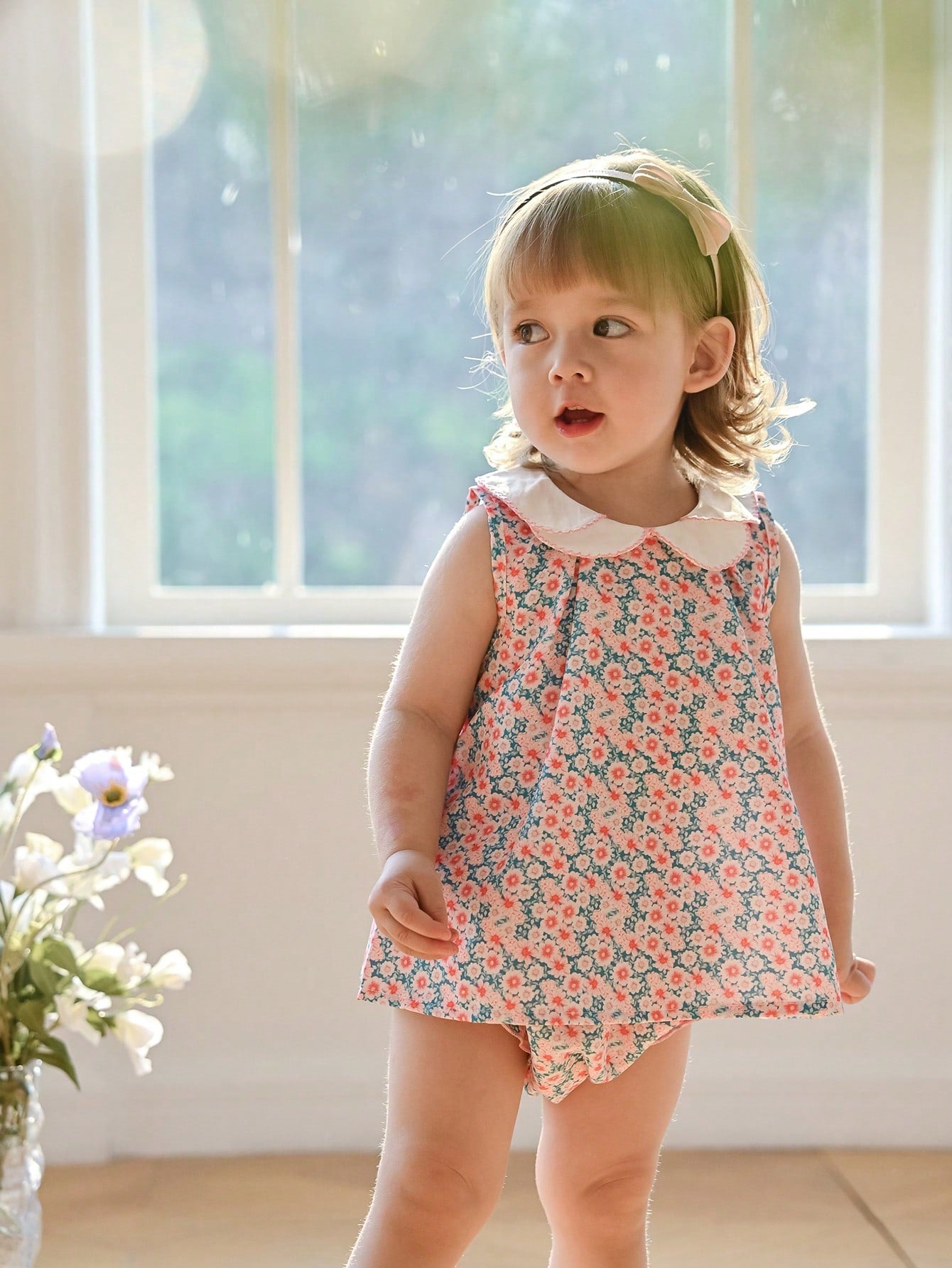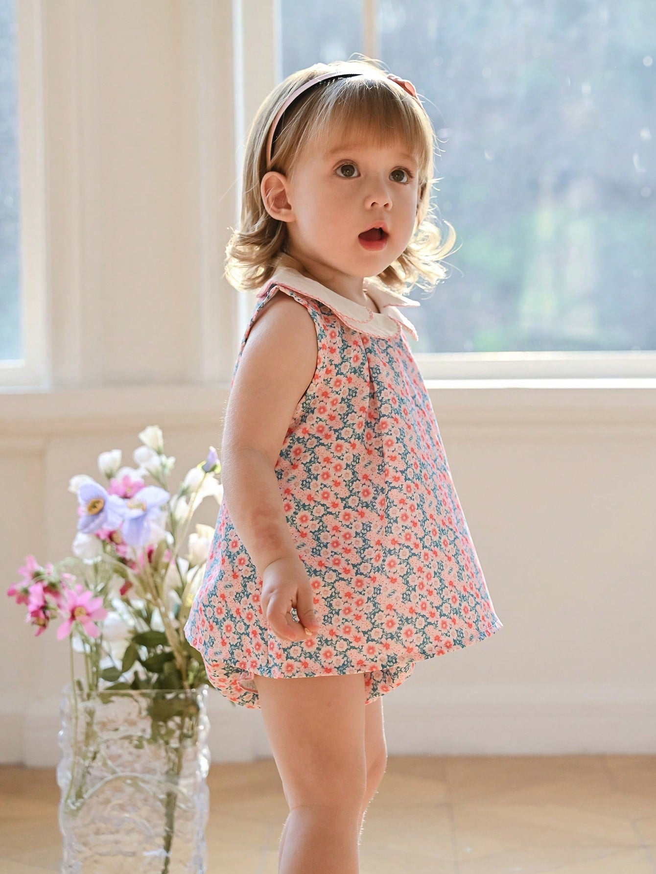 Souflis Souflis New Summer Baby Girls 2pcs Set French Holiday Style Dog Tooth Ruffled Collar Ditsy Floral