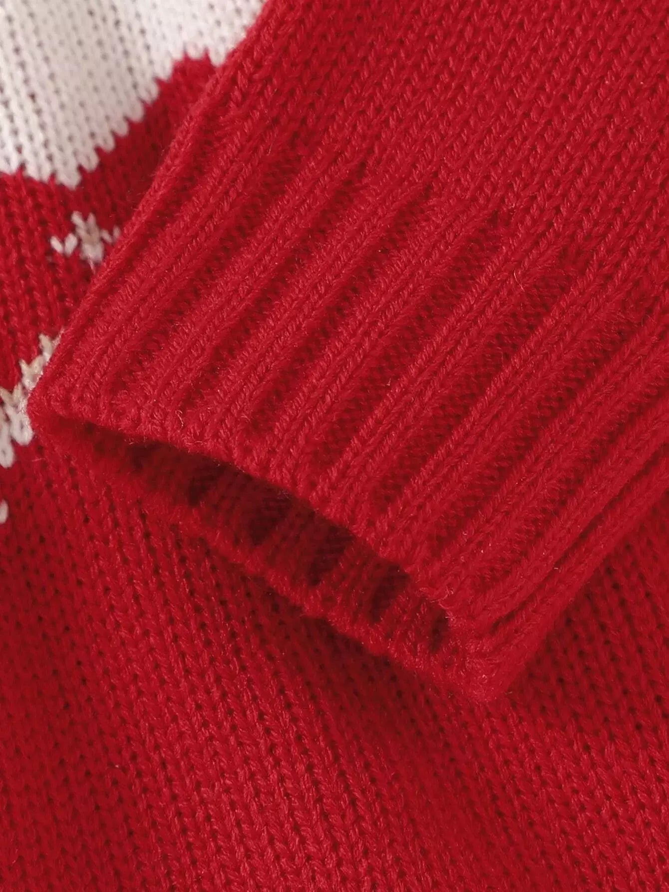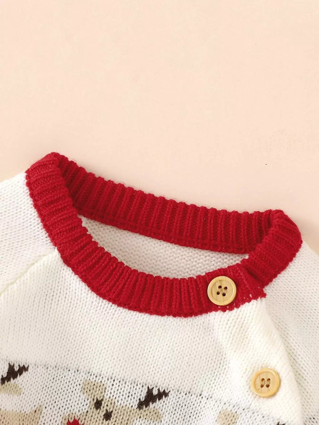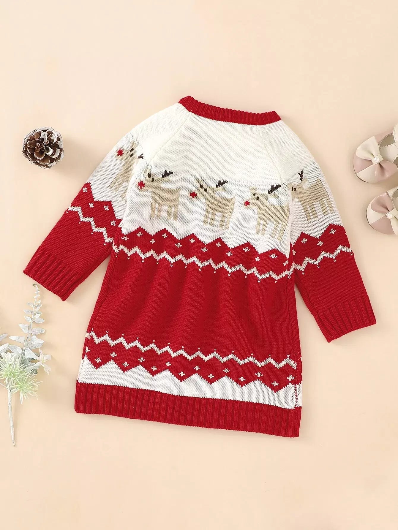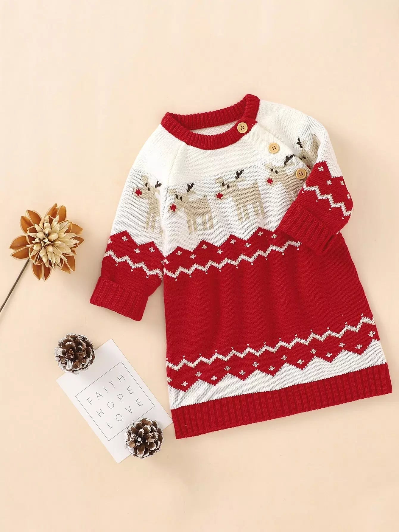 فستان محبوك بتفاصيل الأزرار بنقشة عيد الميلاد للأطفال