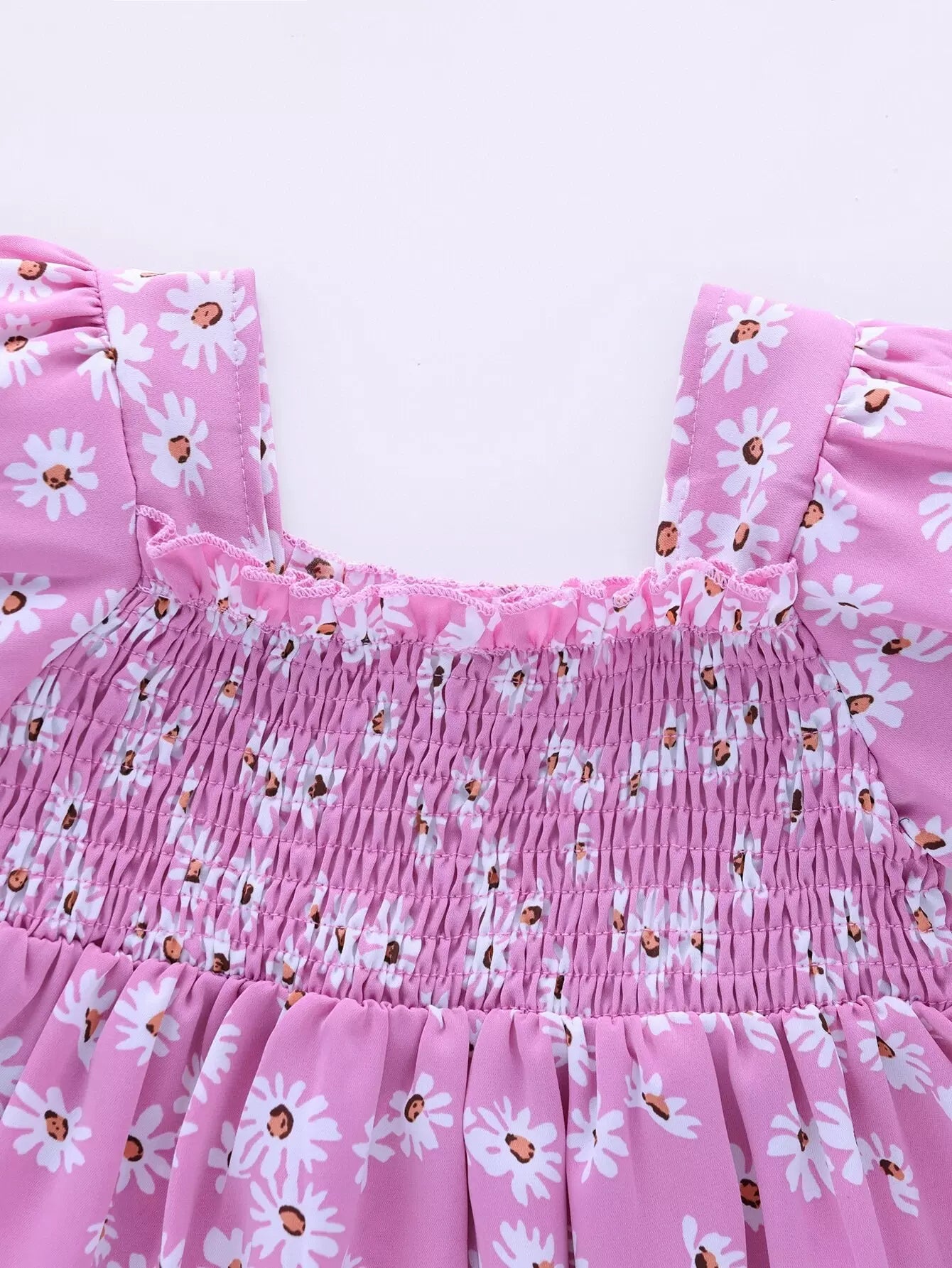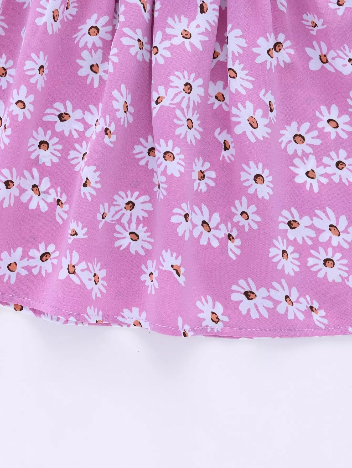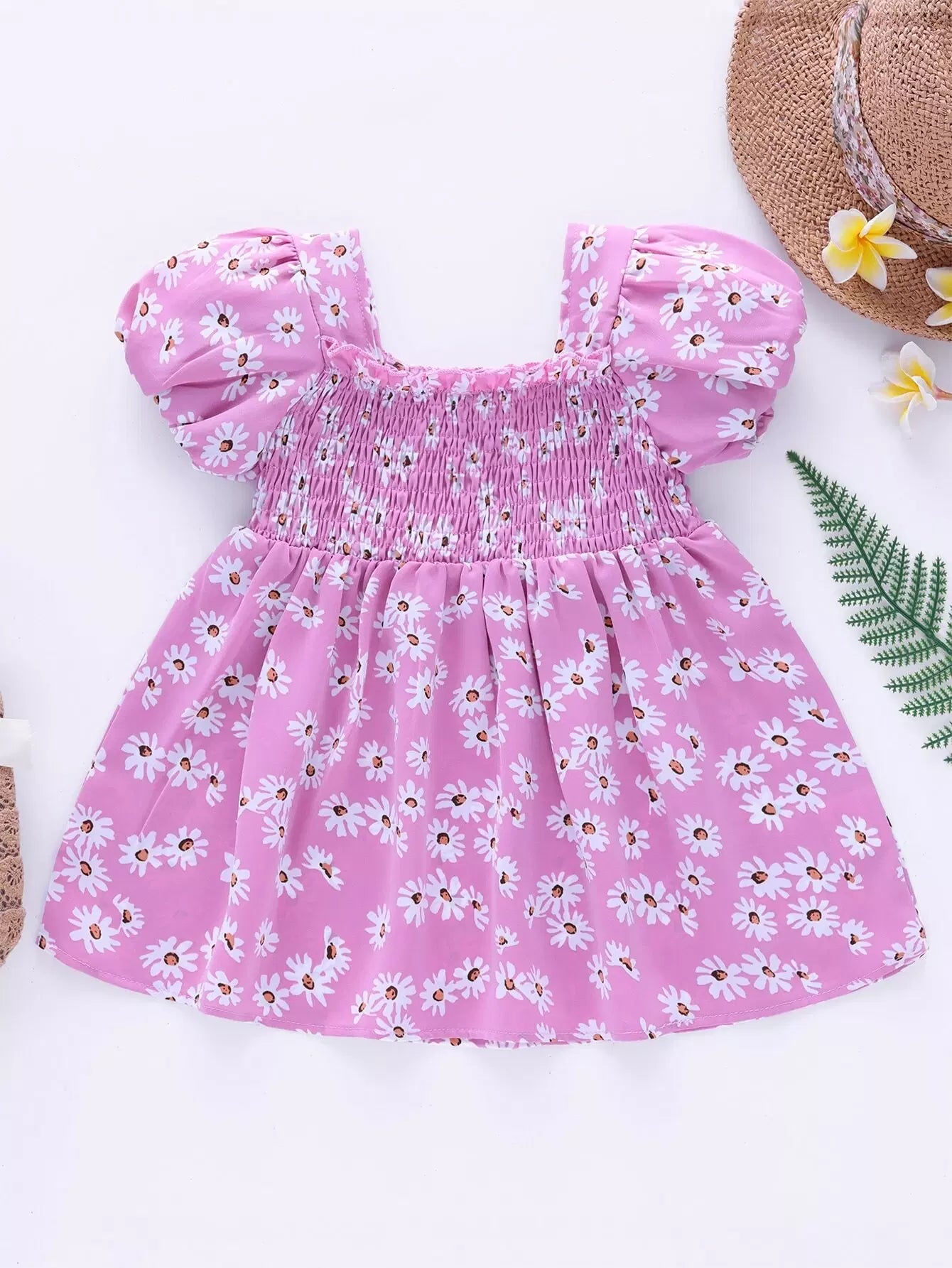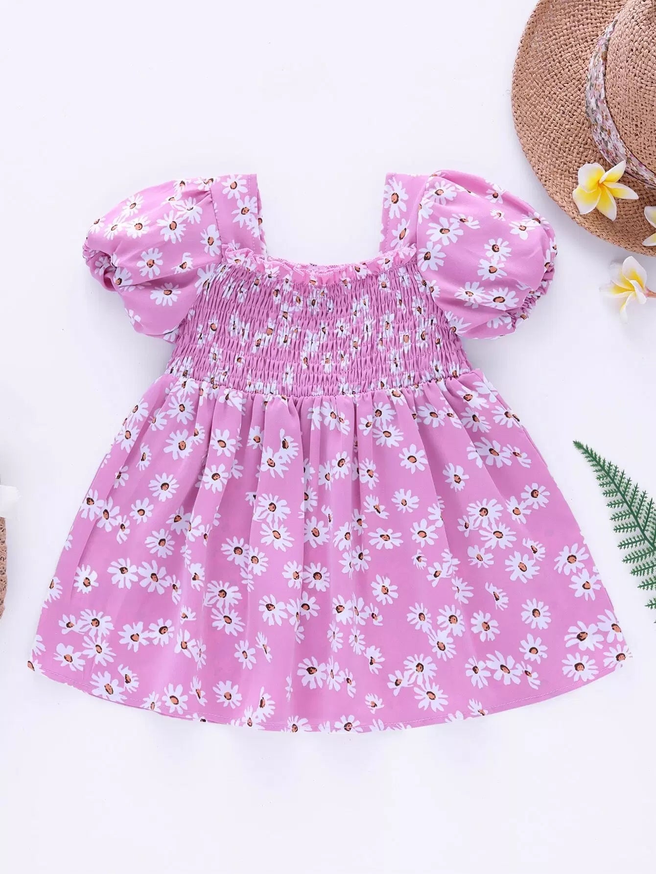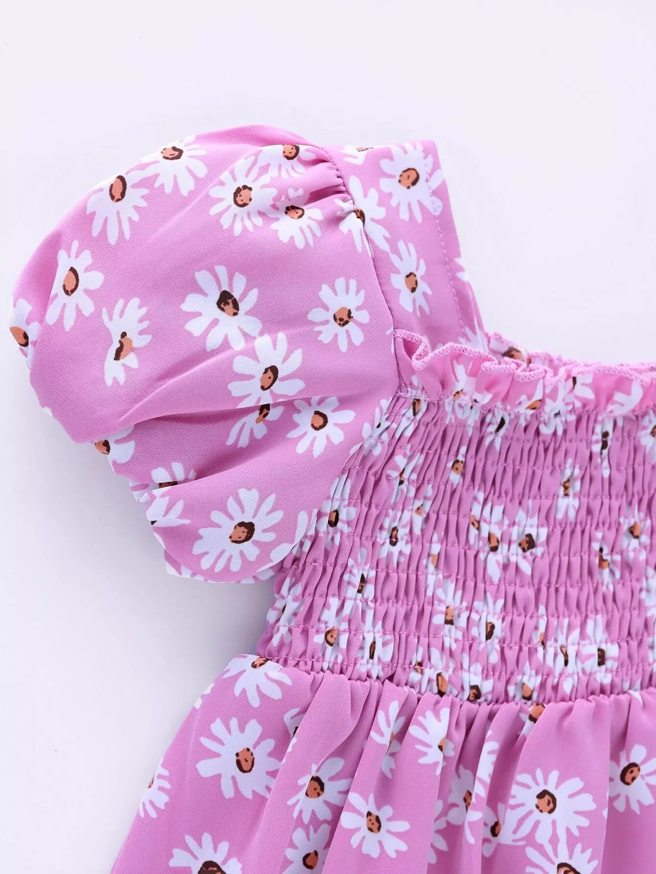فستان طفل رضيع مطبوع بطبعة زهور على الصدرية بشريط على شكل زهور