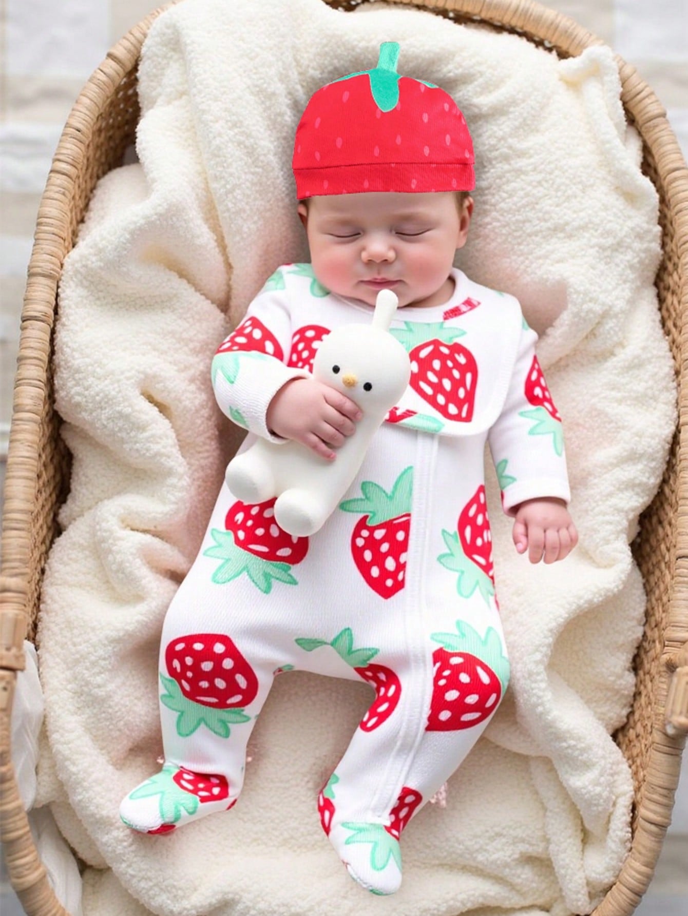 3pcs Newborn Outfit Set: Footie Jumpsuit, Cute Strawberry Print Hat, Bib, All-Over Strawberry Print,