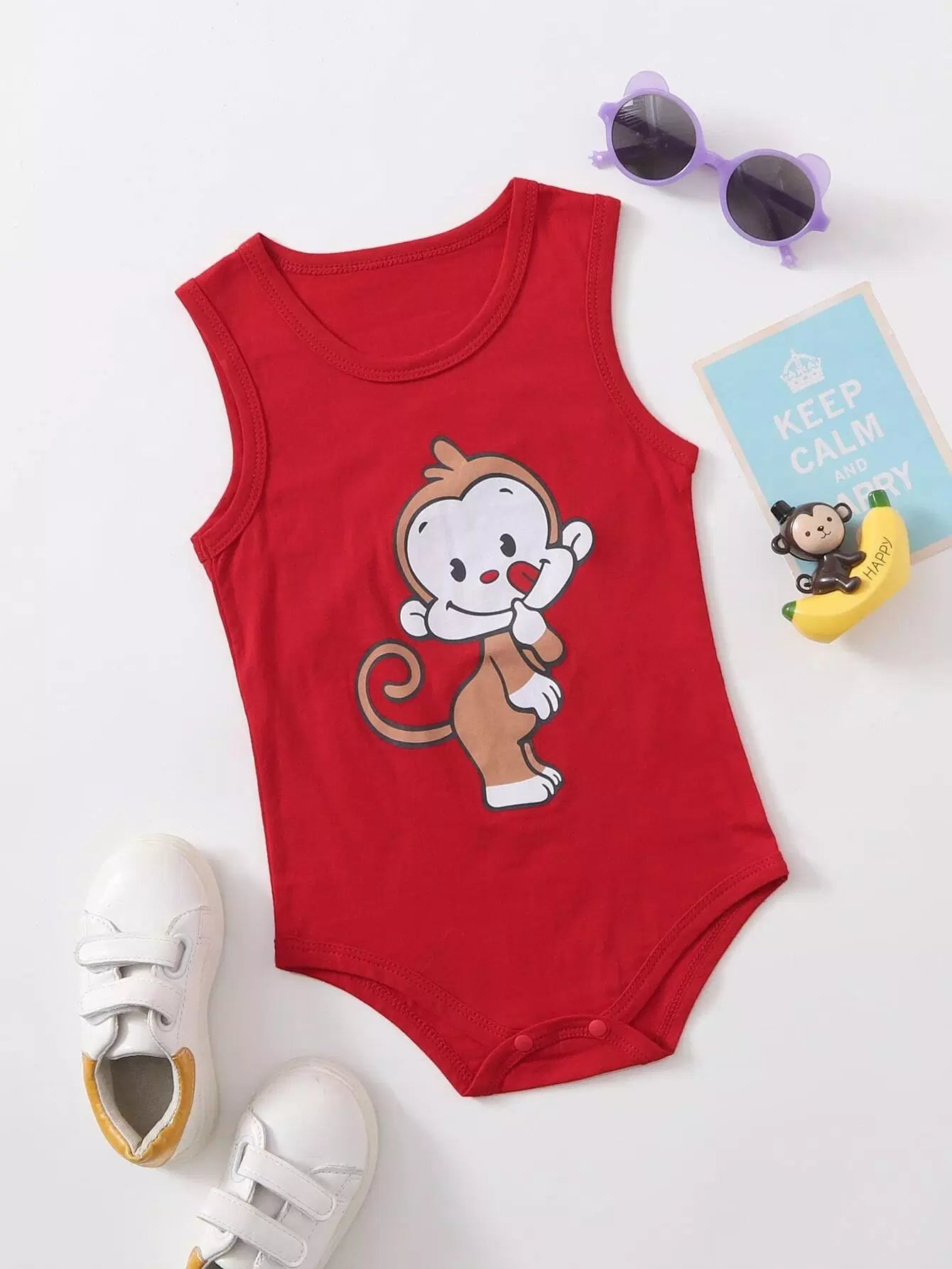لباس قطعة قميص بدون أكمام بنقشة قرد كرتوني لطفل رضيع