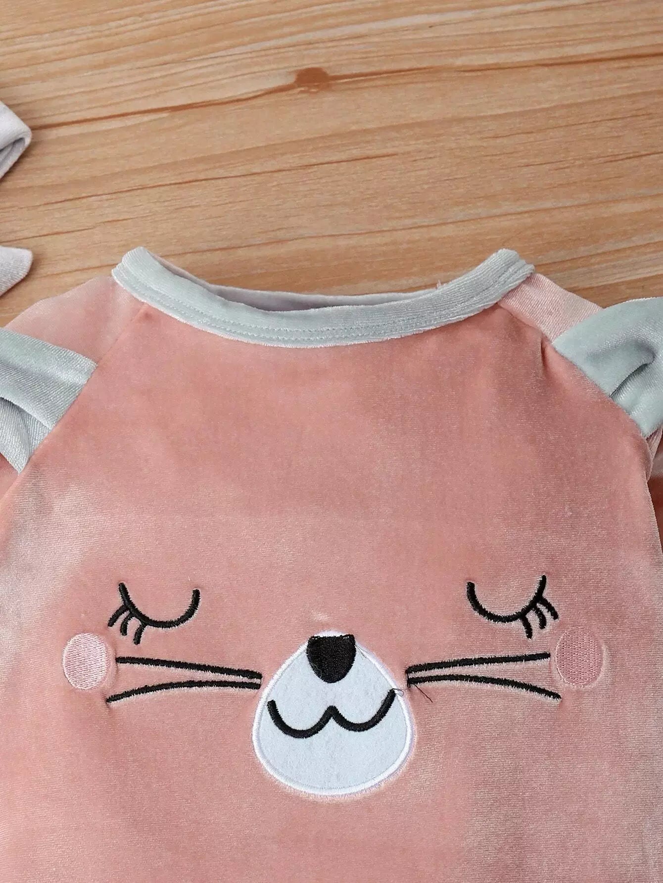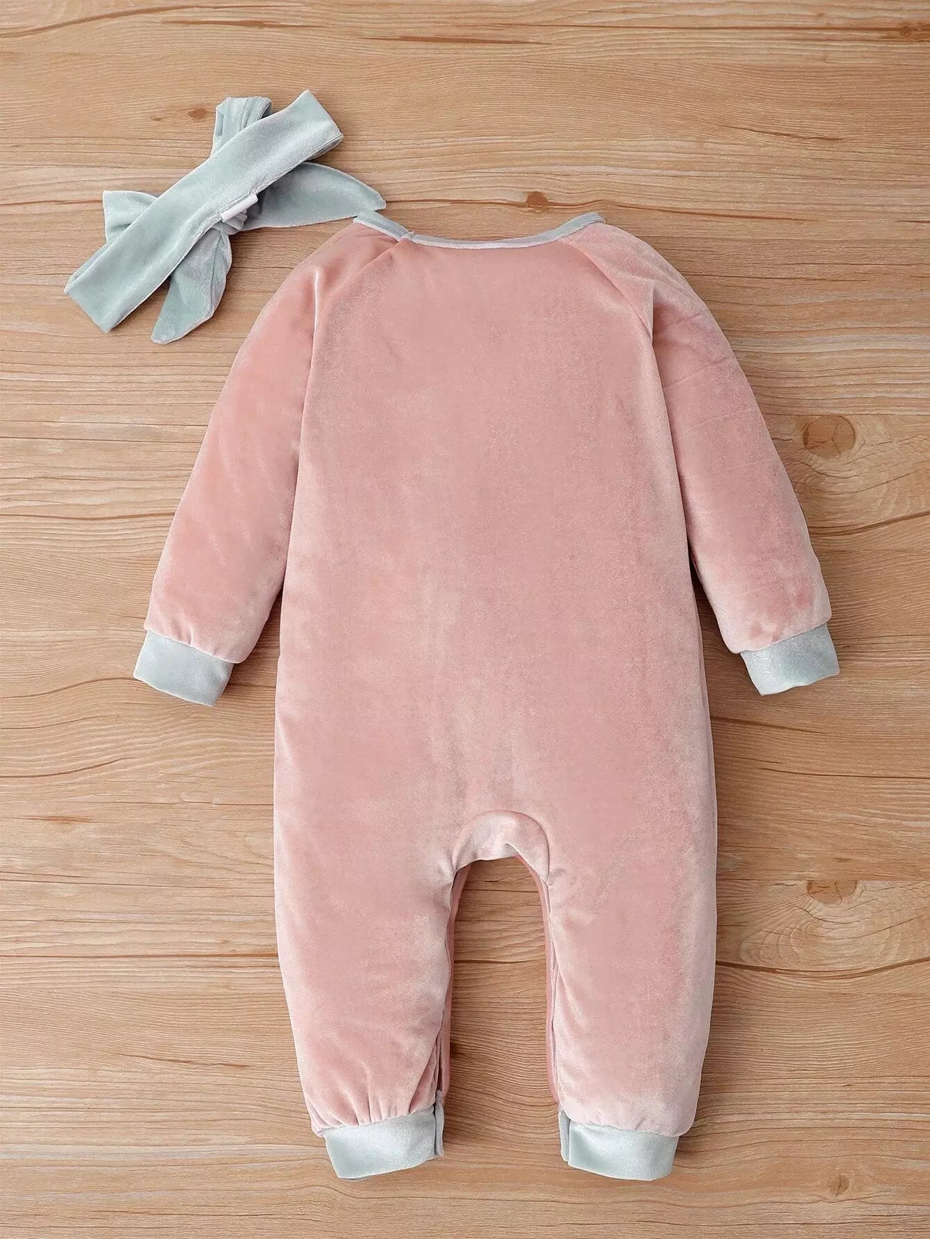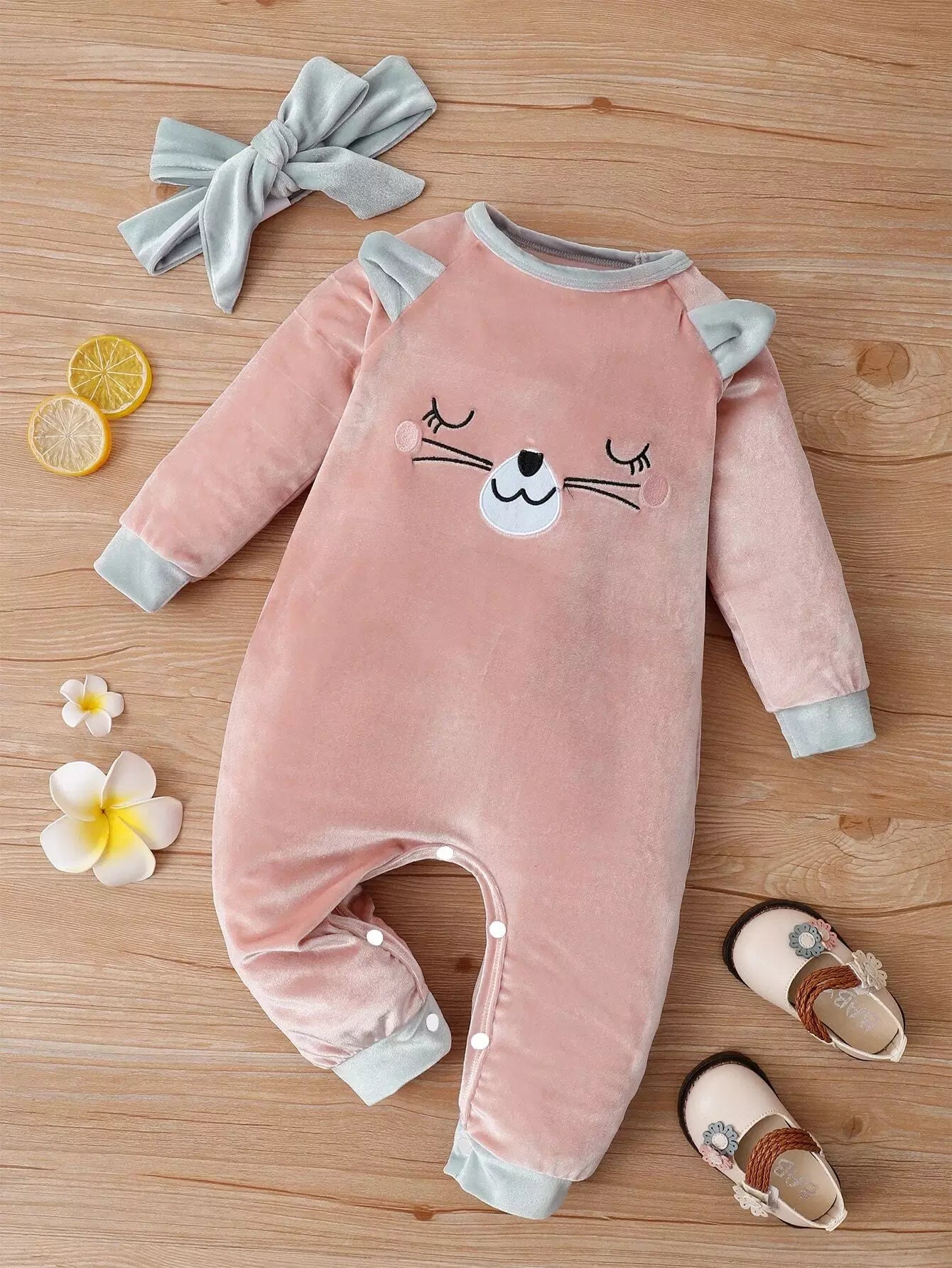 بذلة مخملية وعصابة رأس مخملية بتطريزات كرتونية ثلاثية الأبعاد للطفلة الرضيعة