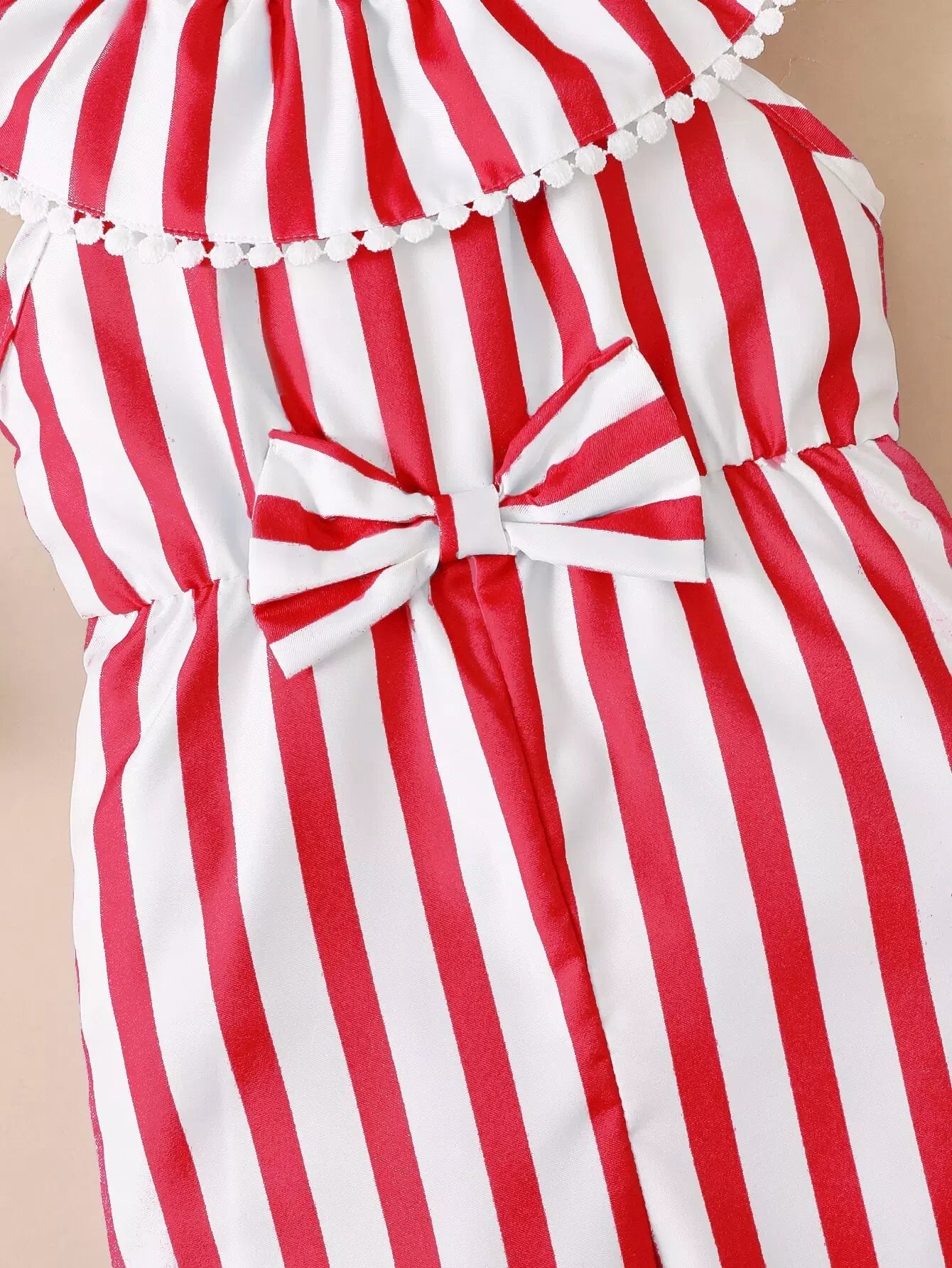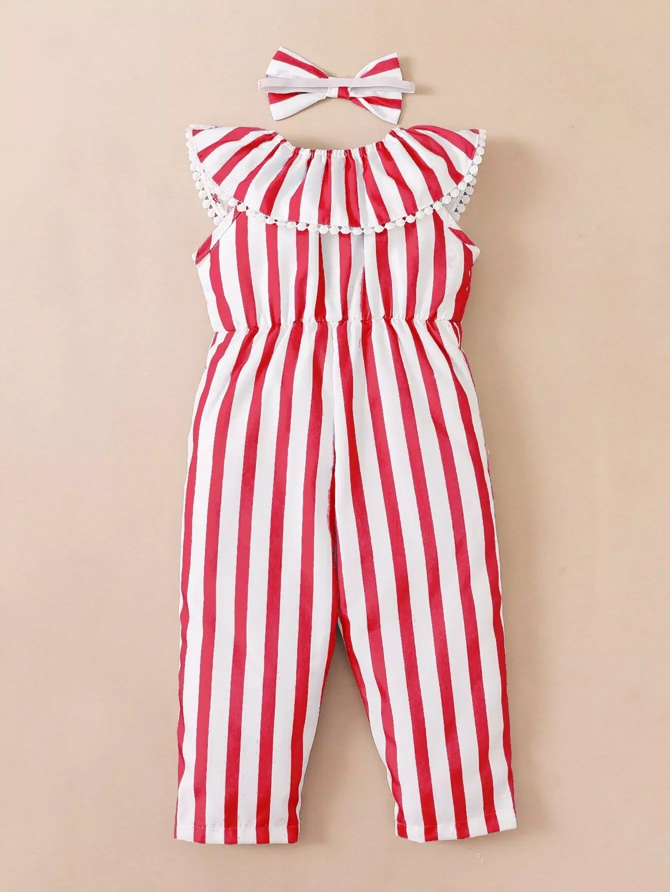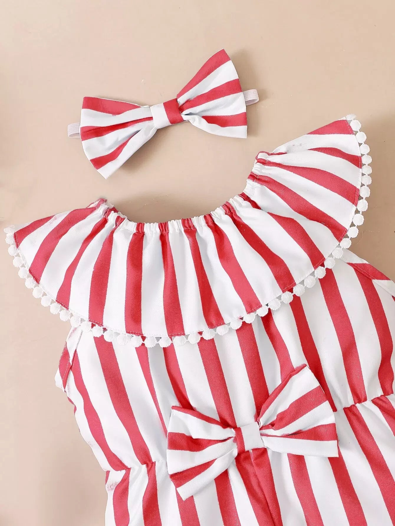 جامبسوت أطفال مخطط عمودي مكشكش مزين بعقدة من الأمام مع عصابة رأس