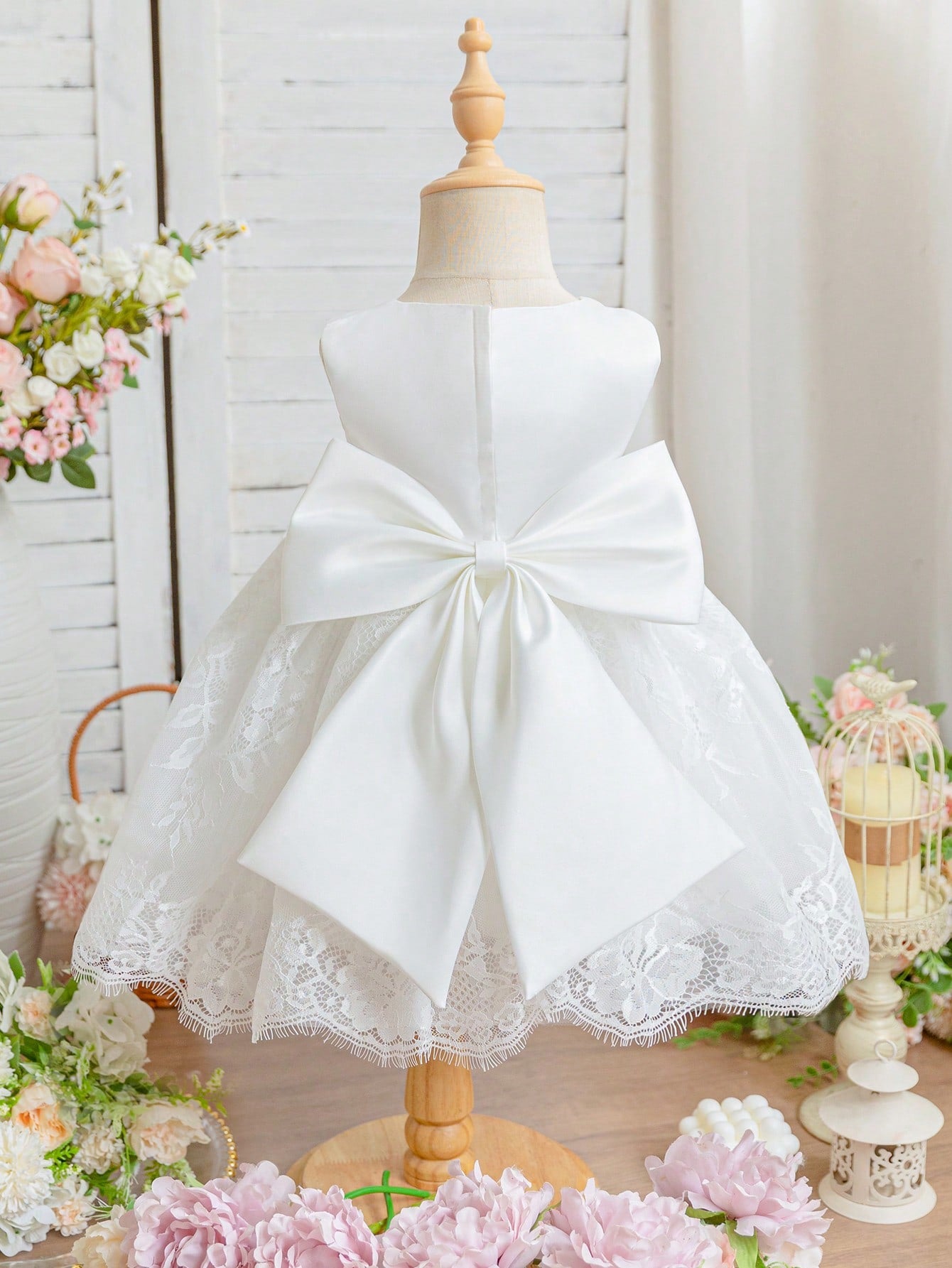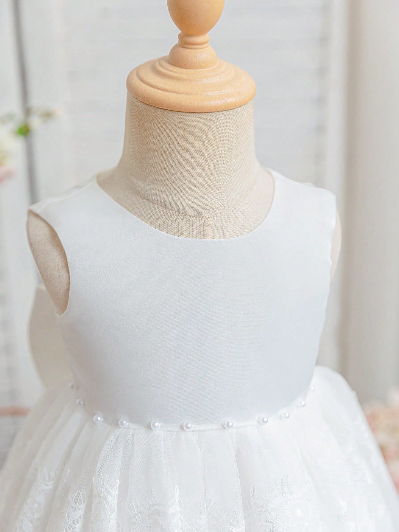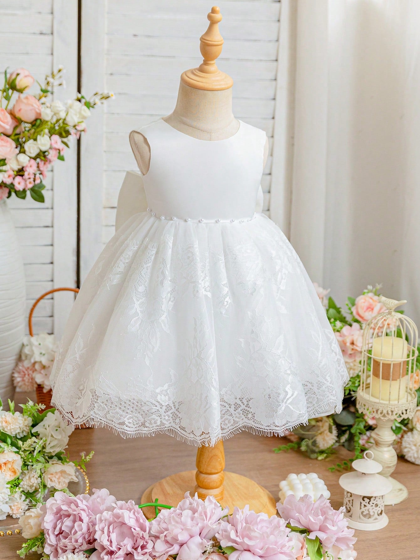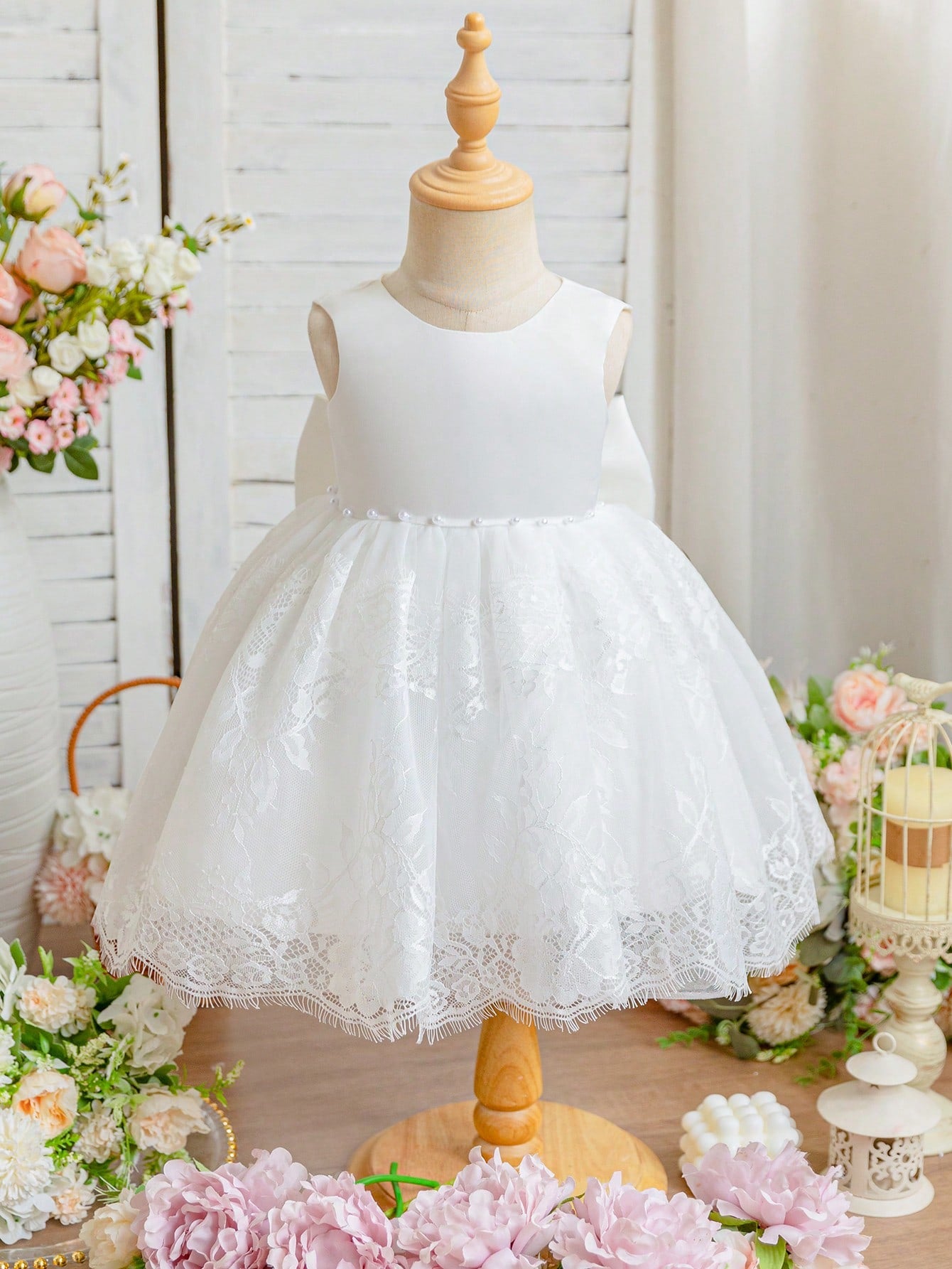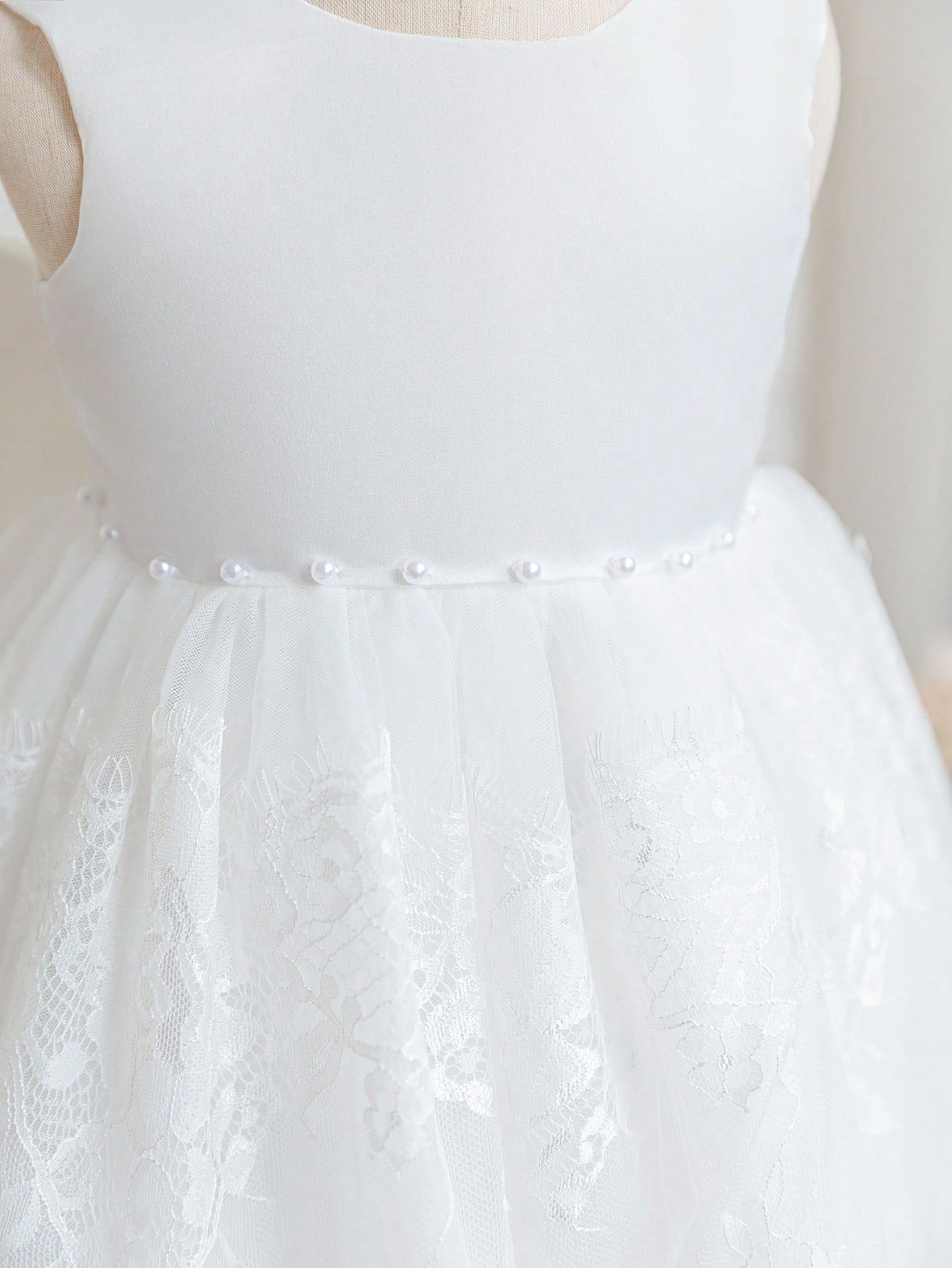 فستان Glamorique Kids من الساتان الشبكي المزين بالدانتيل باللون الأبيض للفتيات الصغيرات، مناسب لحفلات الزفاف وأعياد الميلاد والسهرة