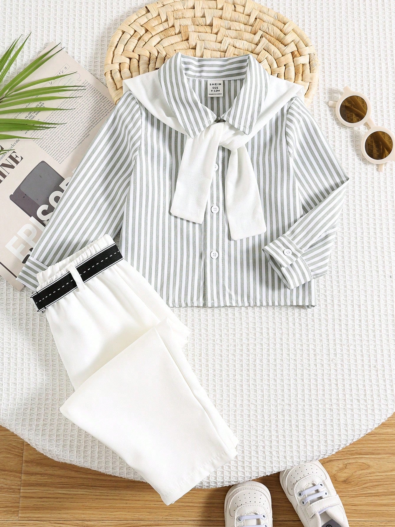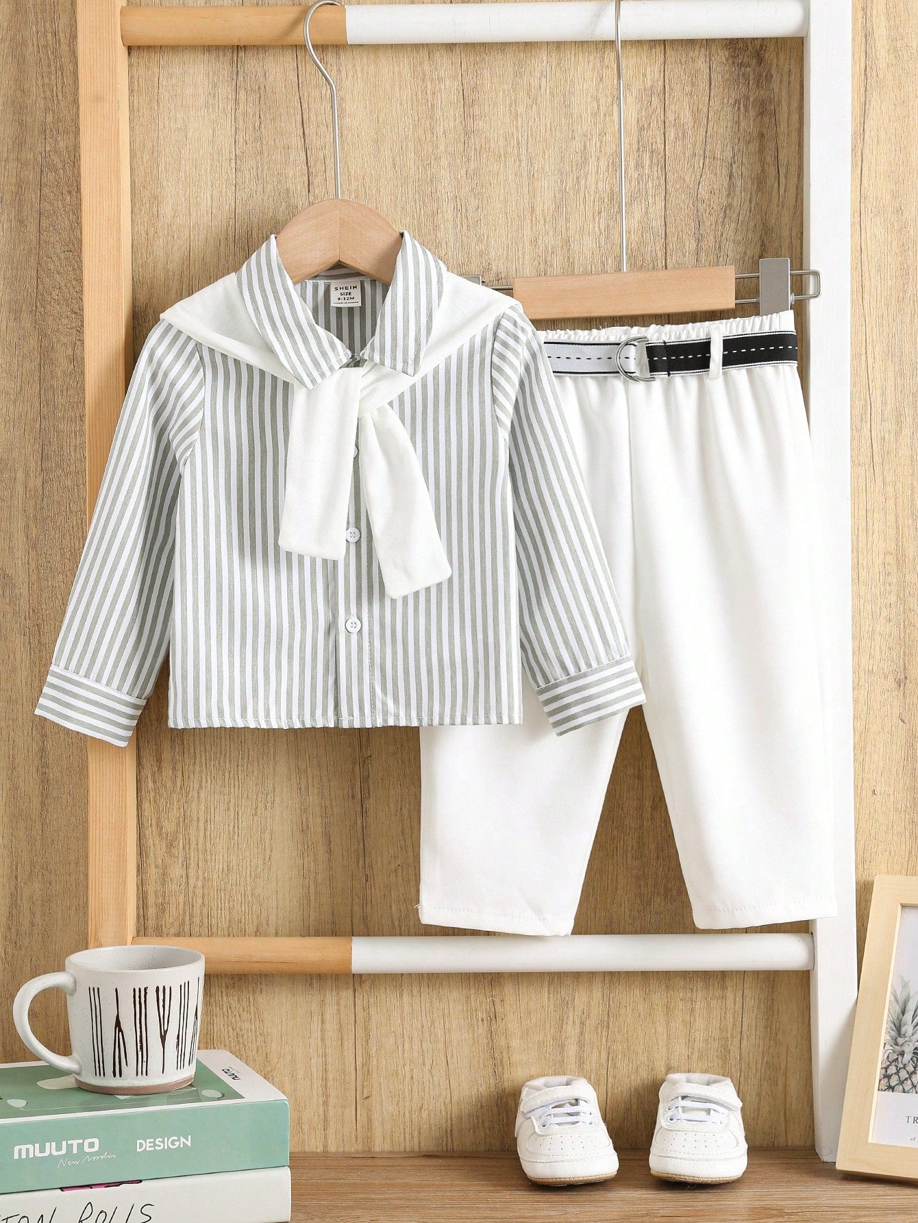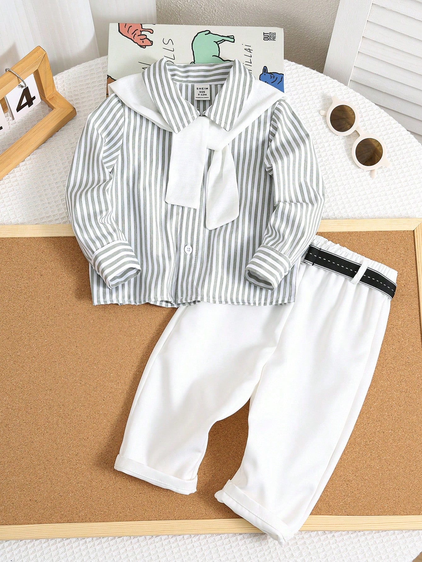 4pcs Baby Boy Set: Blue & White Striped Long Sleeve Shirt, Navy Cape, White Trousers With Jacquard Belt,