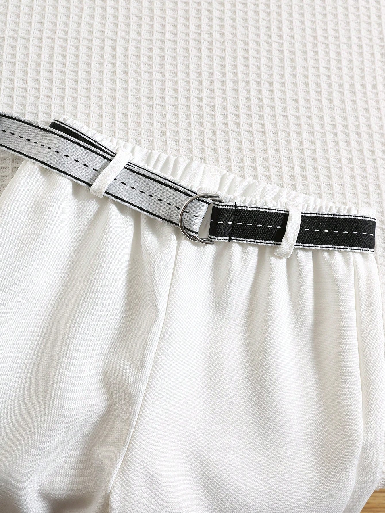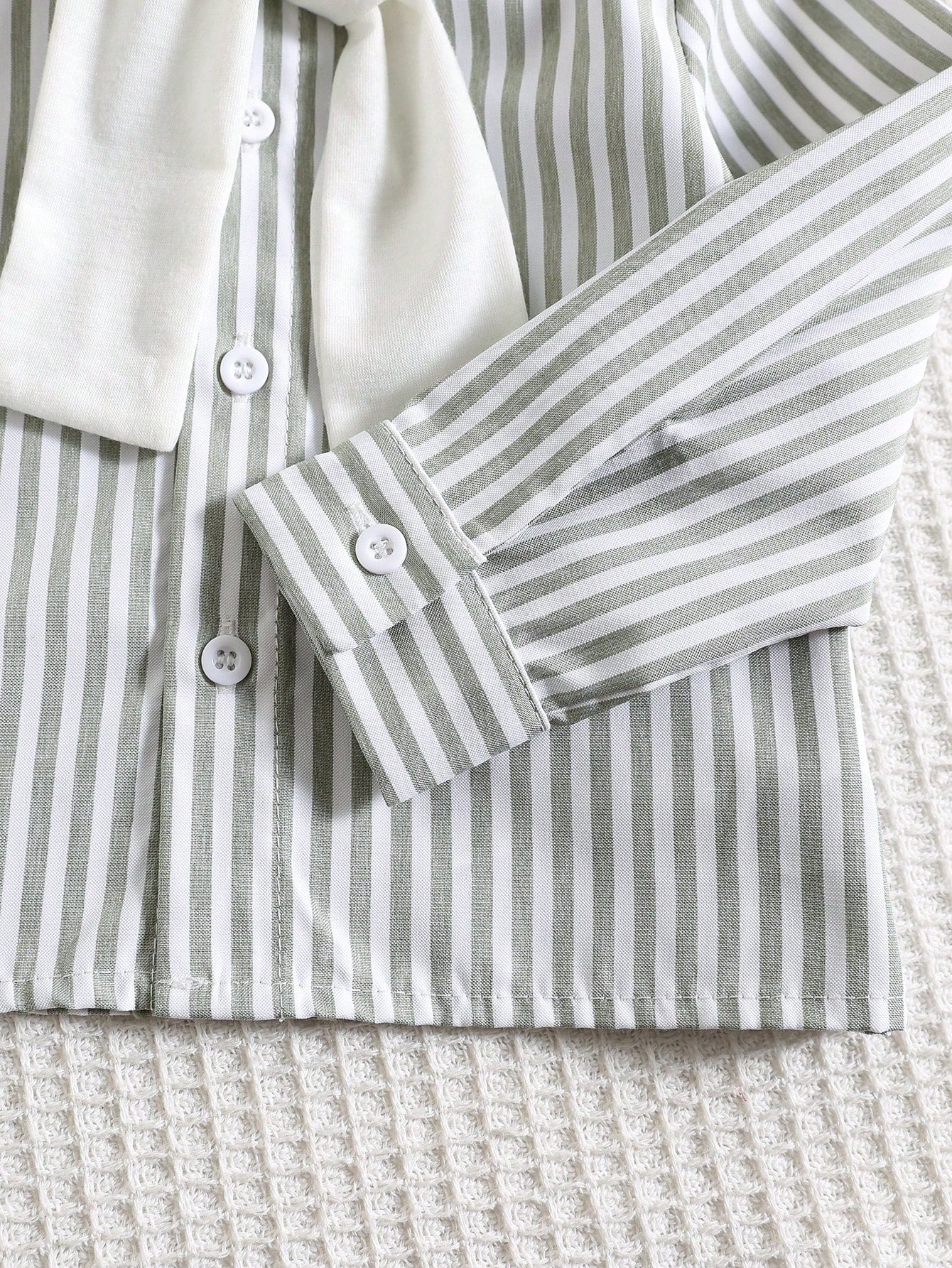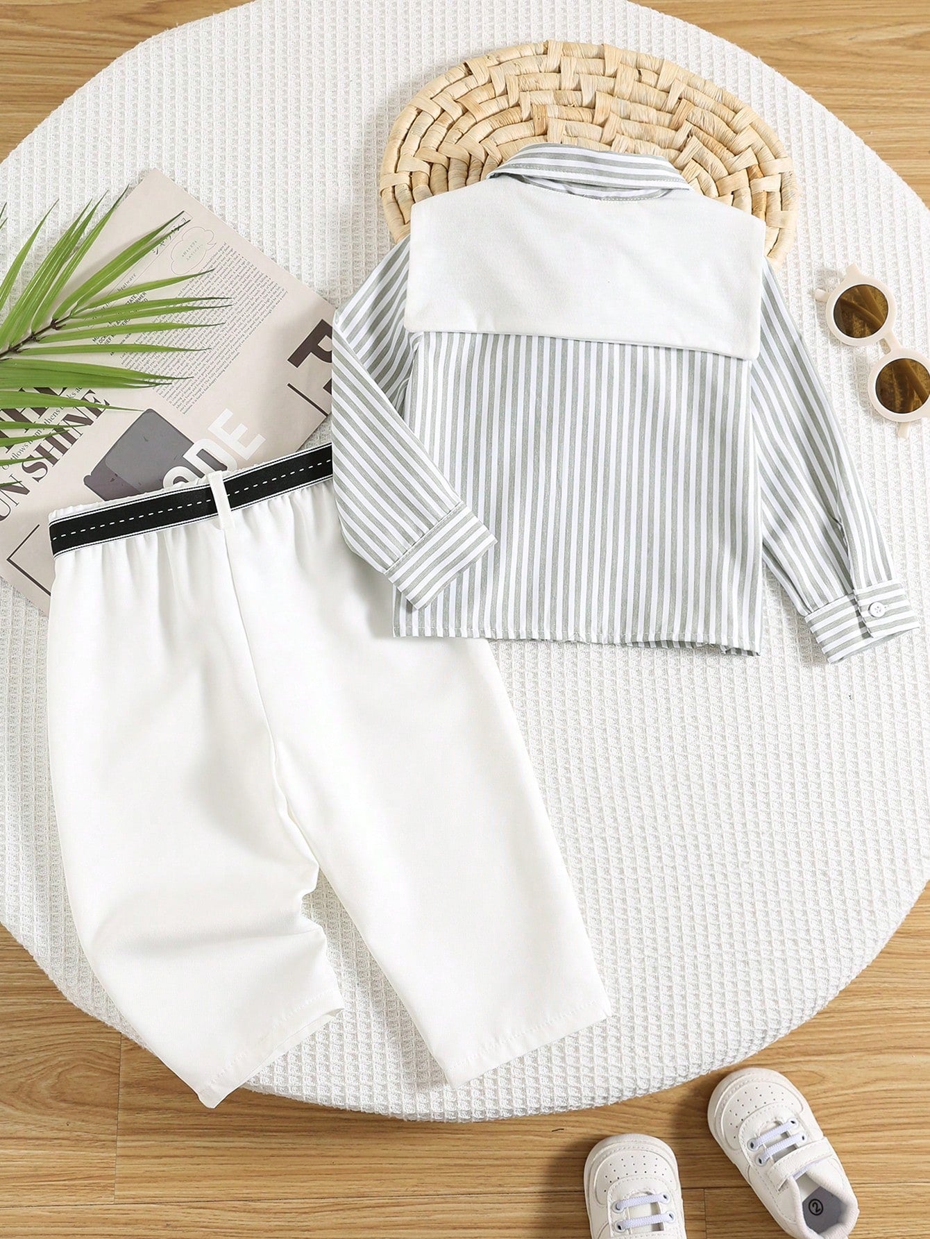 4pcs Baby Boy Set: Blue & White Striped Long Sleeve Shirt, Navy Cape, White Trousers With Jacquard Belt,