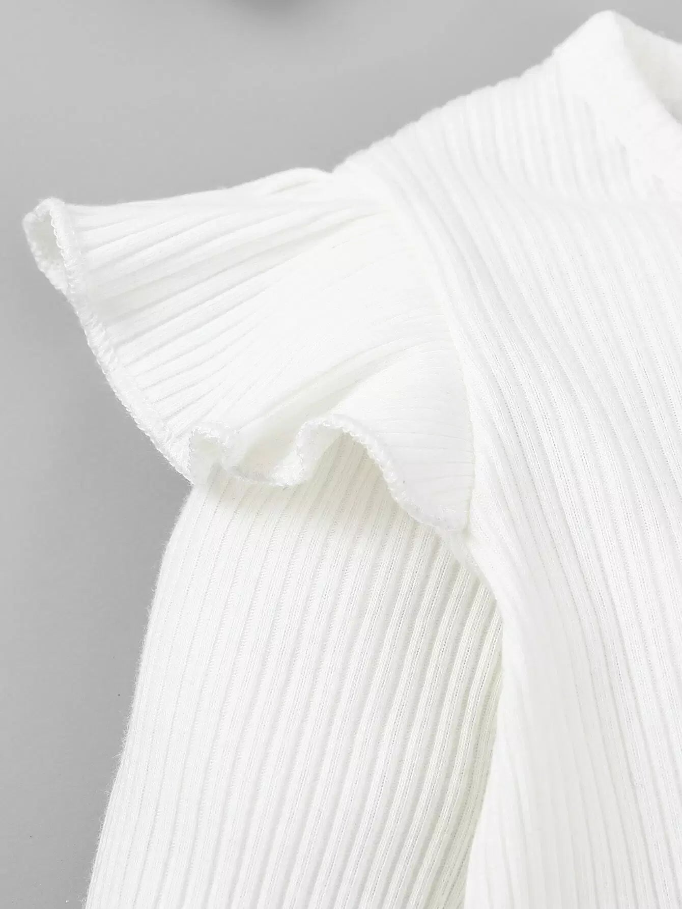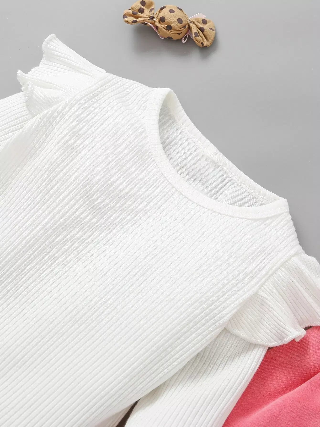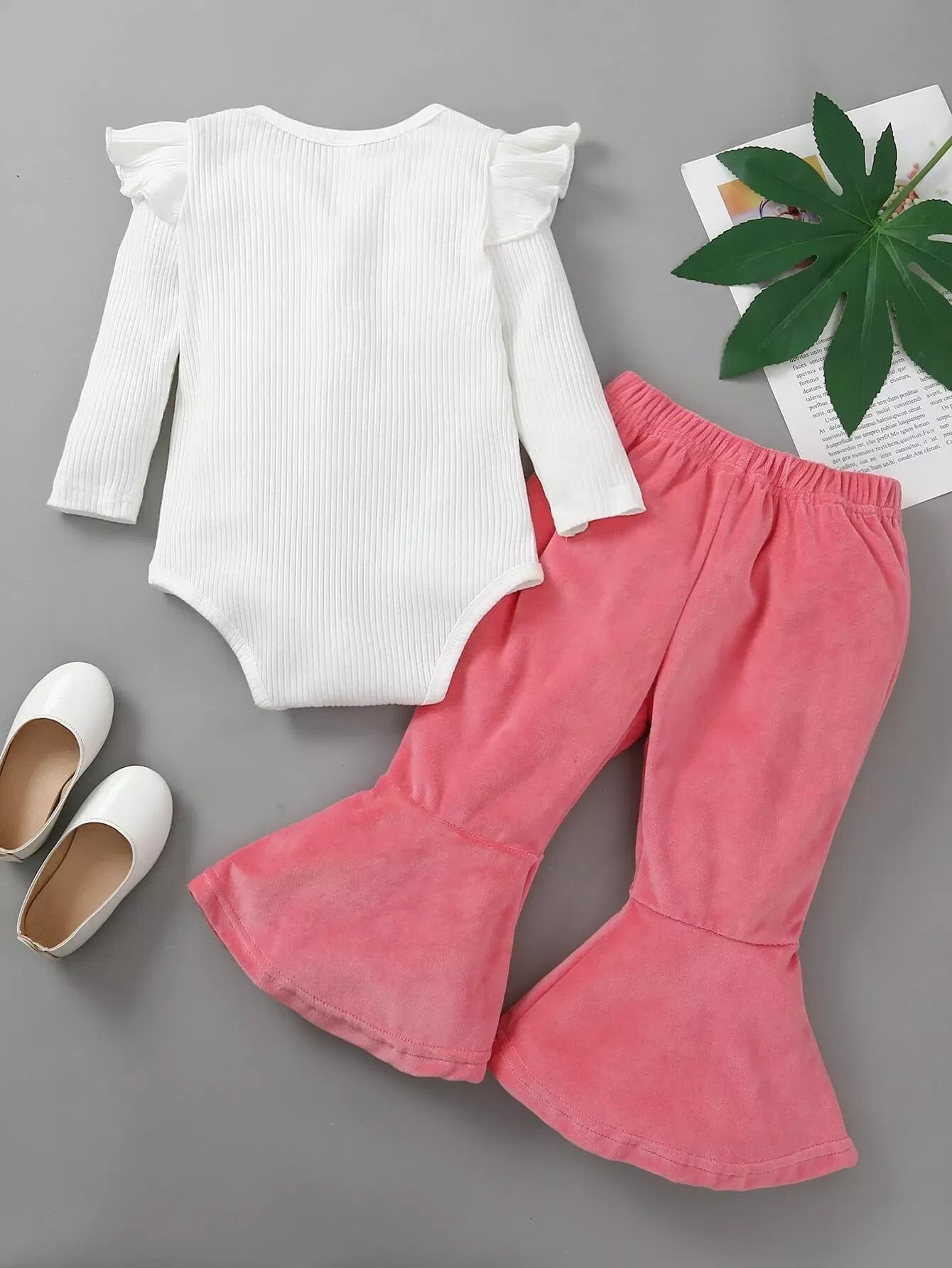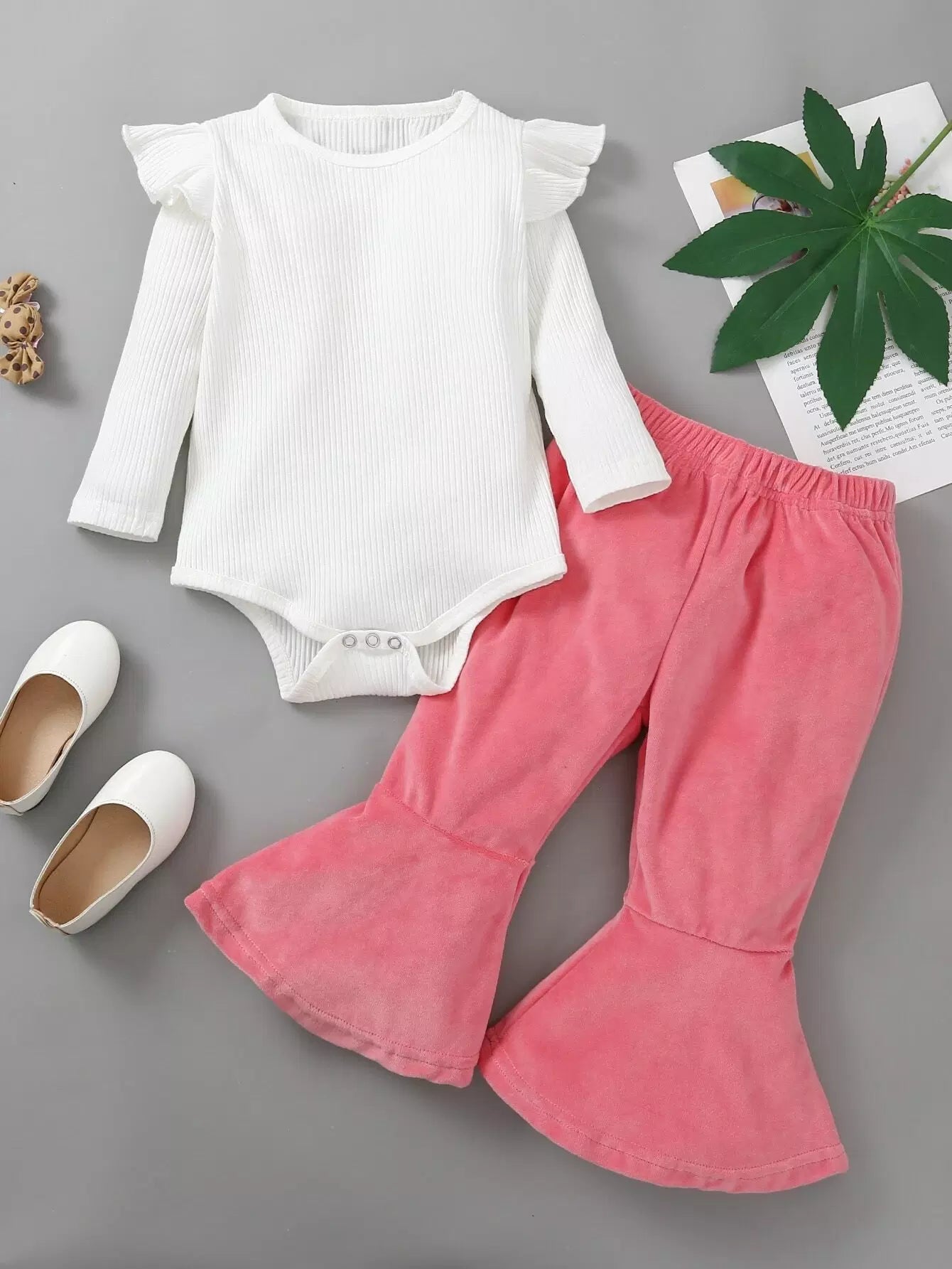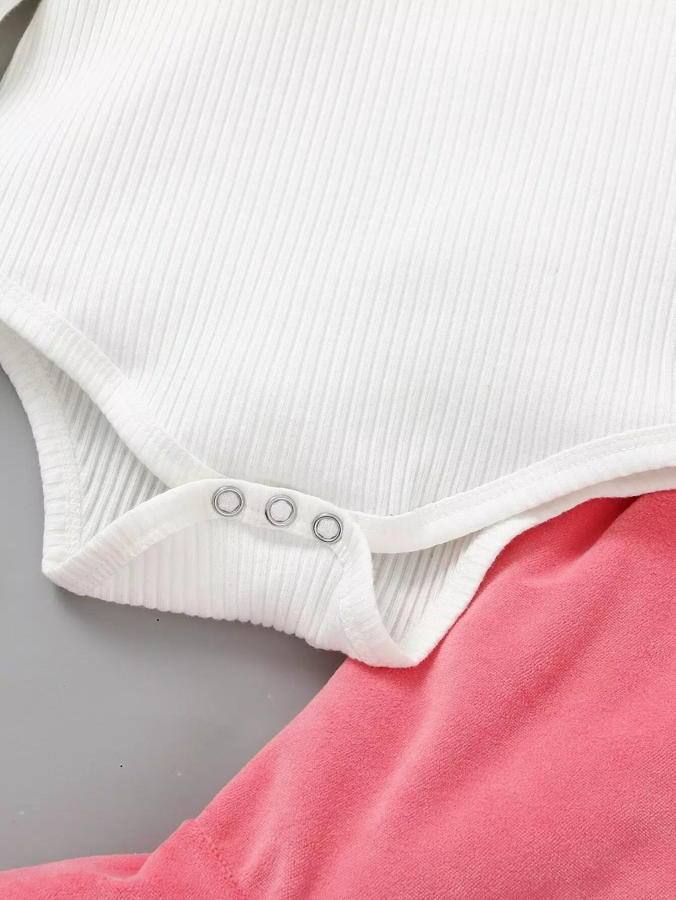لباس قطعة واحدة للطفلة الرضيعة بحياكة ضلعية وبنطال مخملي بحافة كشكش