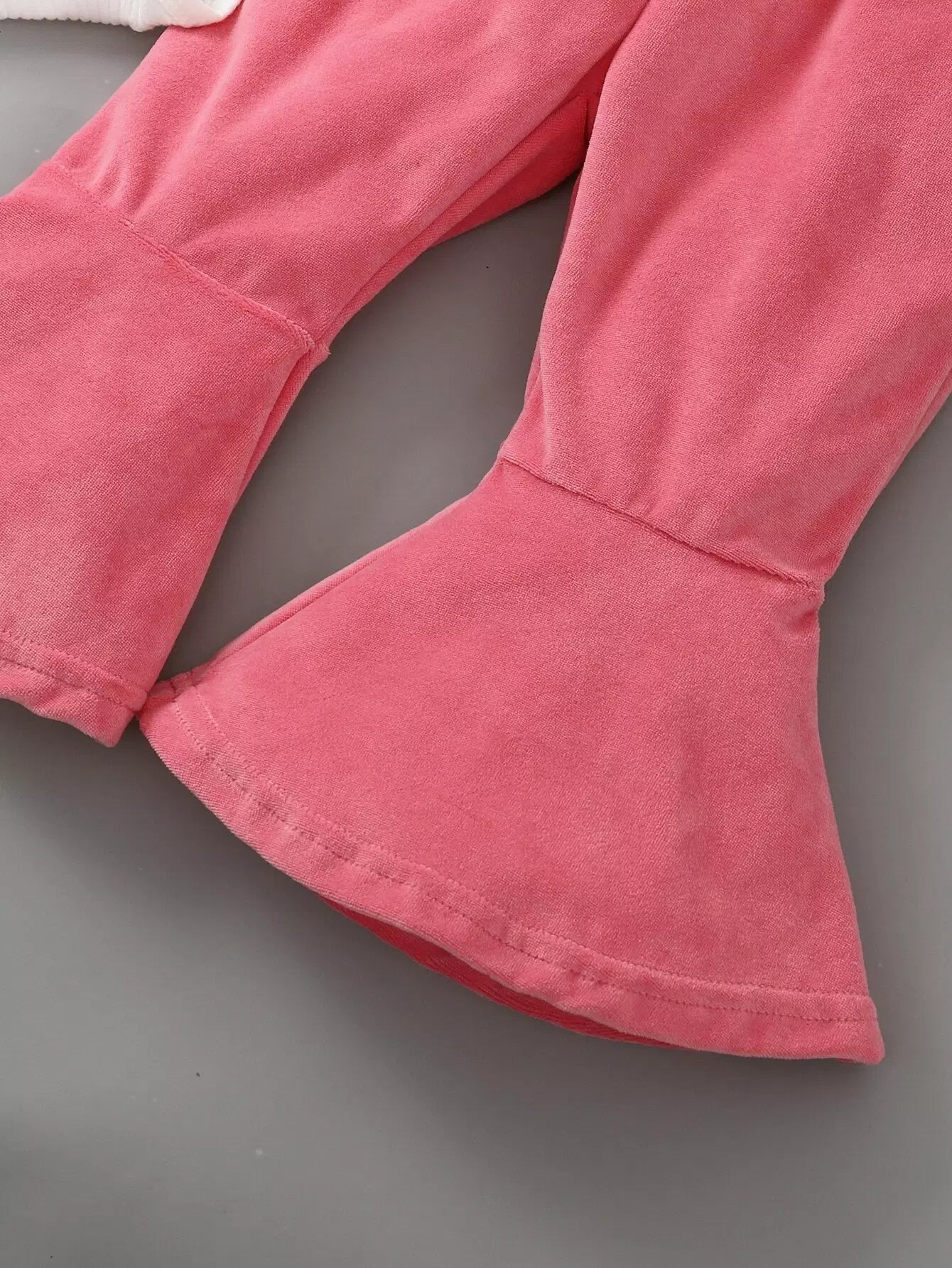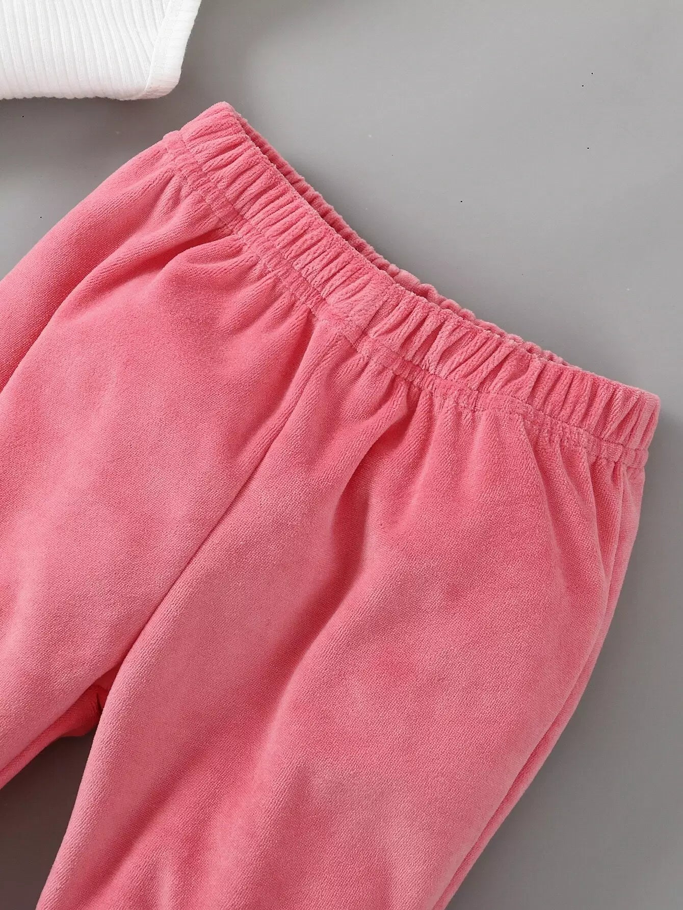 الأطفال - بدلة قطعة واحدة للفتيات الصغيرات من نسيج مضلع وسروال مخملي بحاشية مكشكشة