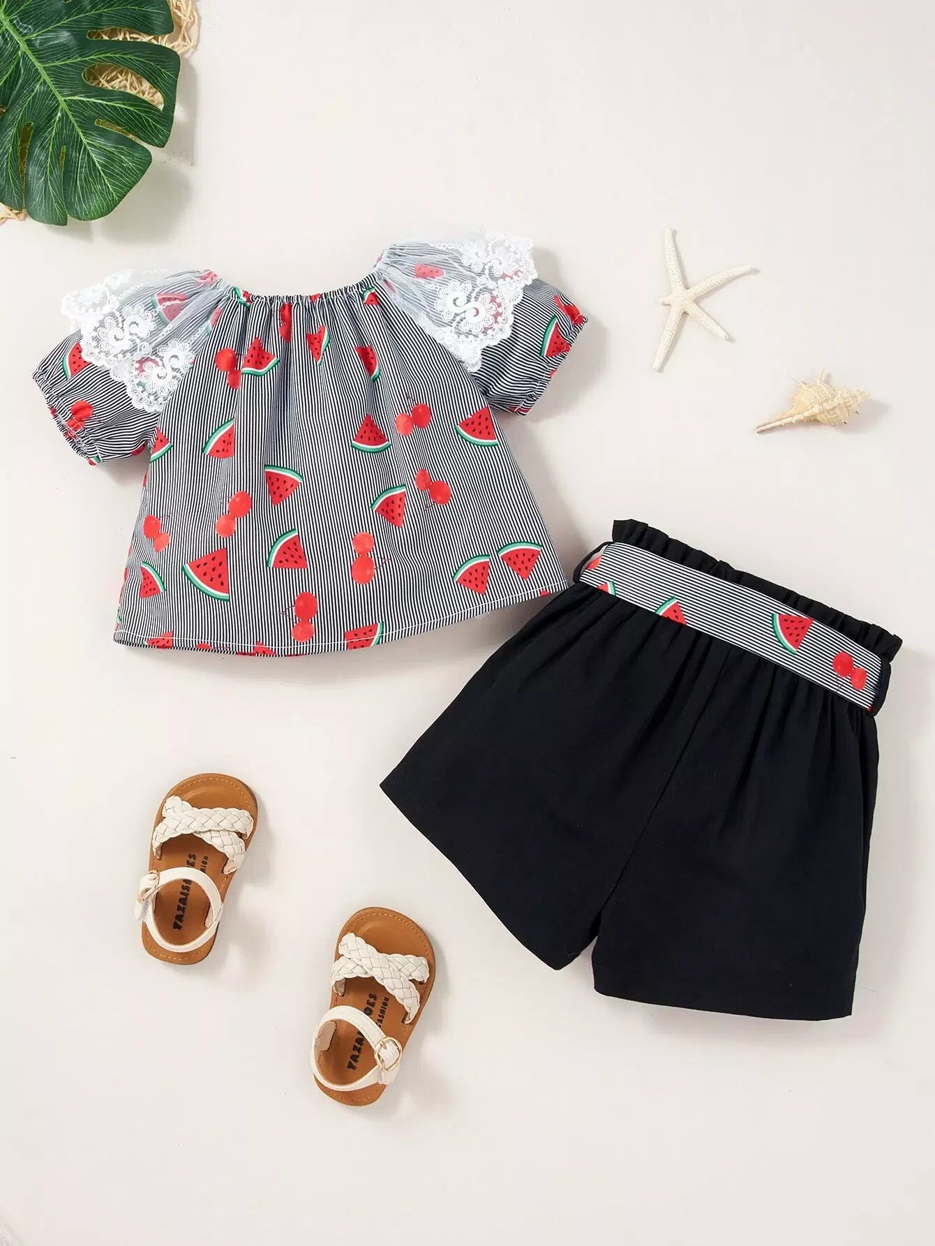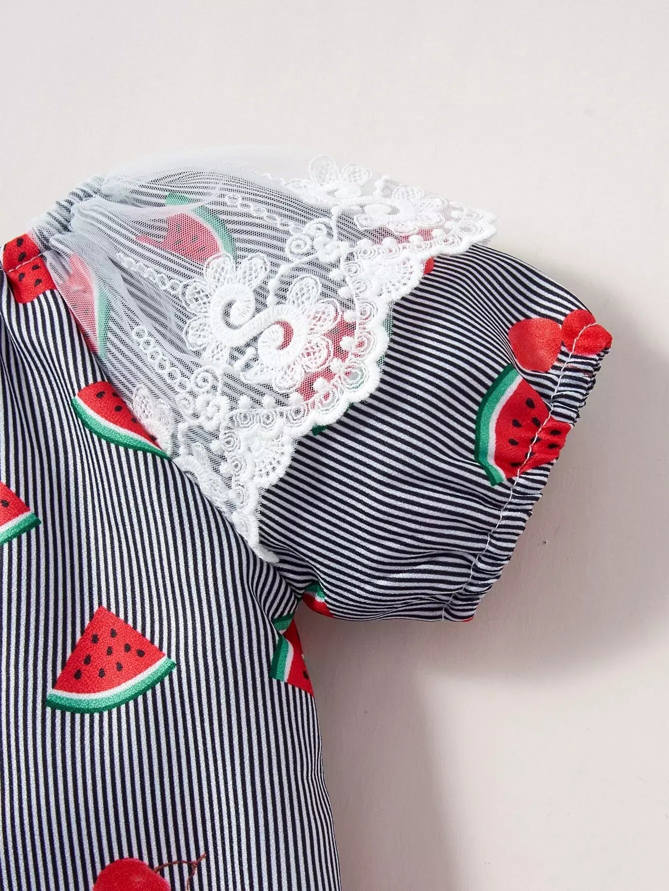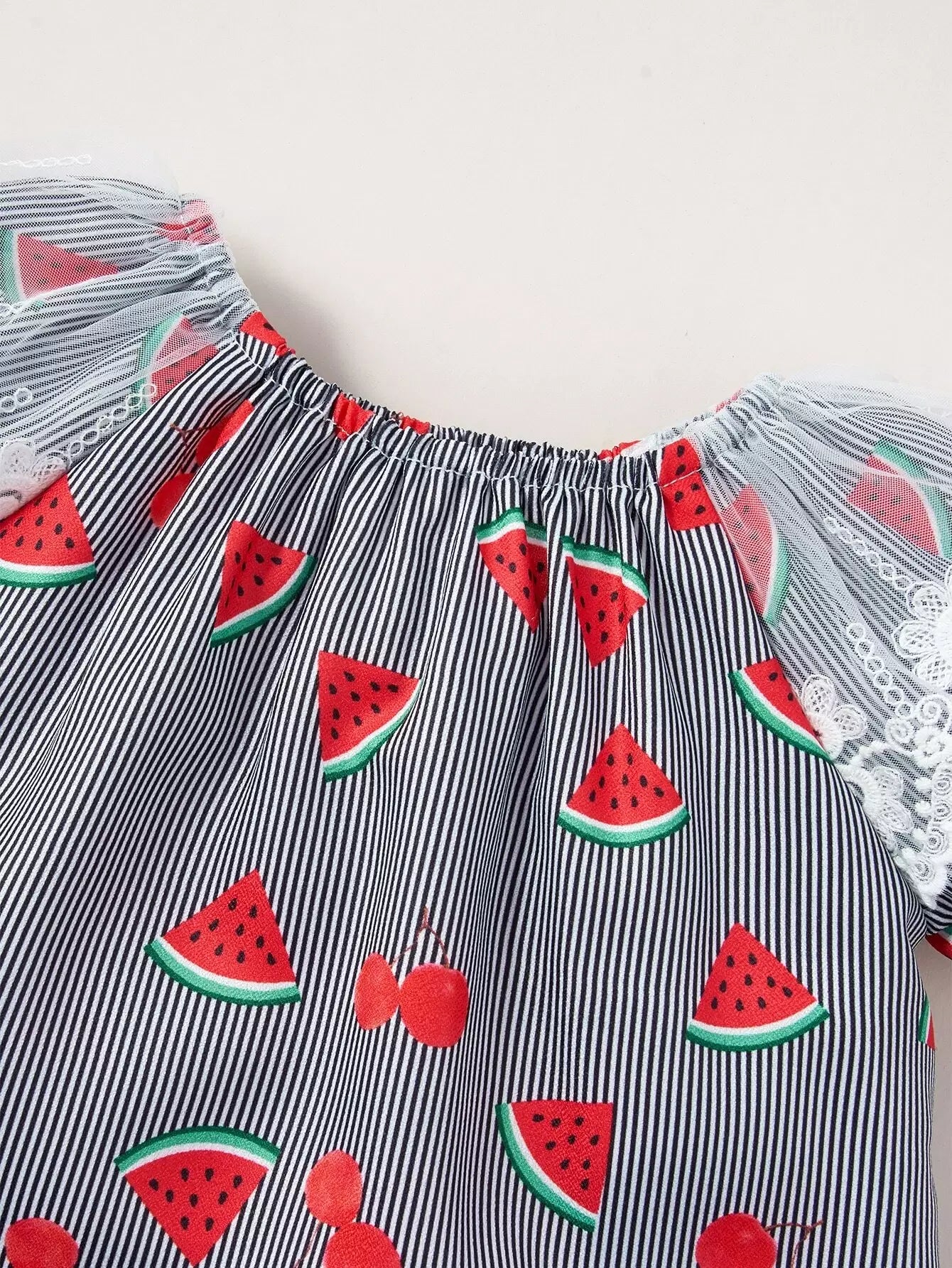 بلوزة وشورت للفتيات الصغيرات بطباعة البطيخ والكرز من الدانتيل بدون حزام