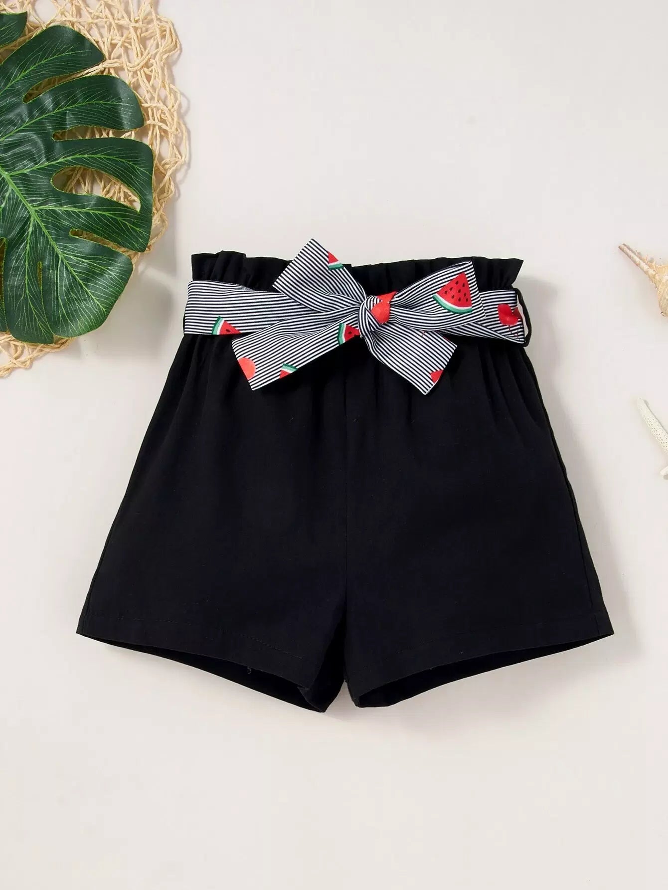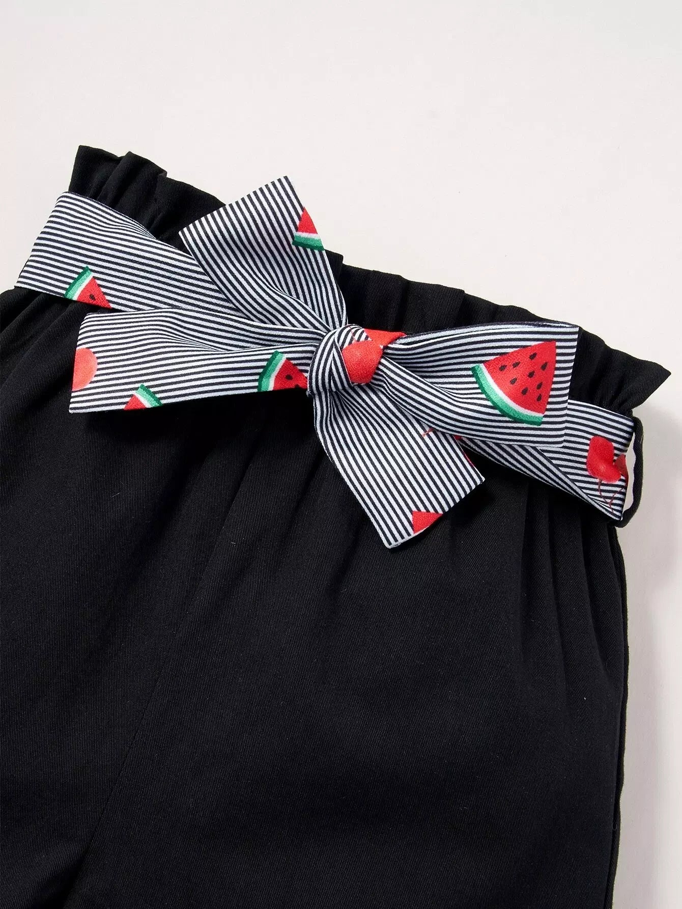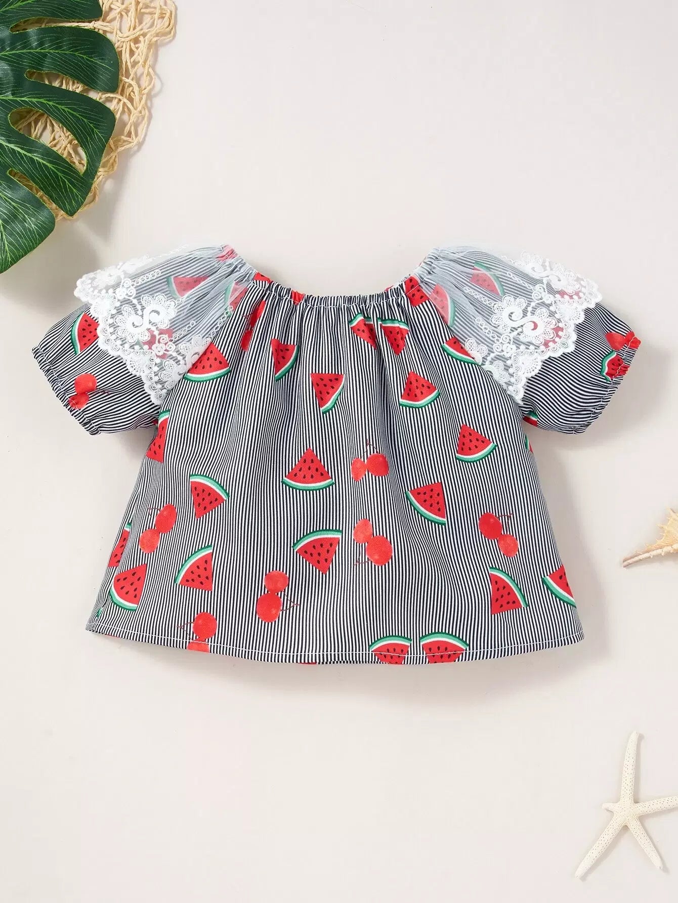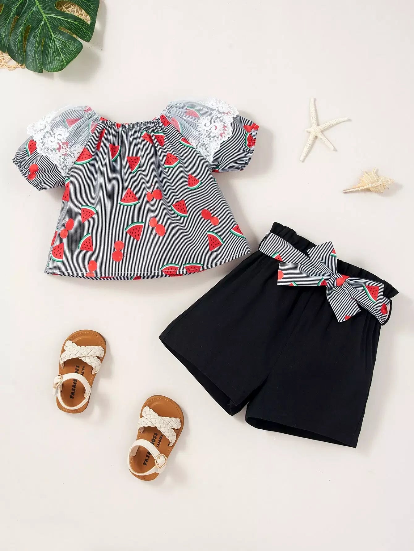 بلوزة وشورت للفتيات الصغيرات بطباعة البطيخ والكرز من الدانتيل بدون حزام