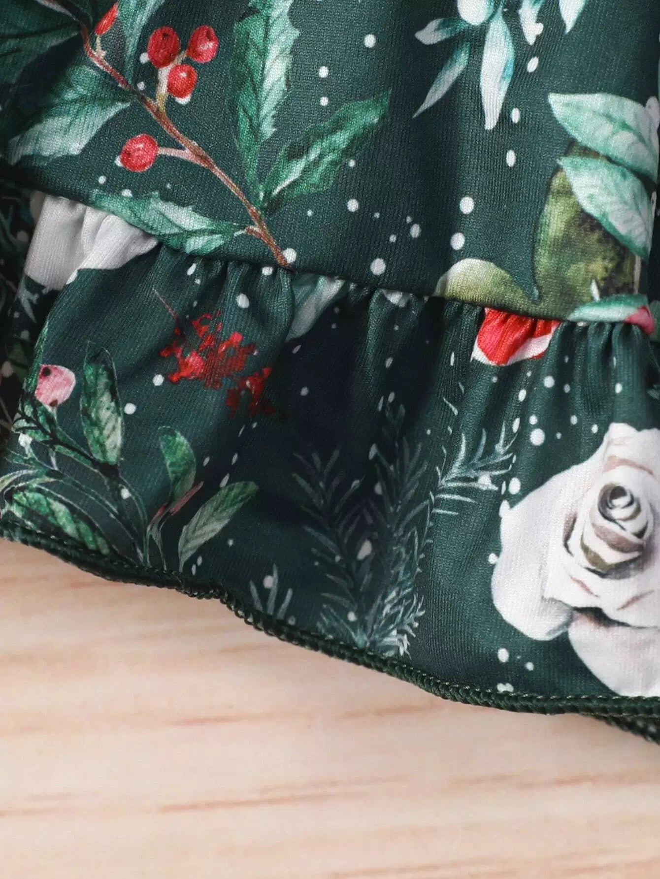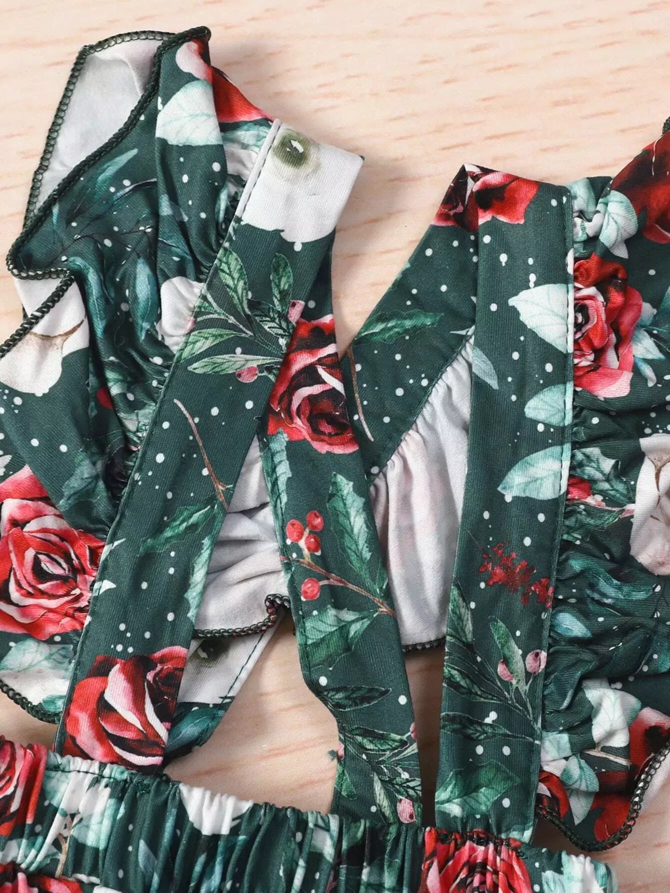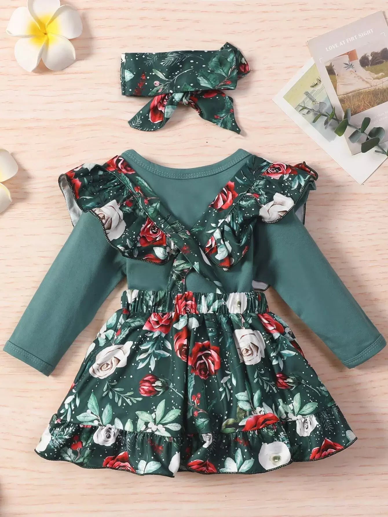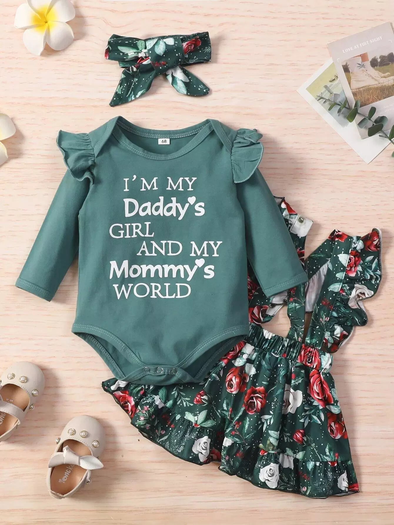 لباس قطعة واحدة لطفل رضيع مزين بشعارات جرافيك وتنورة حمالات بطبعة زهور وعصابة رأس
