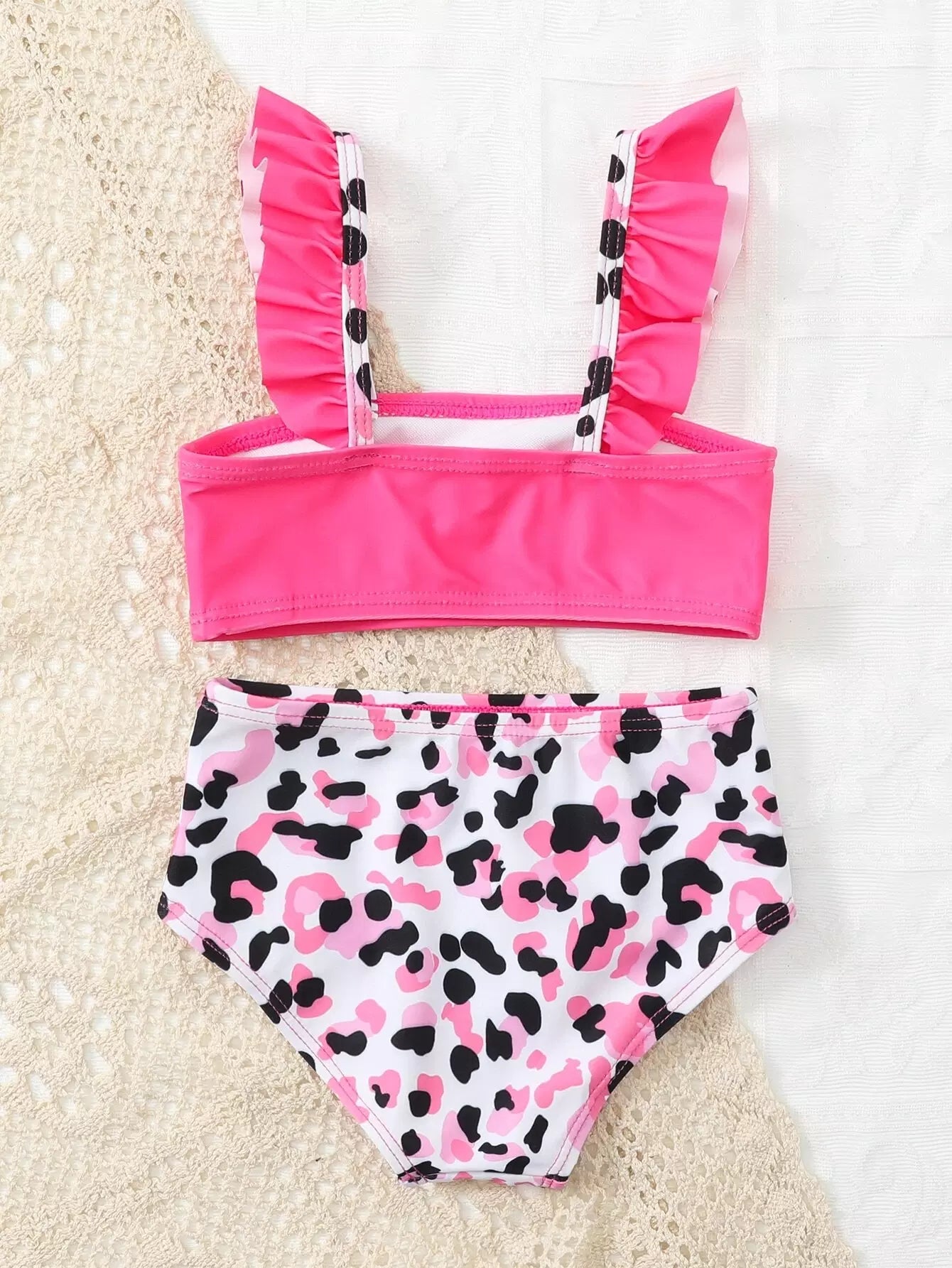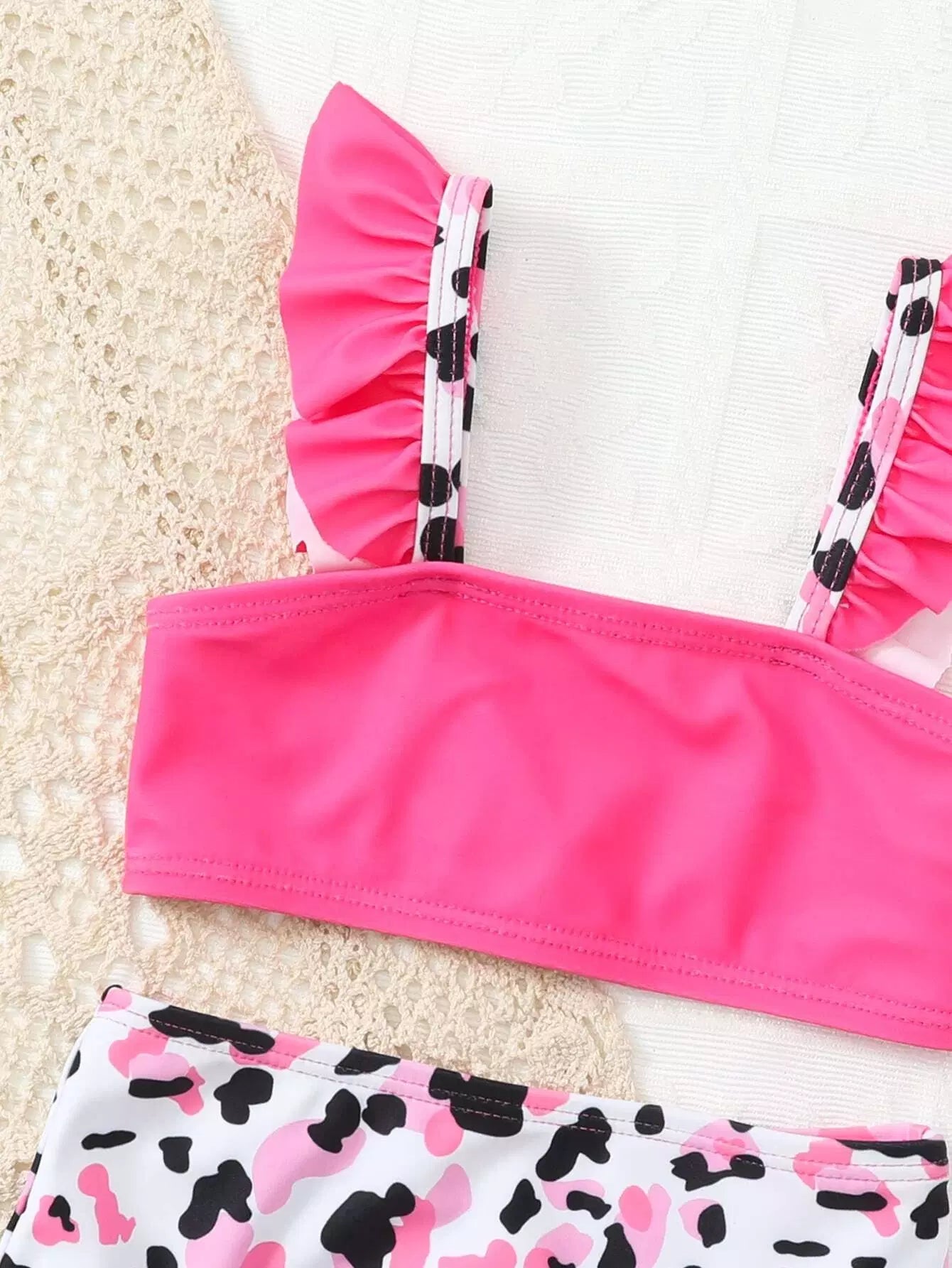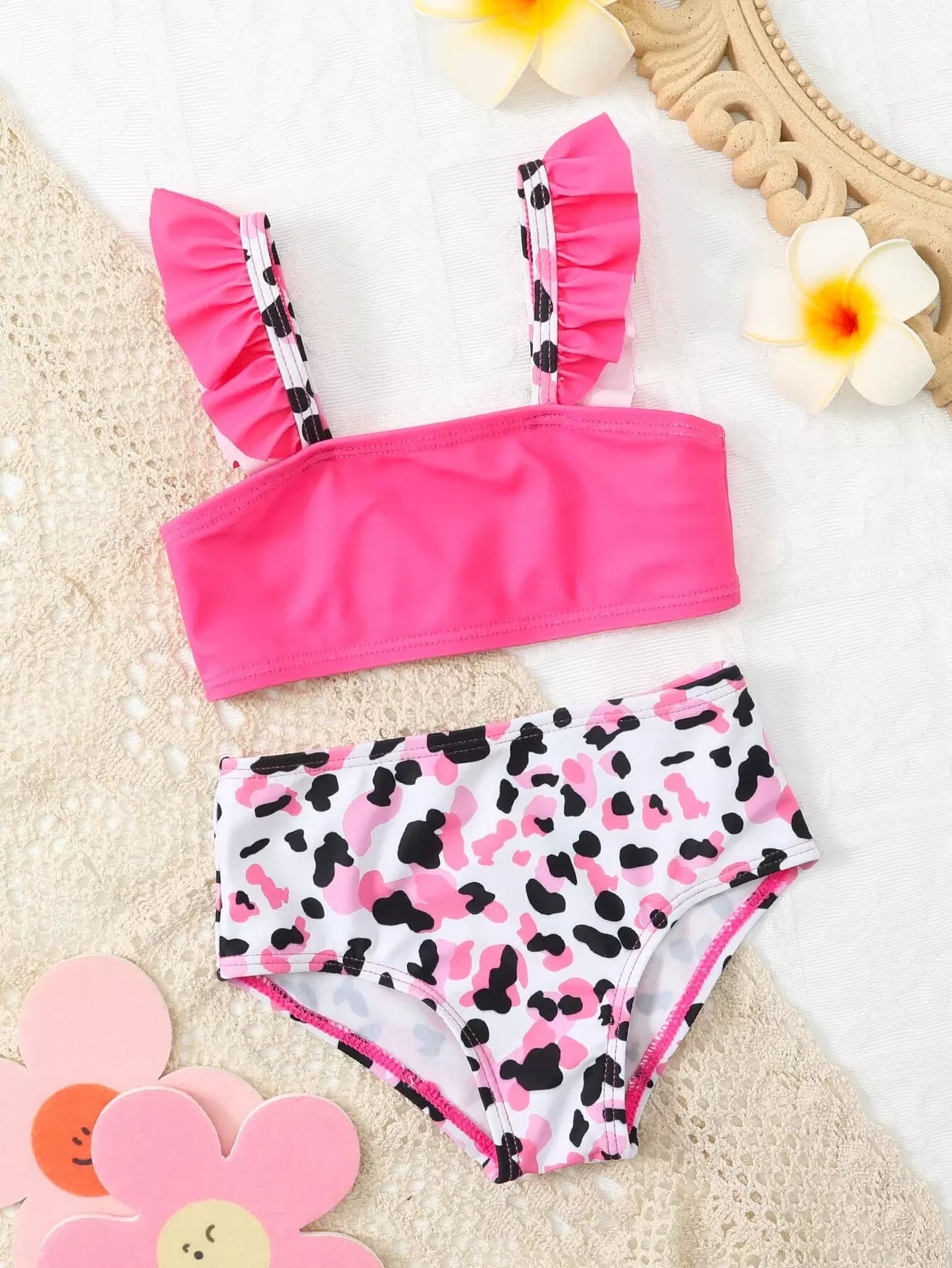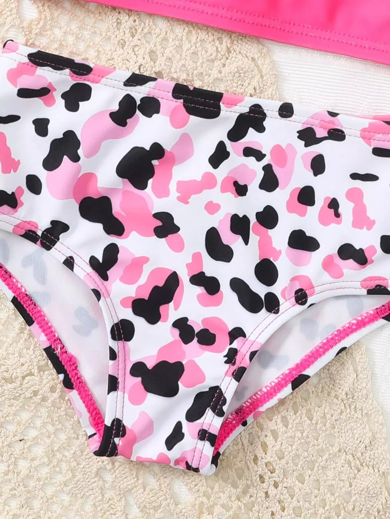 بيكيني سباحة بيكيني بطبعة جرافيك طفلة رضيعة، مزين بكشكش