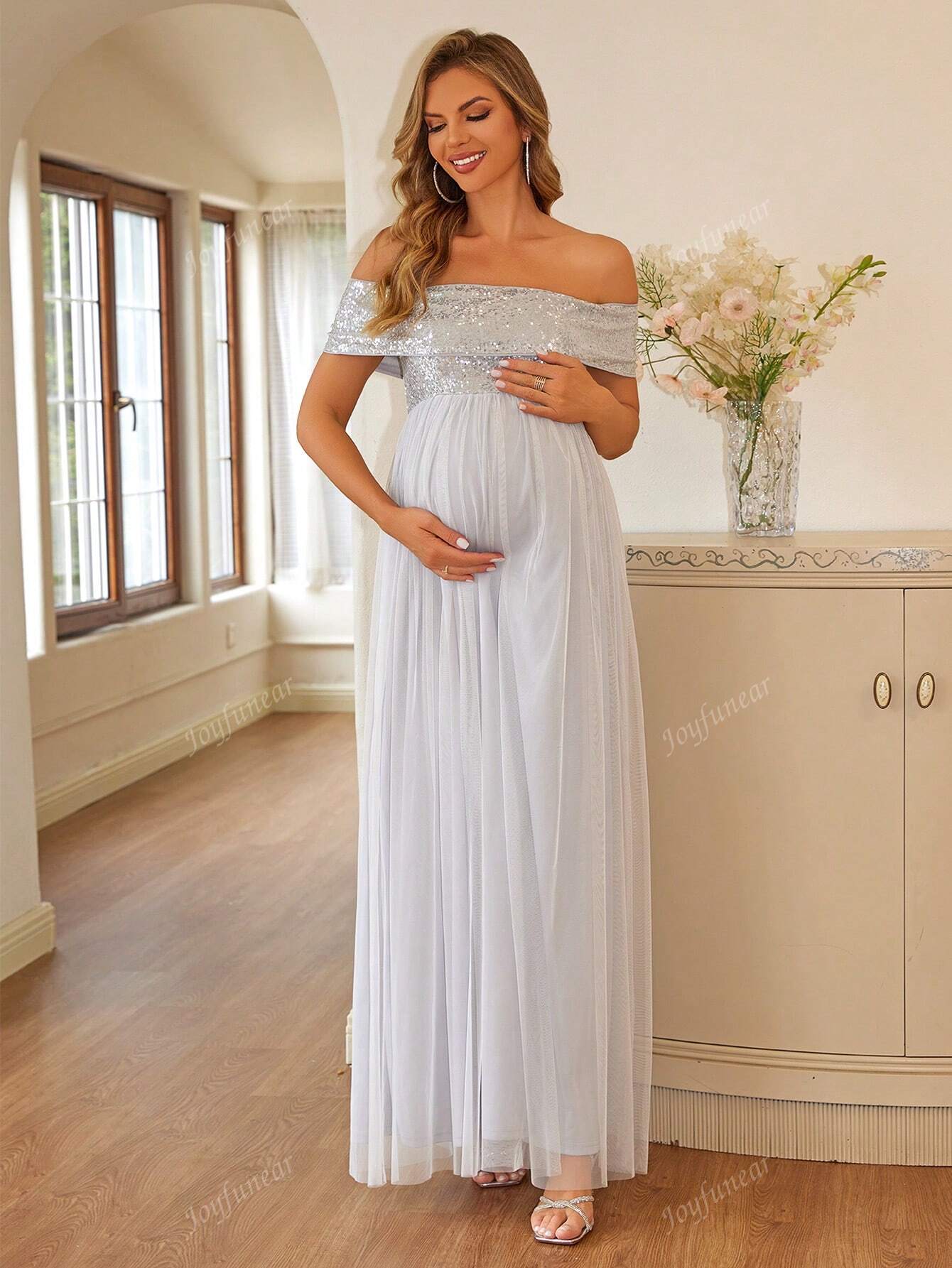 فستان Joyfunear الطويل للنساء الحوامل بدون أكتاف ومزين بالترتر والشبك المتباين