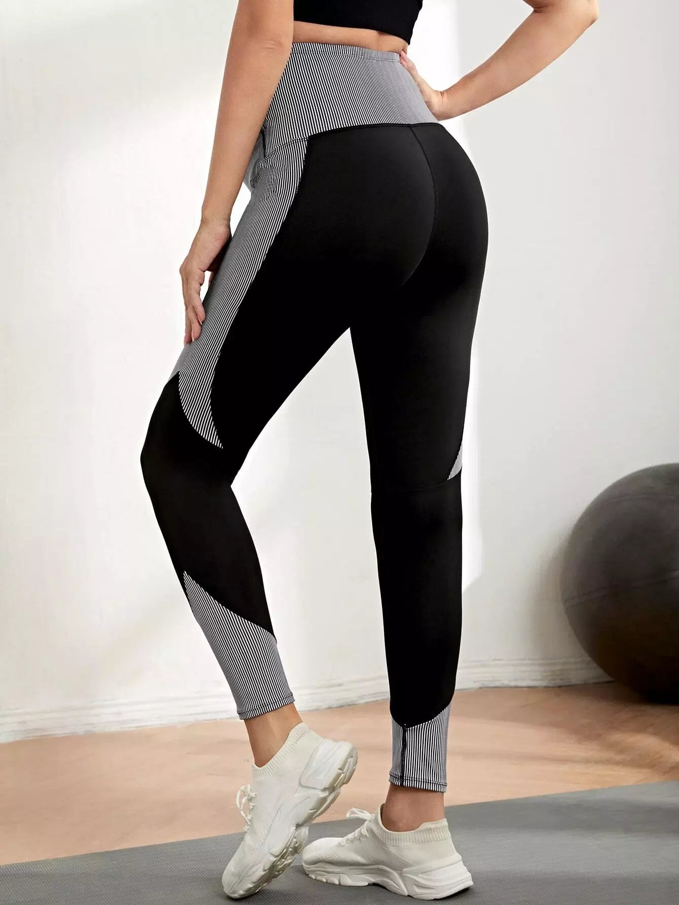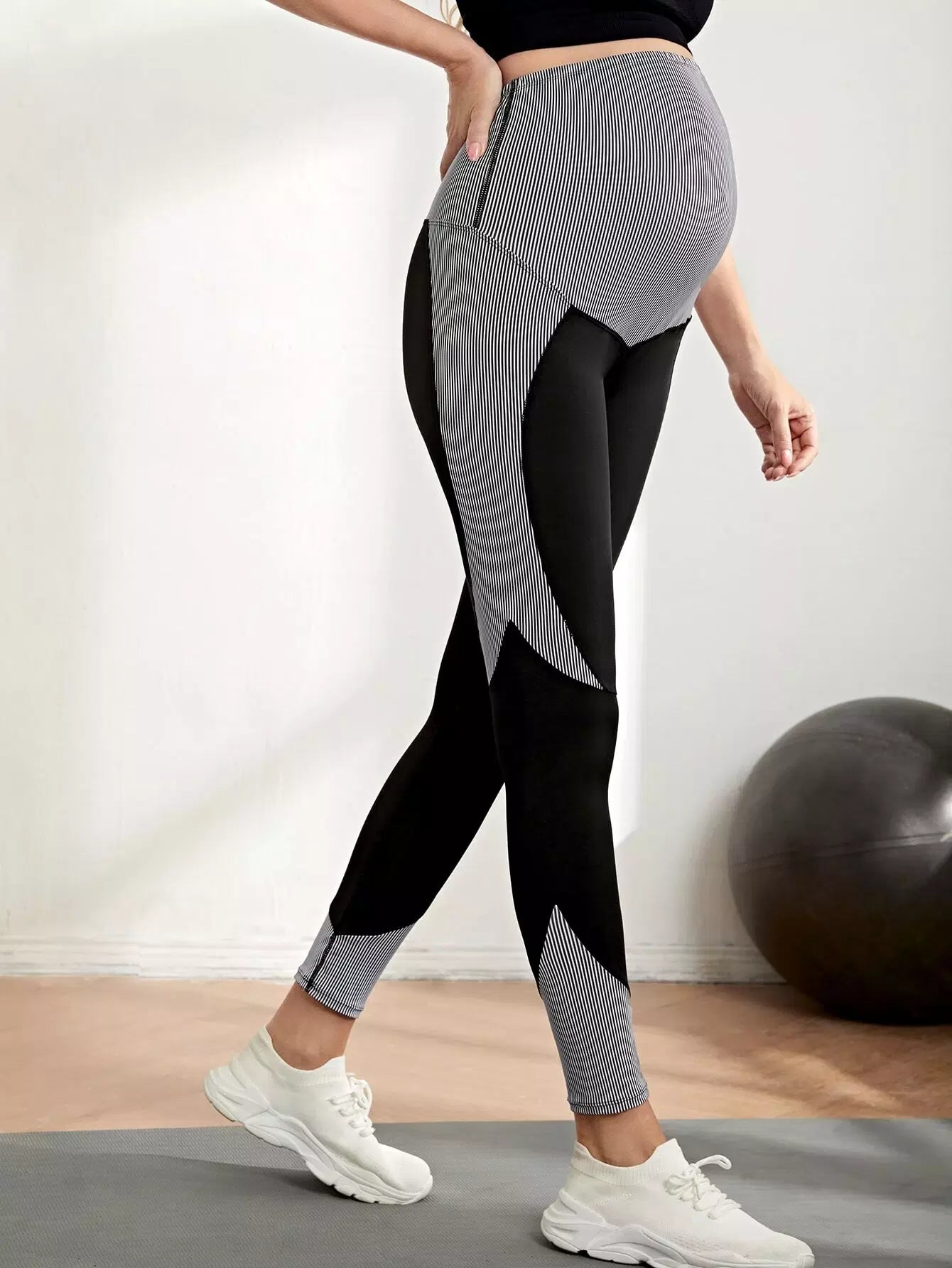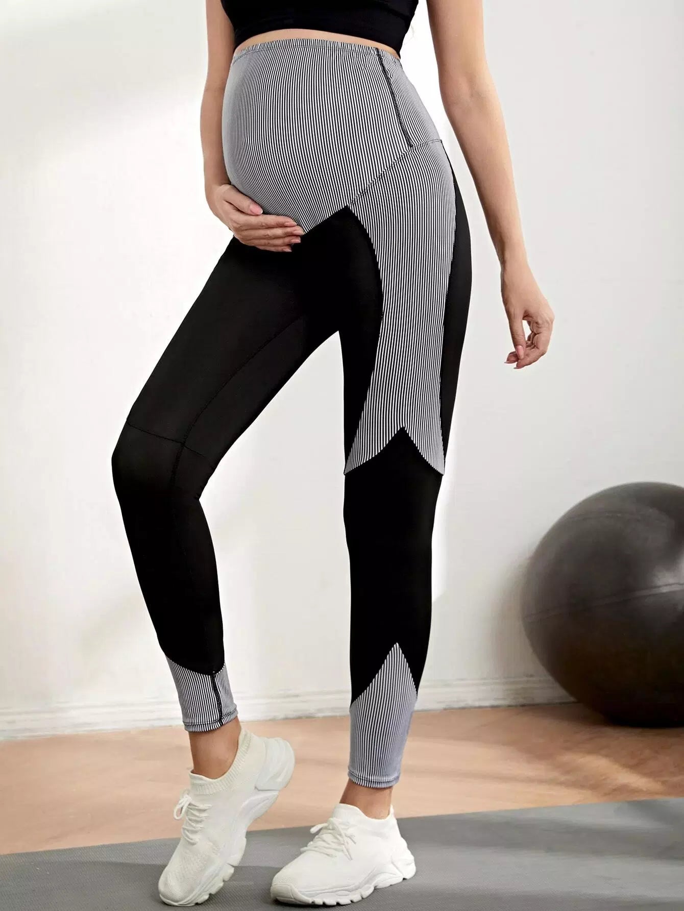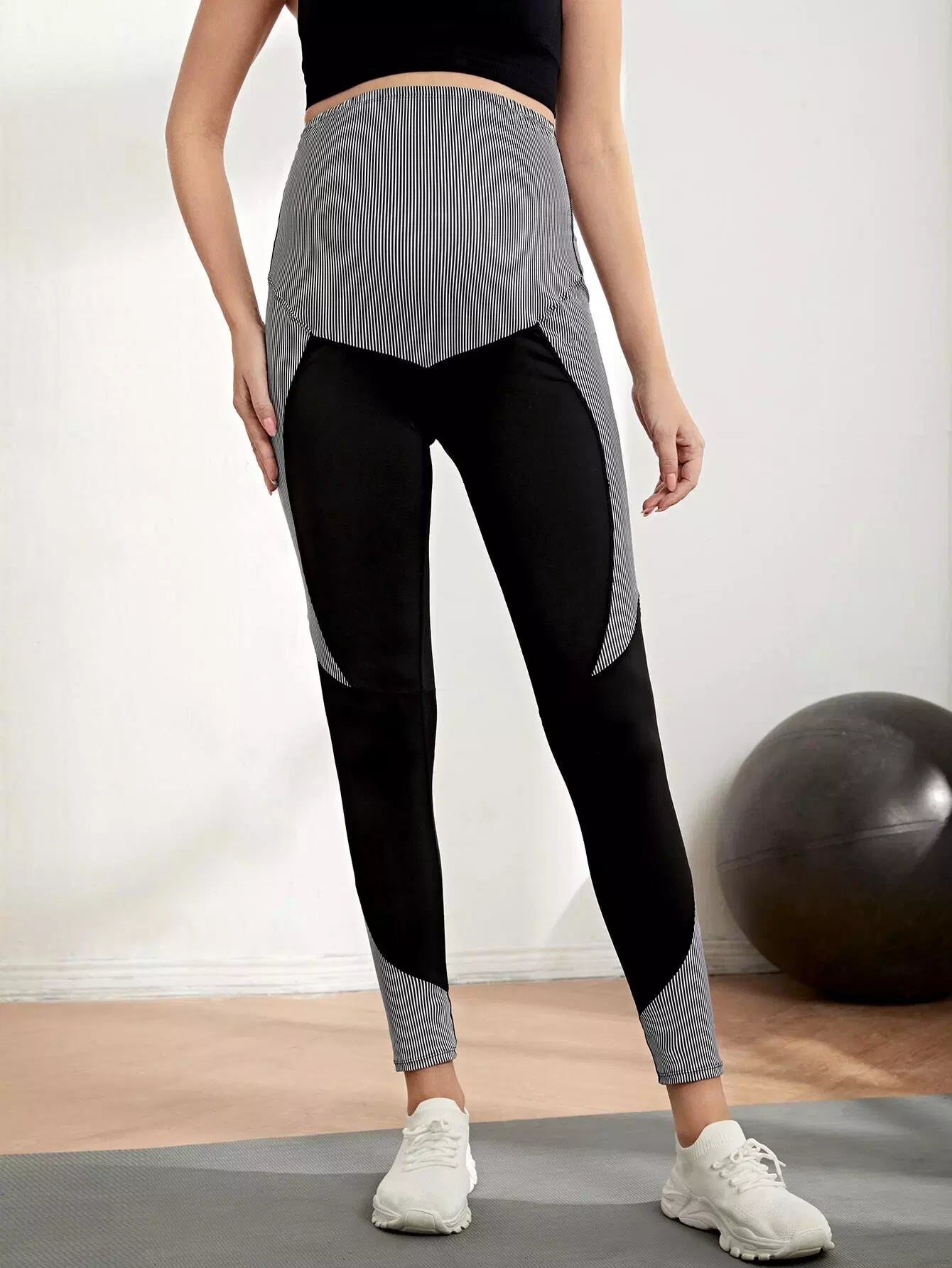 بنطلون ضيق مخطط عمودي للحوامل بخياطة علوية مخططة من الأعلى