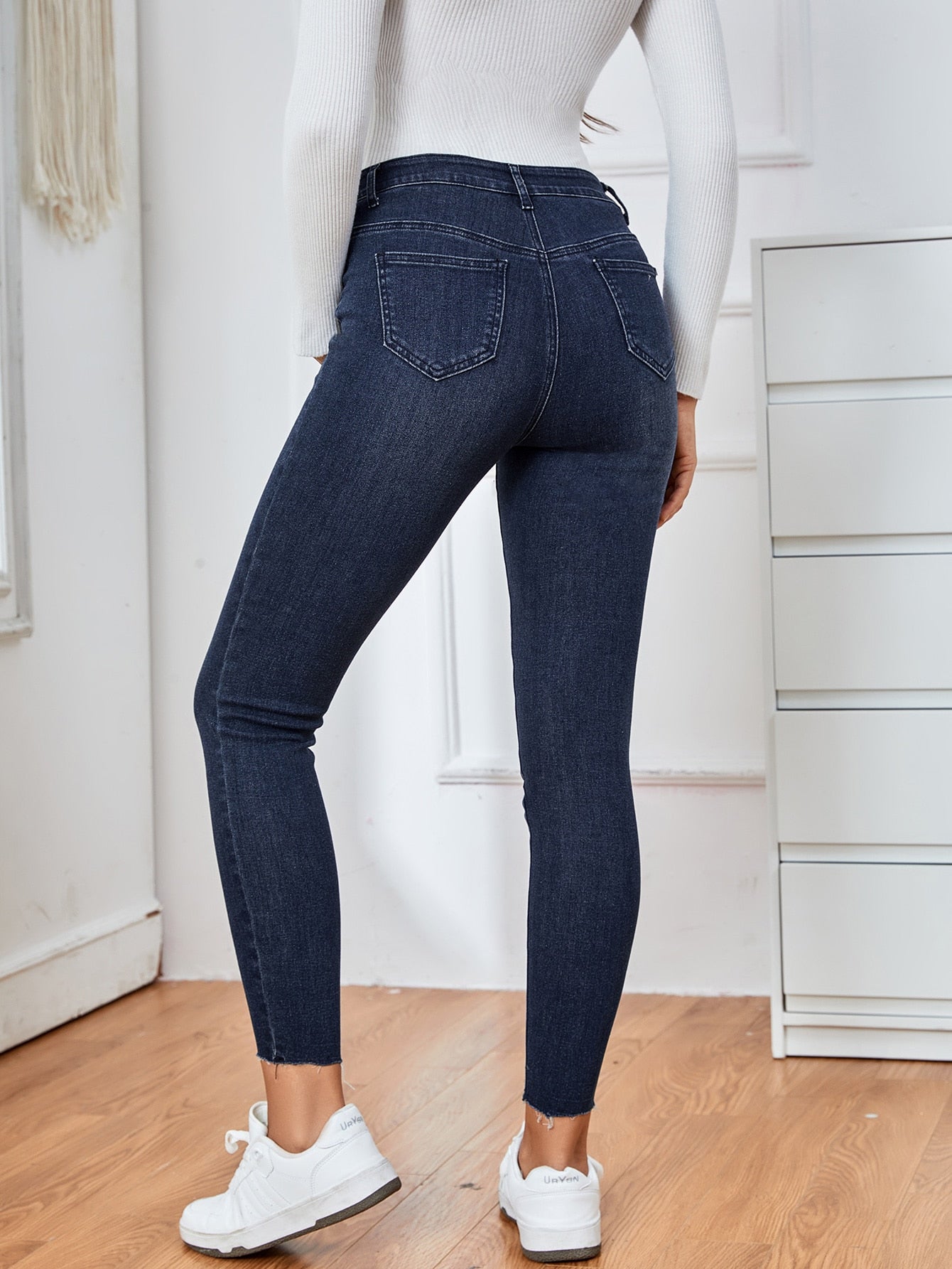 بنطلون جينز ضيق ذو خصر عريض وحافة مهترئة للأمومة