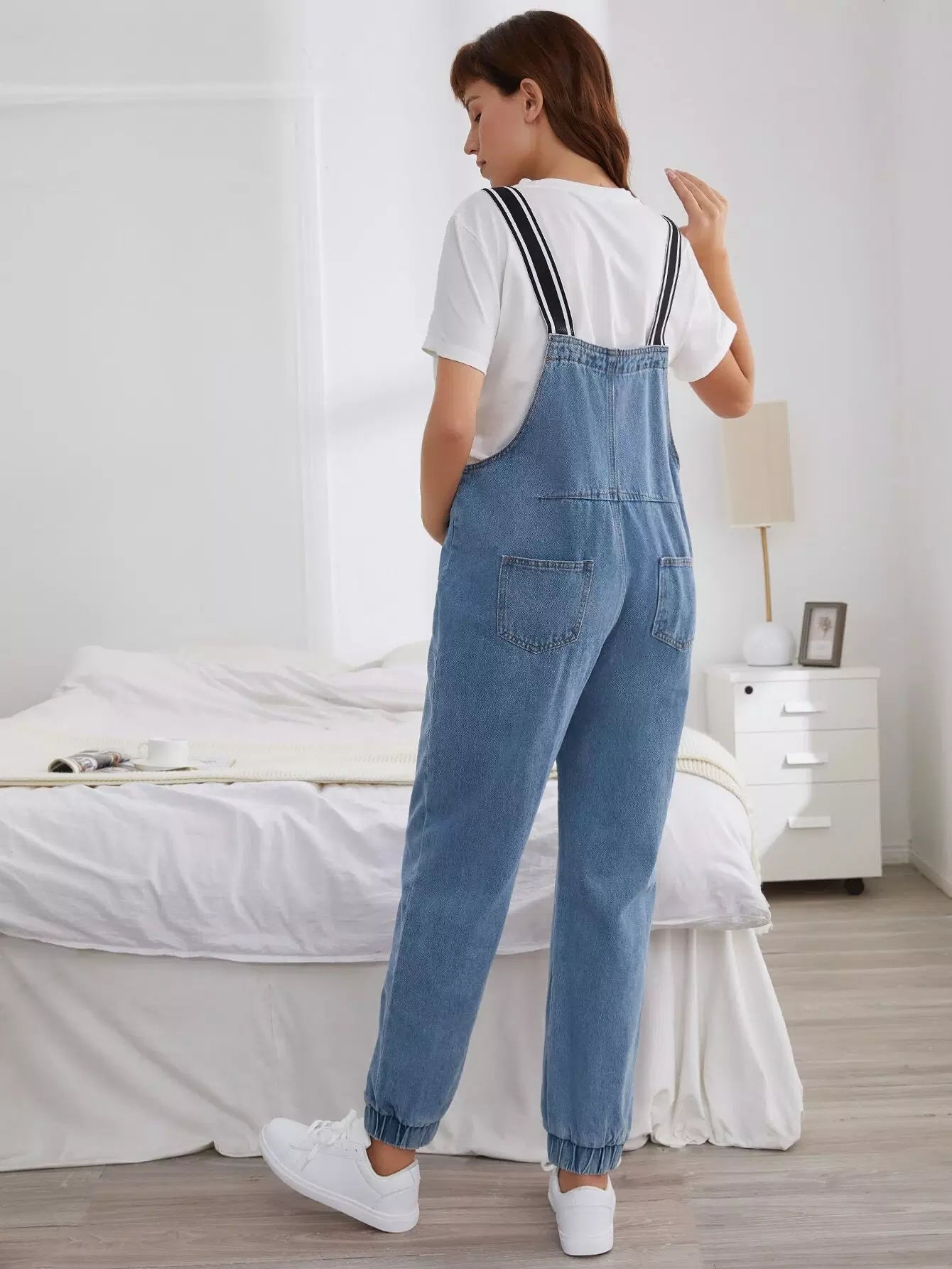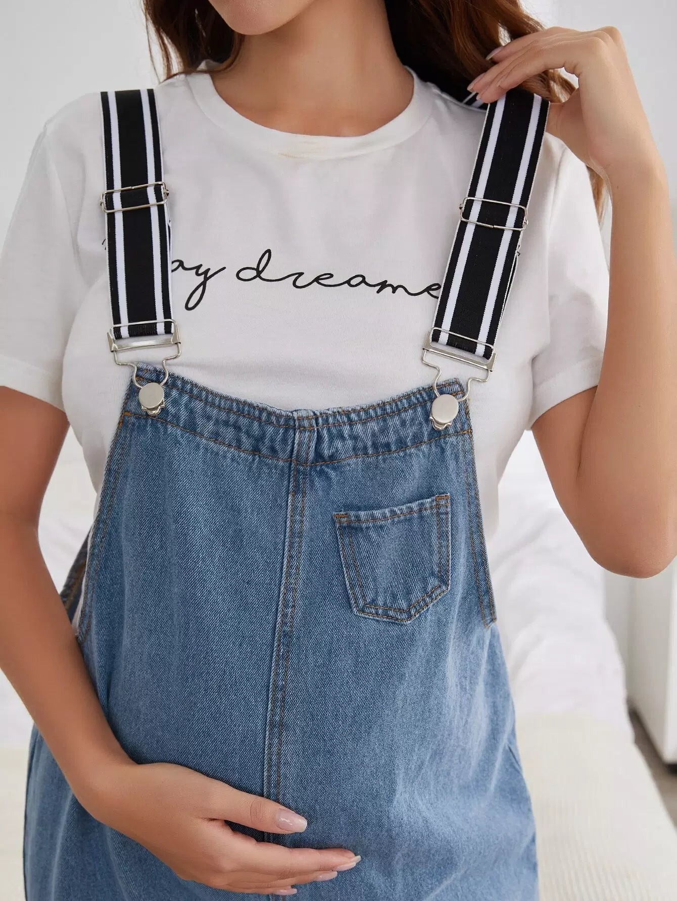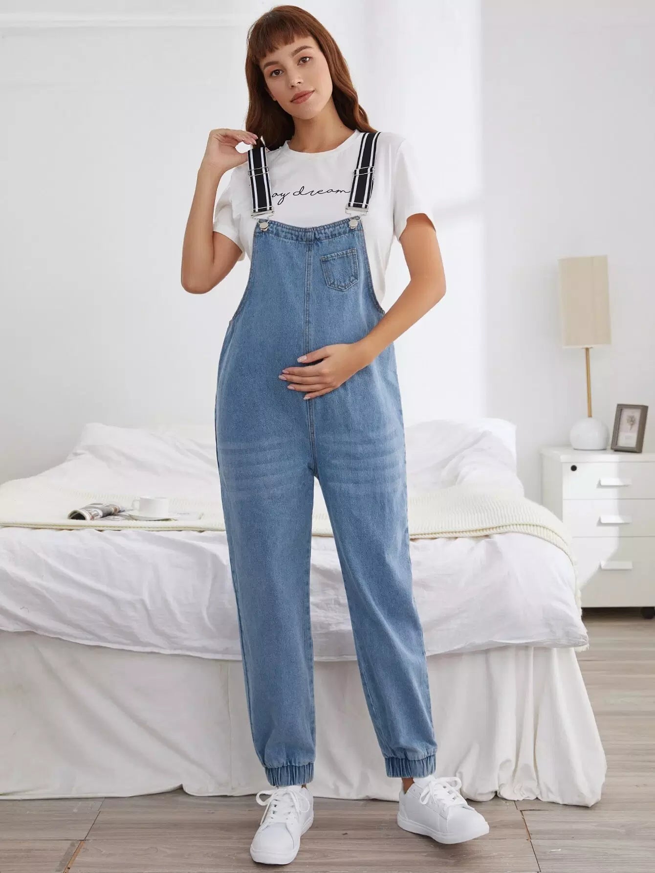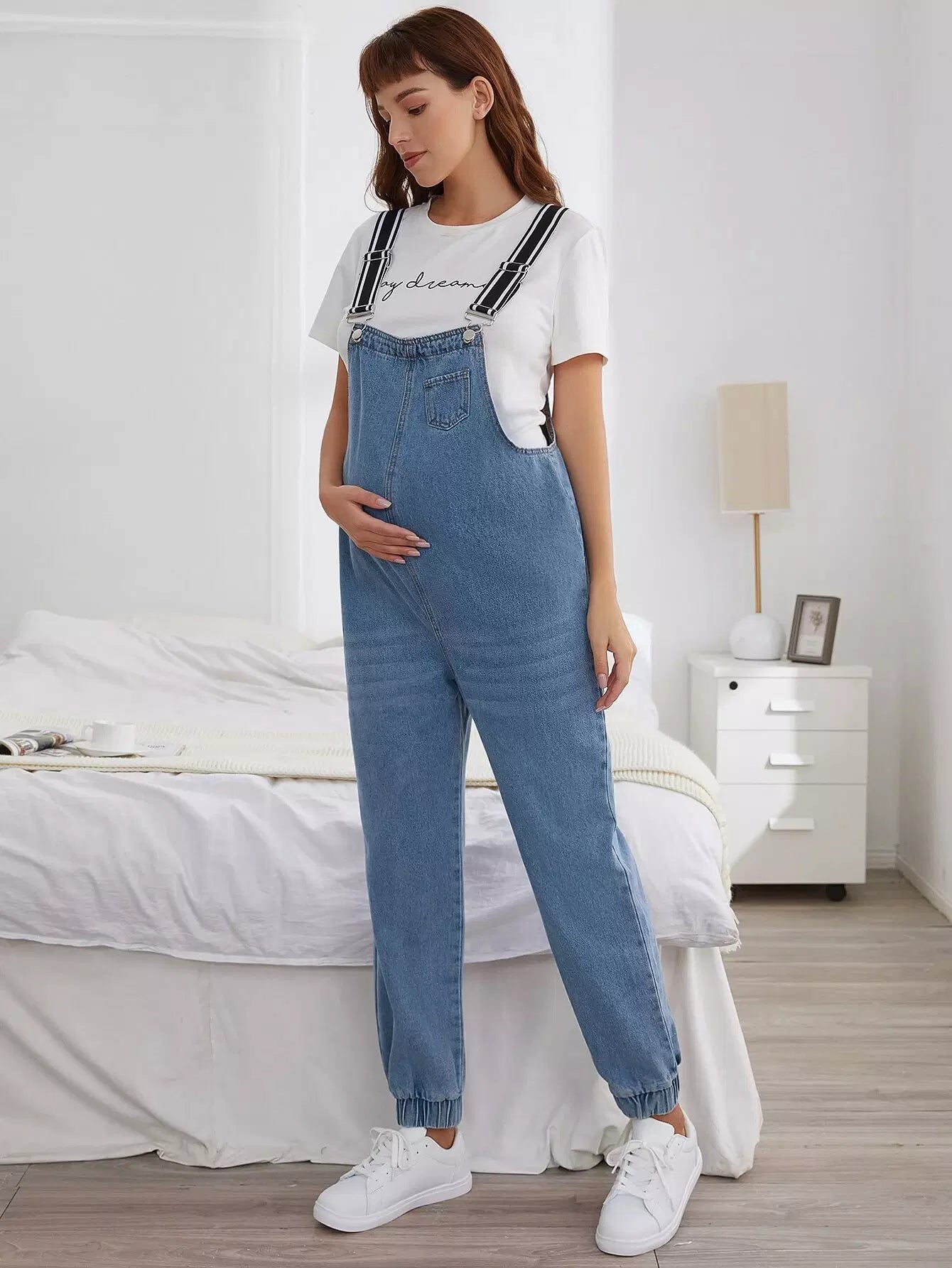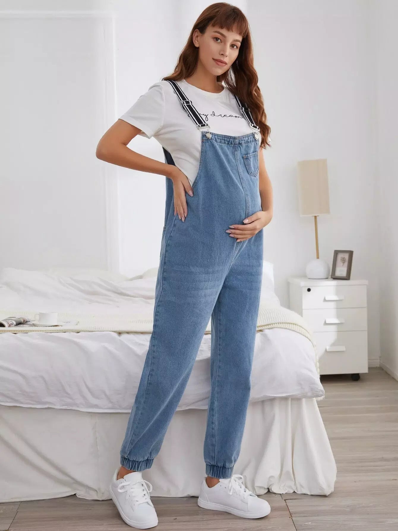 أفرول جينز للأمومة مزود بجيوب ورقعة بدون تي شيرت