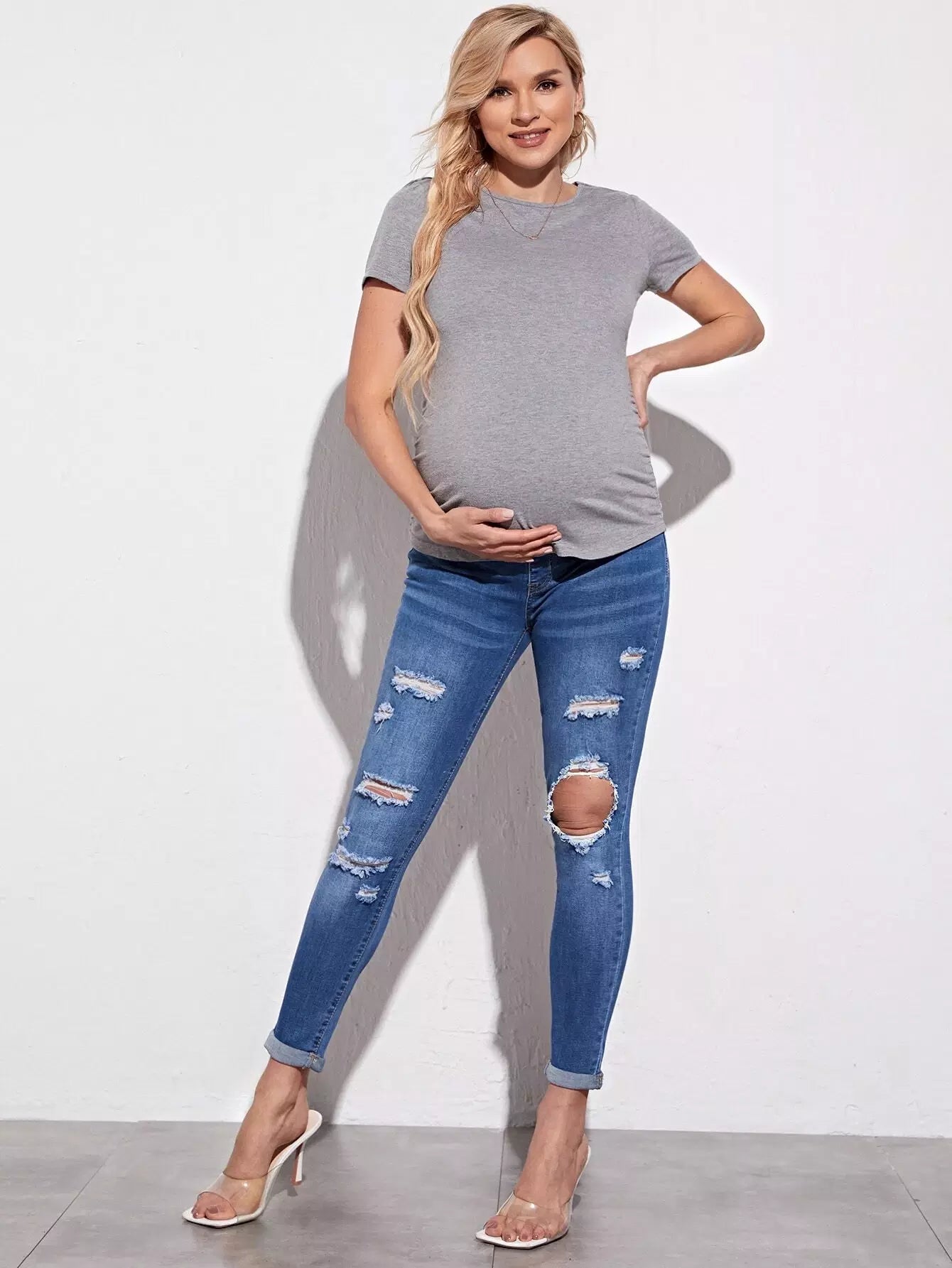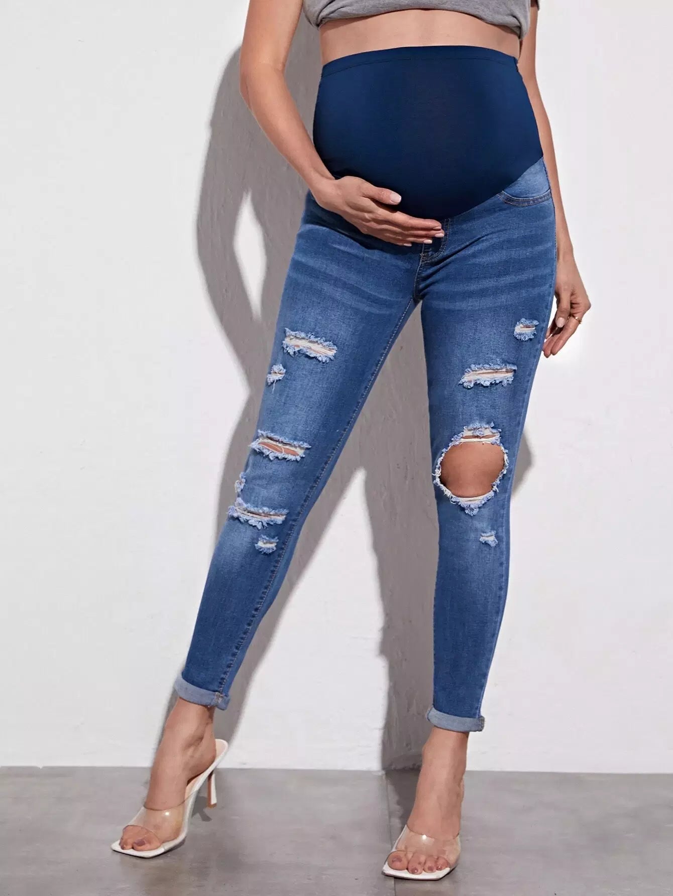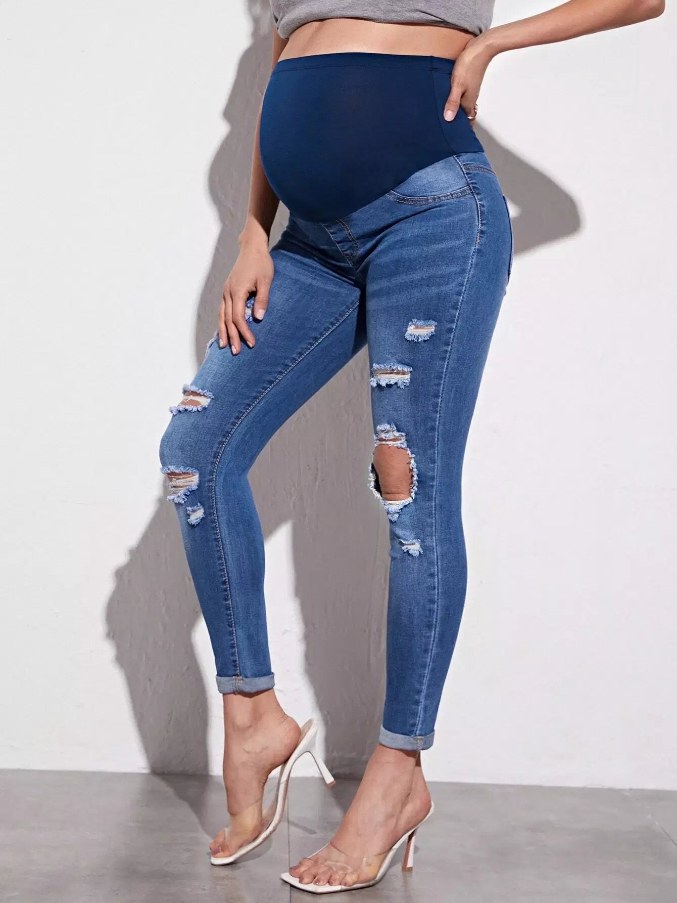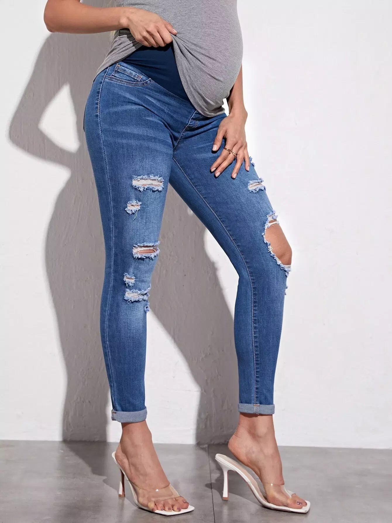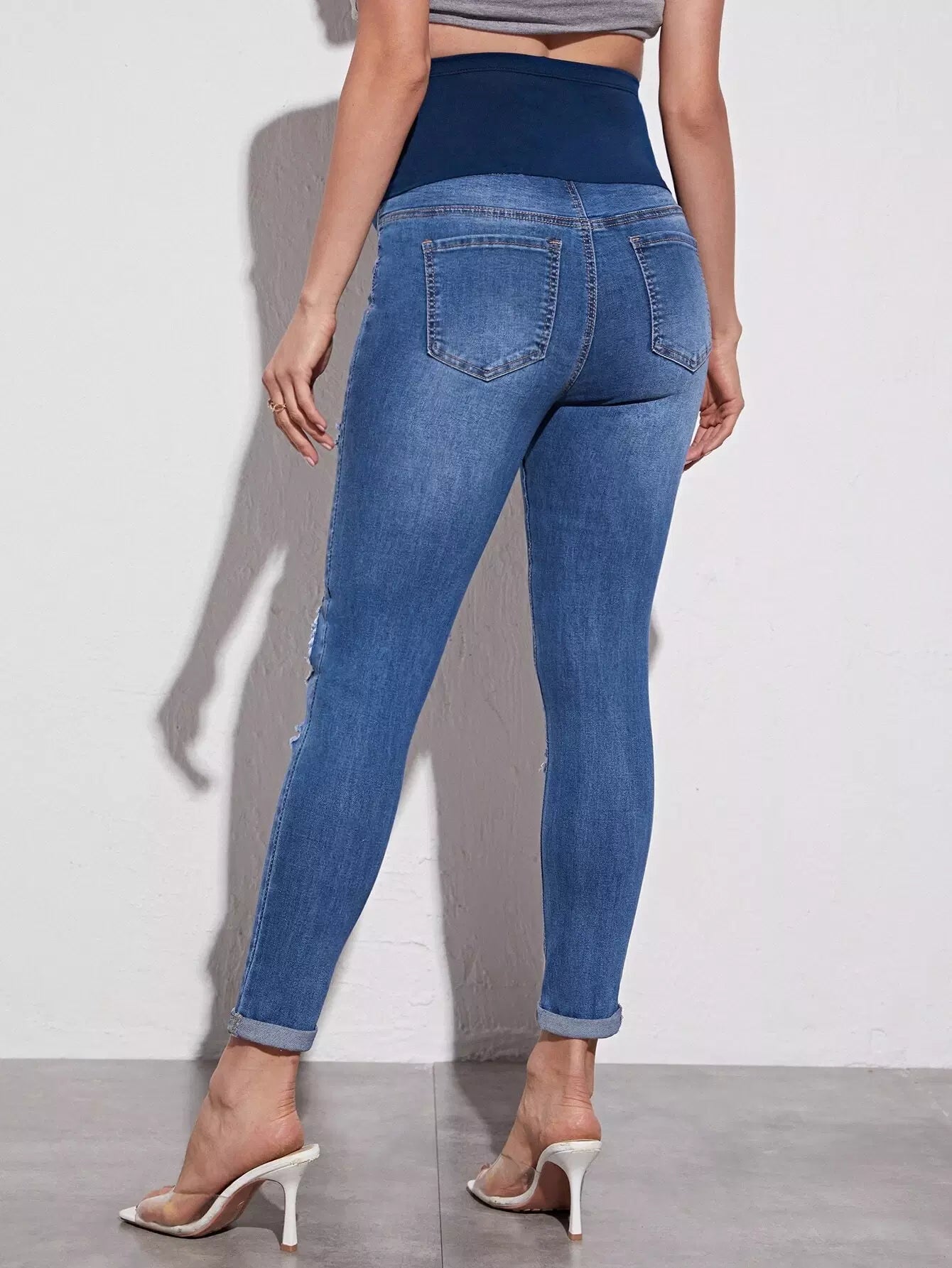 الأطفال - بنطال جينز ضيق ممزق وممزق عند الخصر للحوامل